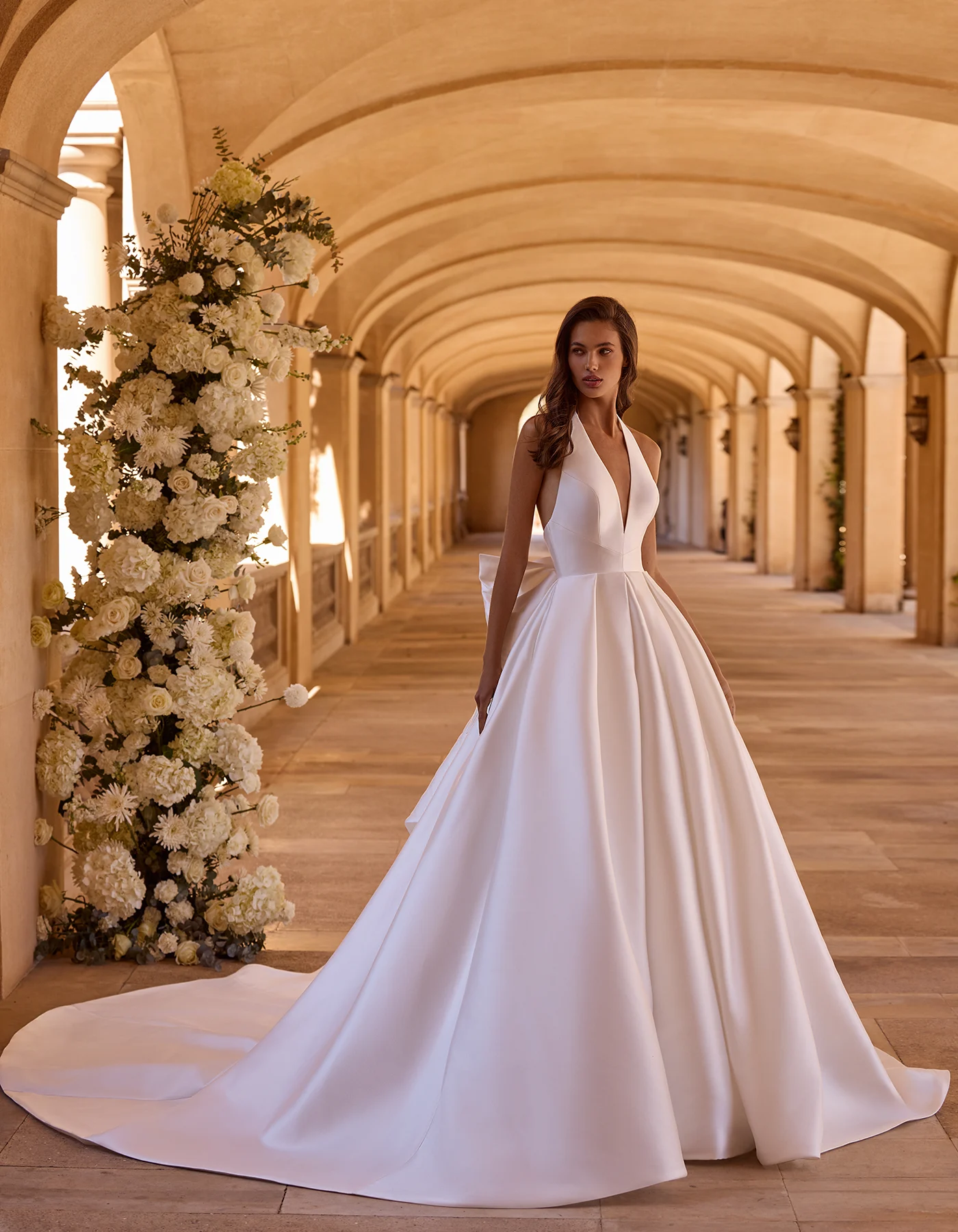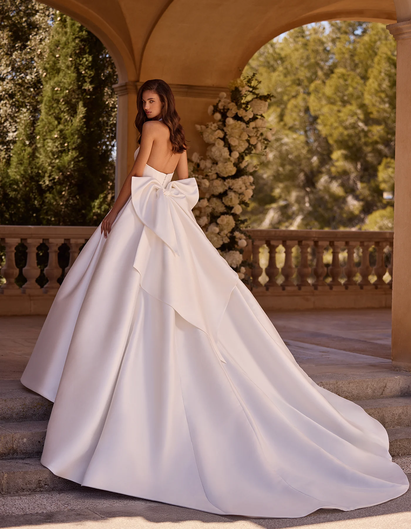 Princess-style wedding dress in mikado with a V-neckline and long train. It is complemented by a large detachable mikado bow that creates a double-look effect.