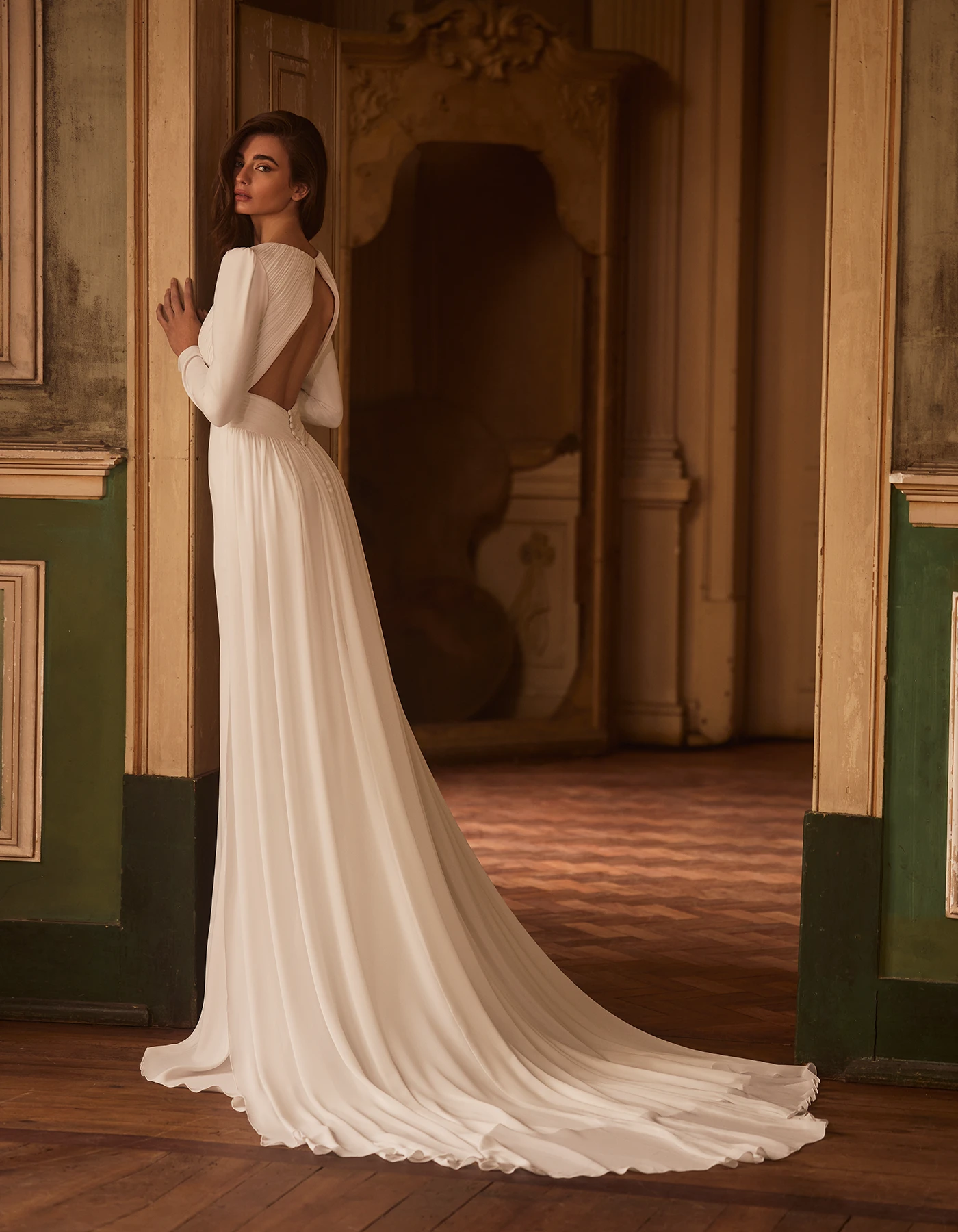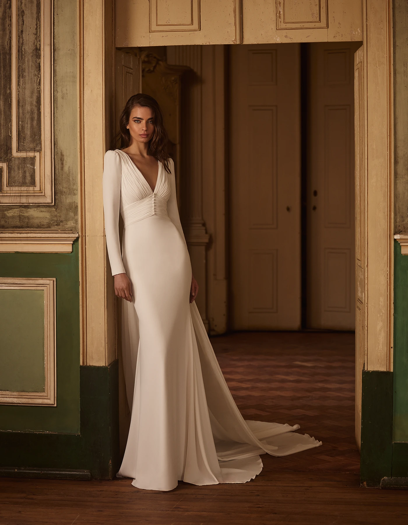 Simple mermaid wedding dress made entirely of crepe and silky chiffon. It features a V-neckline and micro-draping on the bodice and waist. It has a detachable chiffon overskirt, creating a double look effect.