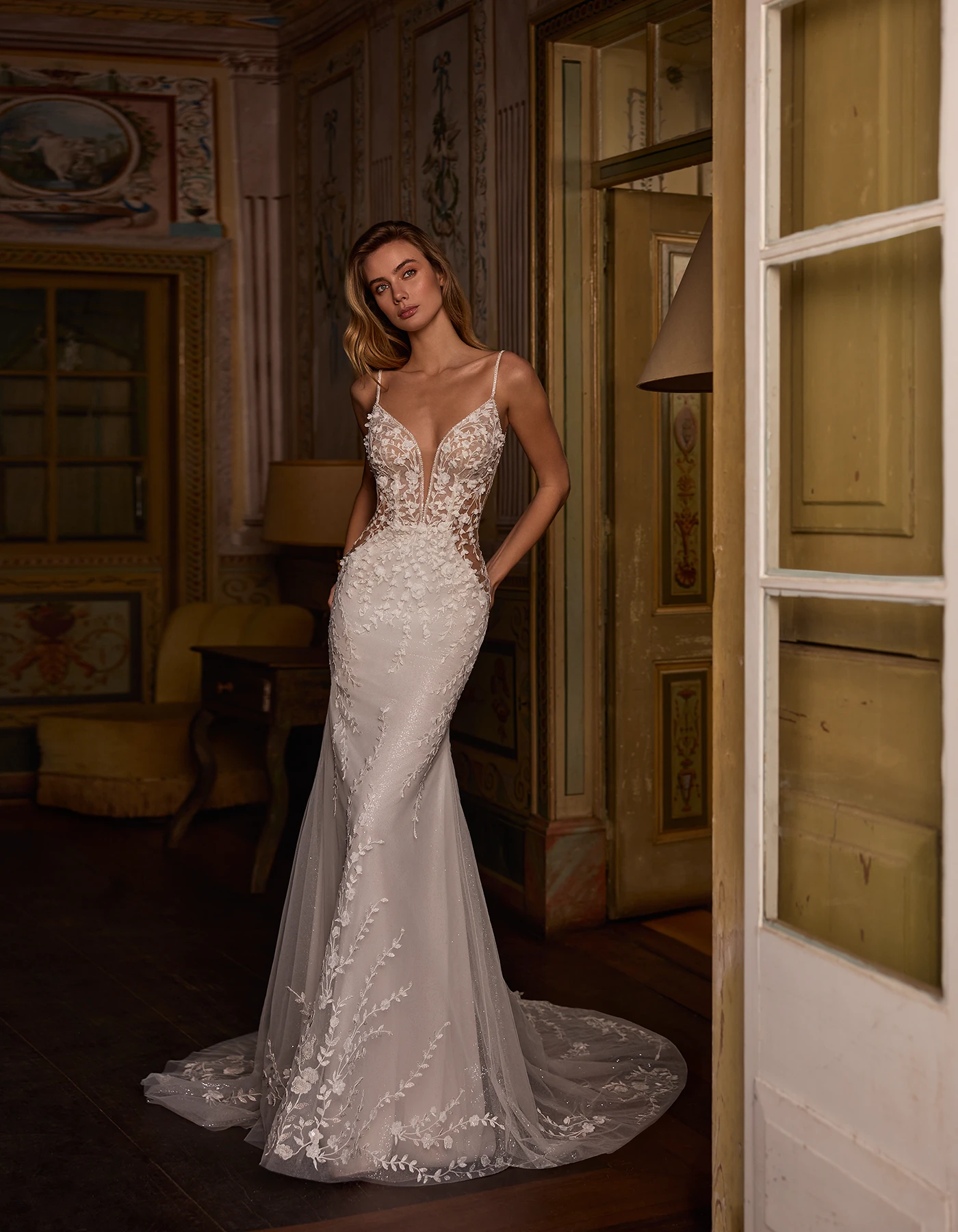 Romantic mermaid wedding dress with a V-neckline made entirely of tulle, with delicate floral lace and beadwork appliqués.