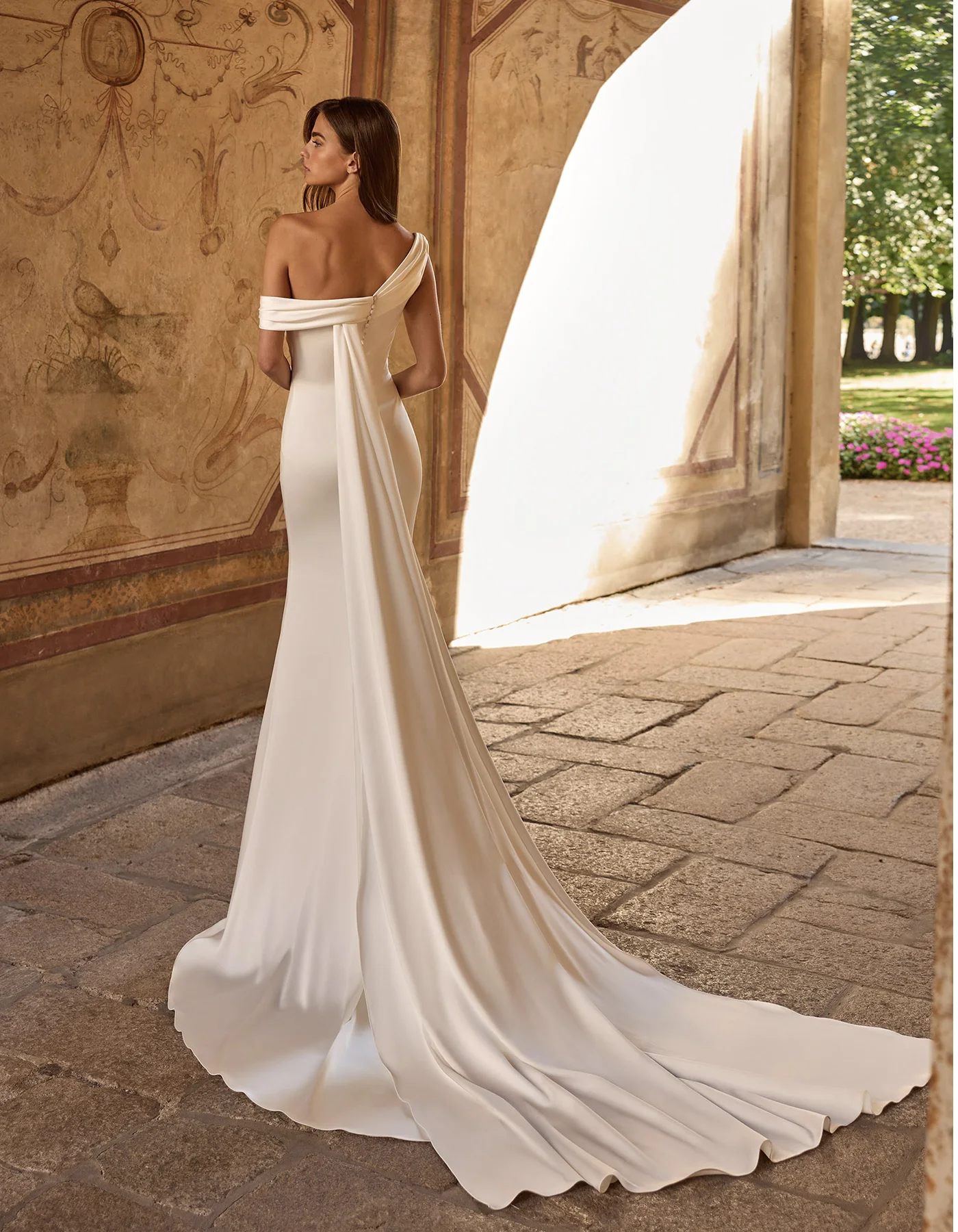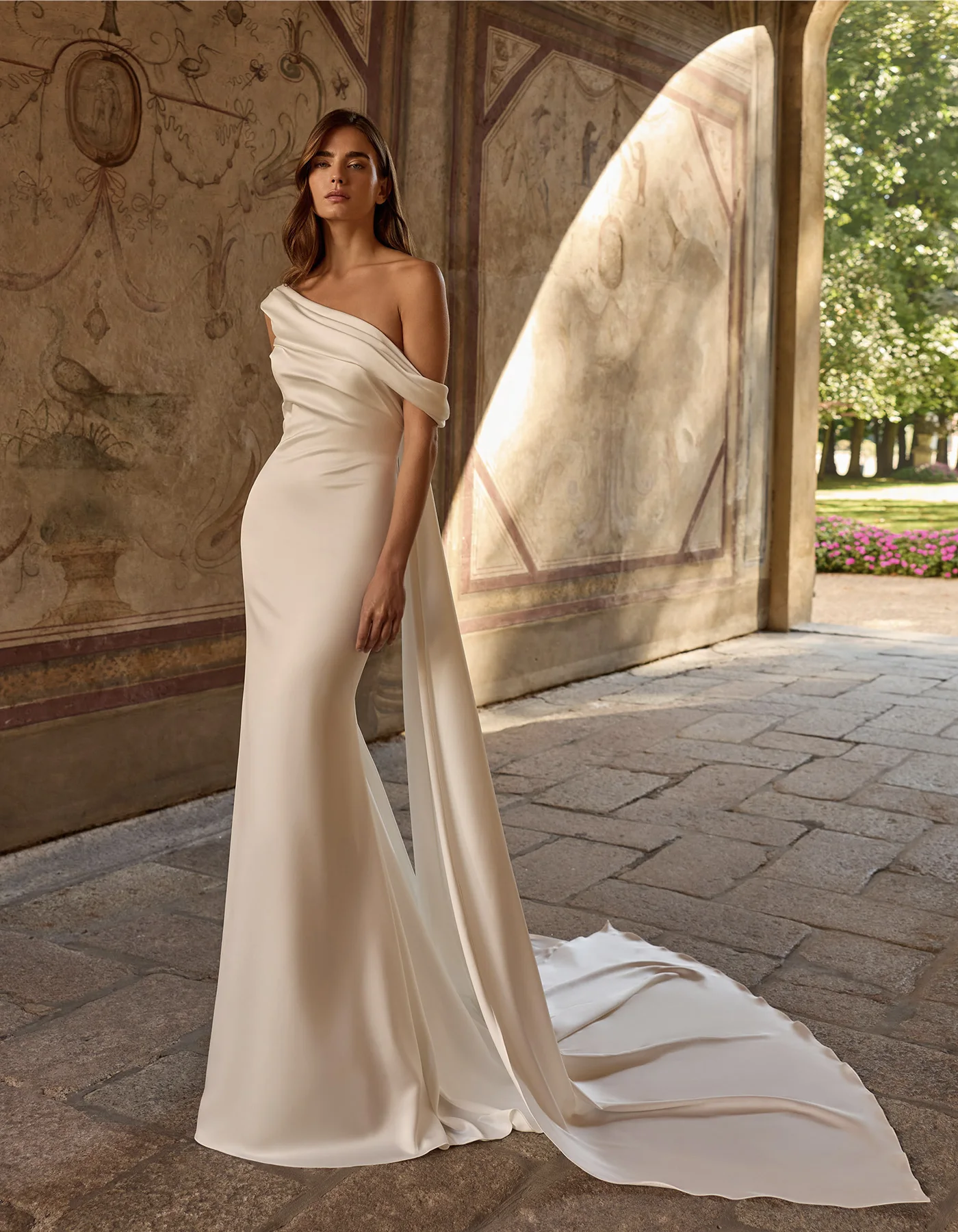 Modern mermaid wedding dress crafted entirely in satin, featuring an asymmetric neckline with draped detail. A satin train flows from the shoulder, creating a striking double-train effect.