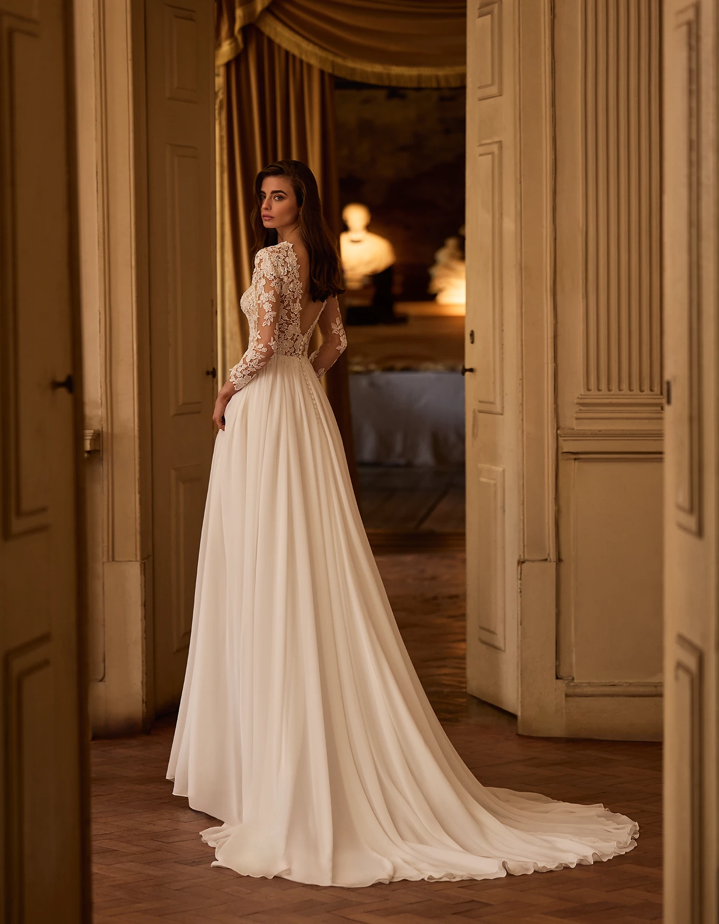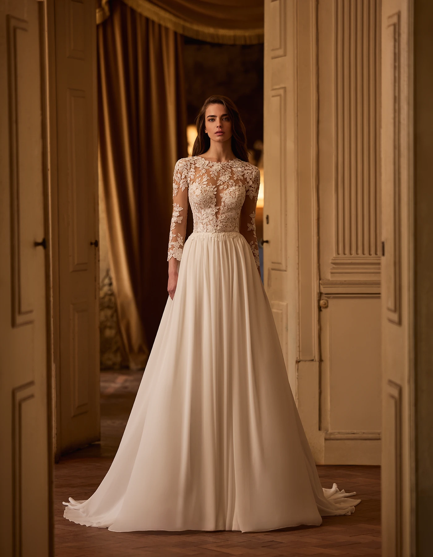 Classic A-line wedding dress combining a round neck bodice and V-back, made with delicate lace appliqués on a silky chiffon skirt