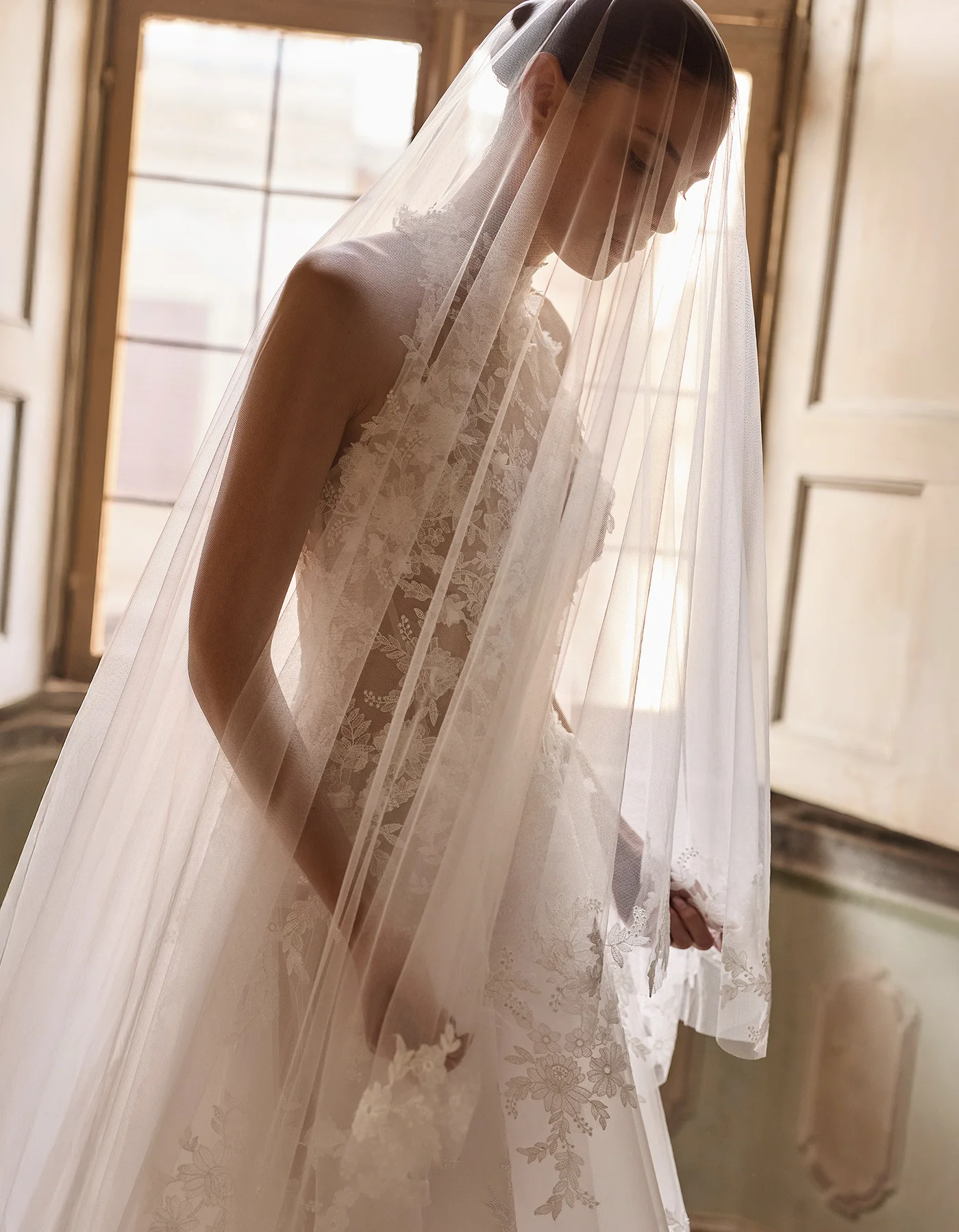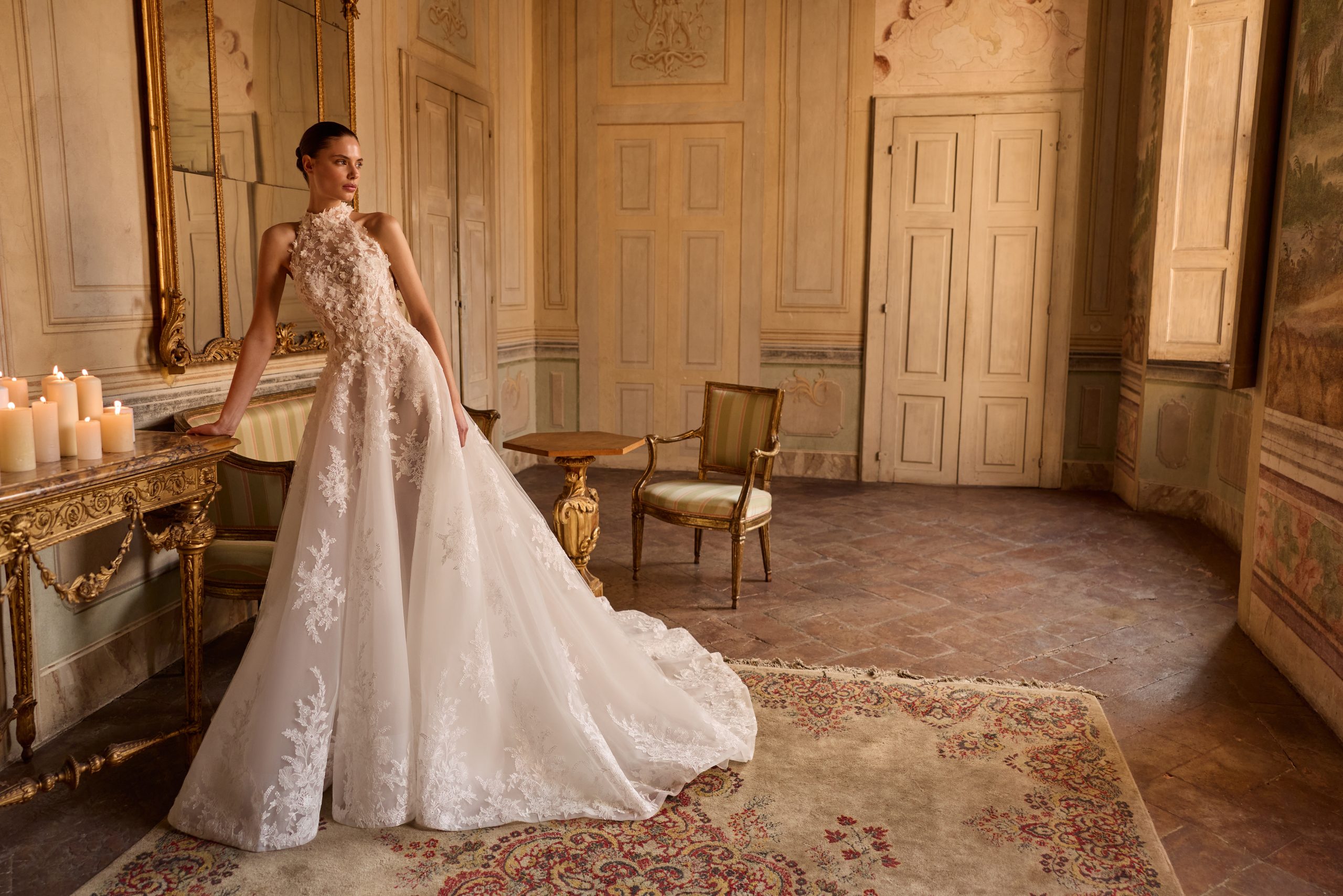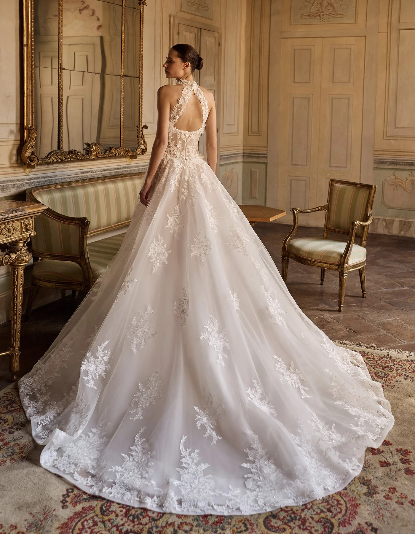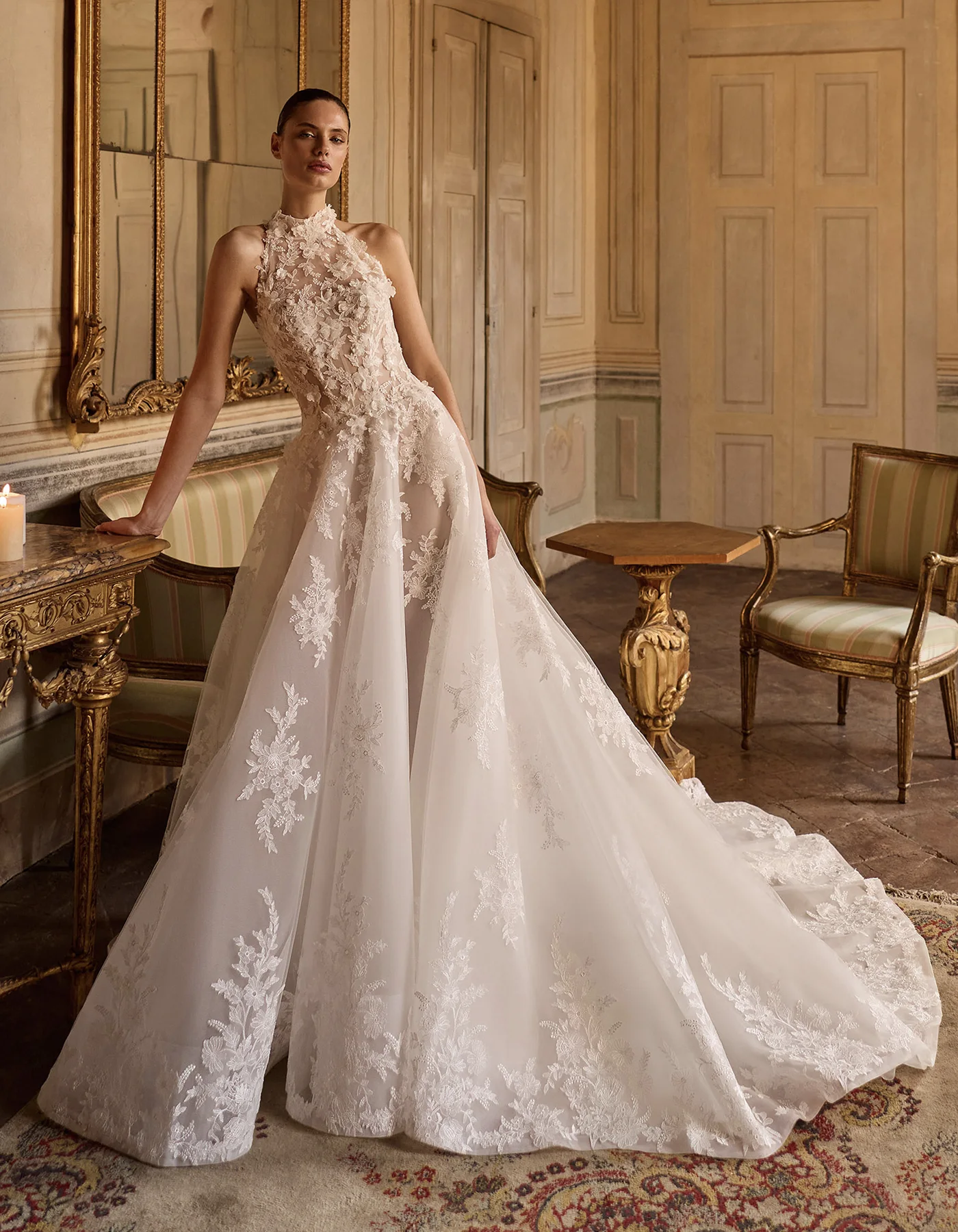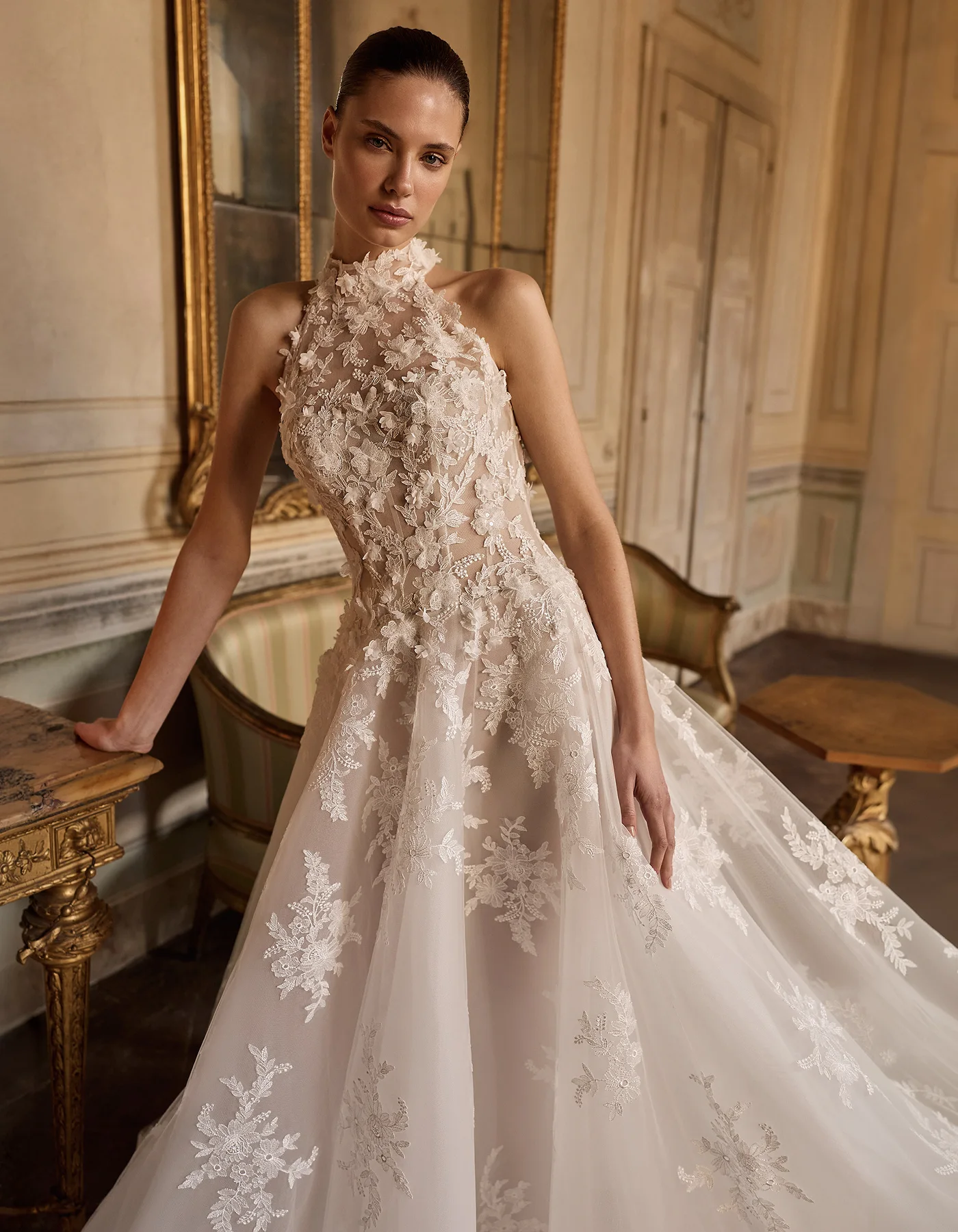 Romantic and modern princess wedding dress from the Couture Collection, crafted entirely in beaded embroidered tulle. It features a halter-neck corset bodice with 3D floral embroidery and a deep open back, paired with a voluminous skirt. A tulle veil with embroidered lace at the hem completes the look.