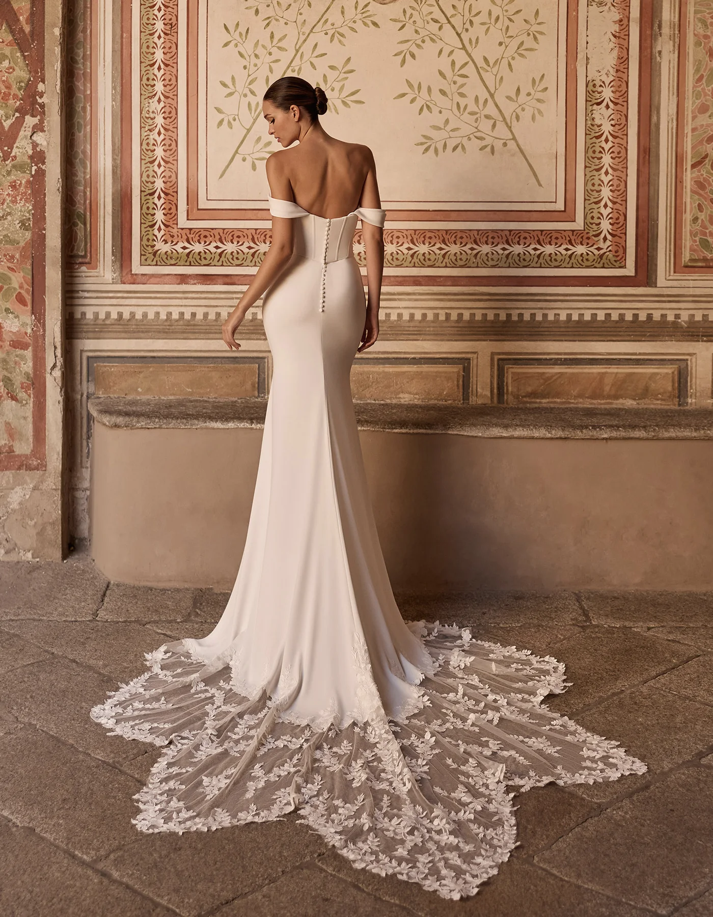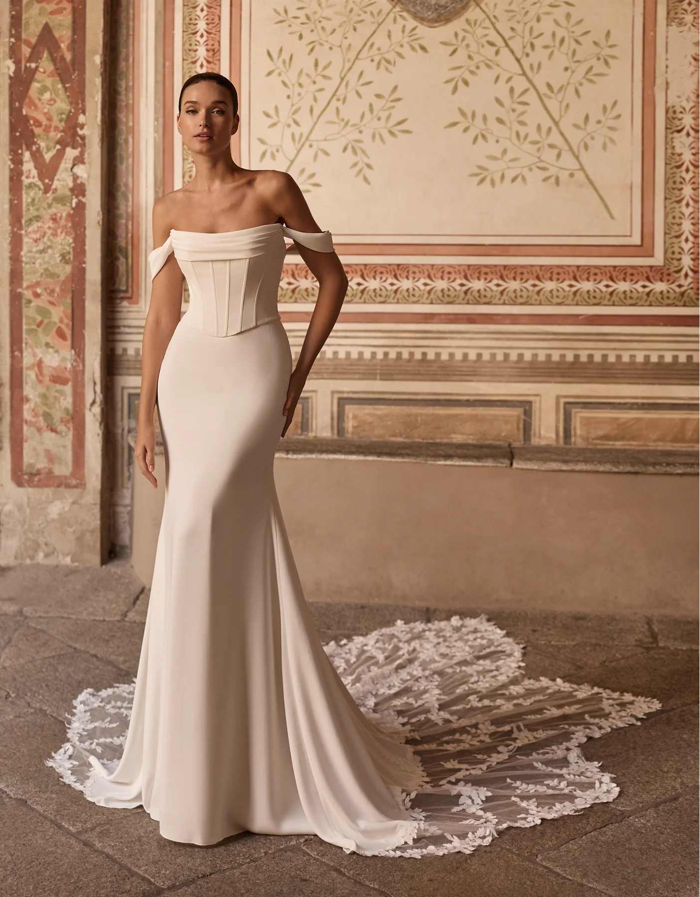 Modern mermaid wedding dress featuring a two-piece effect with a structured corset bodice with draped detail and a crepe mermaid skirt with embroidered lace appliqués at the hem in a clover shape. Removable sleeve cuffs complete the look.