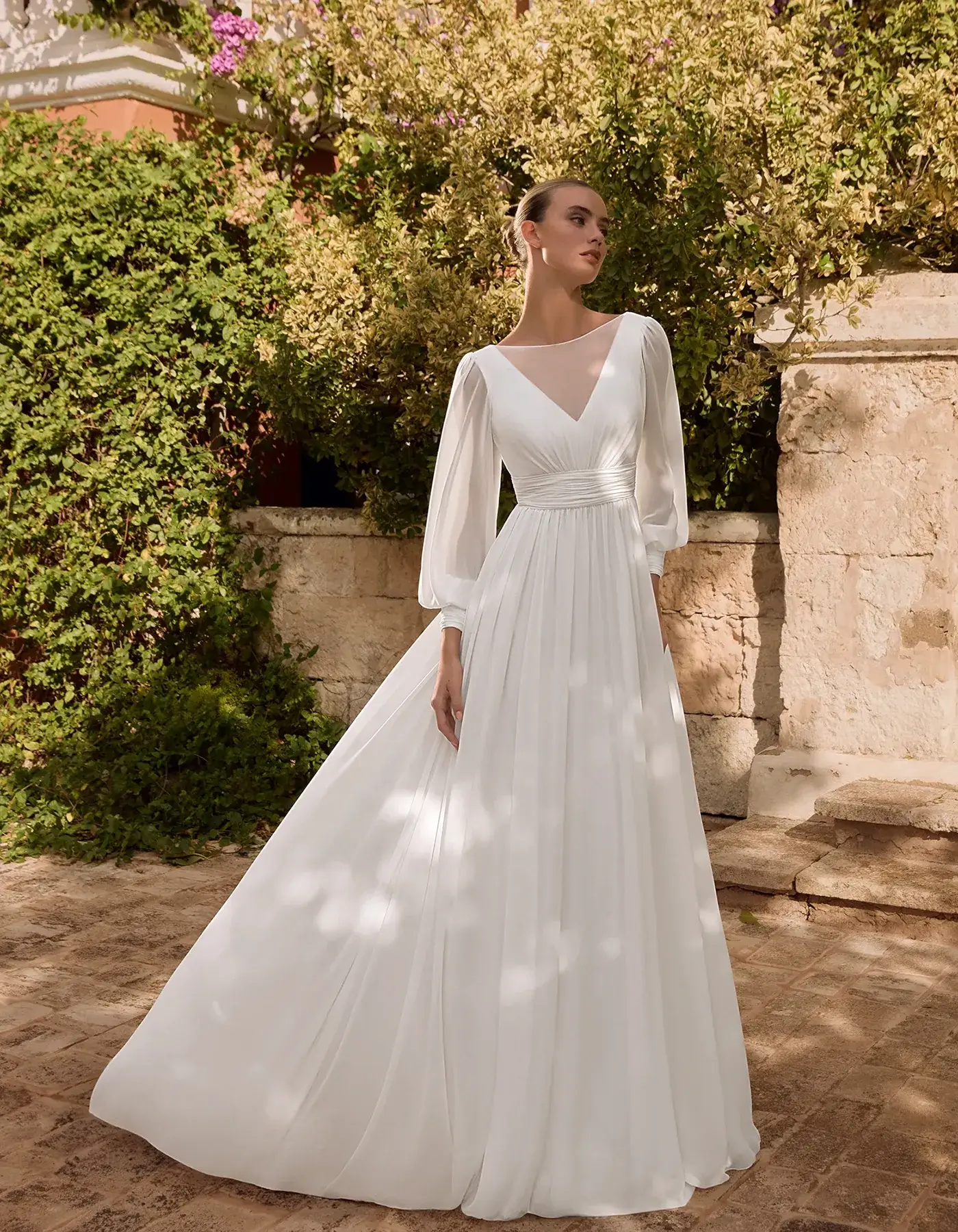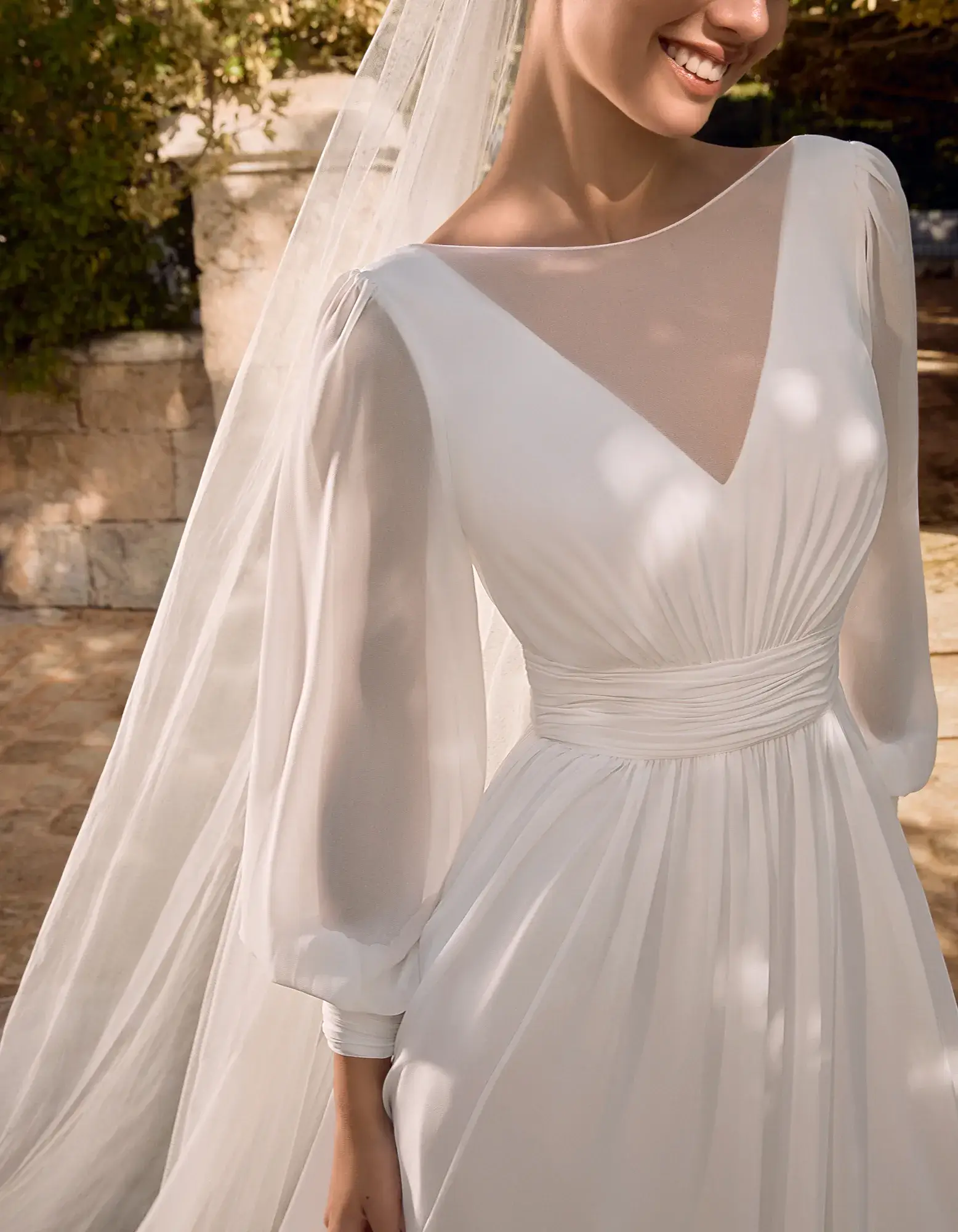 Robe trapèze de style simple entièrement en mousseline soyeuse. Il présente des manches longues bouffantes et des détails microdrapés à la taille et aux poignets.