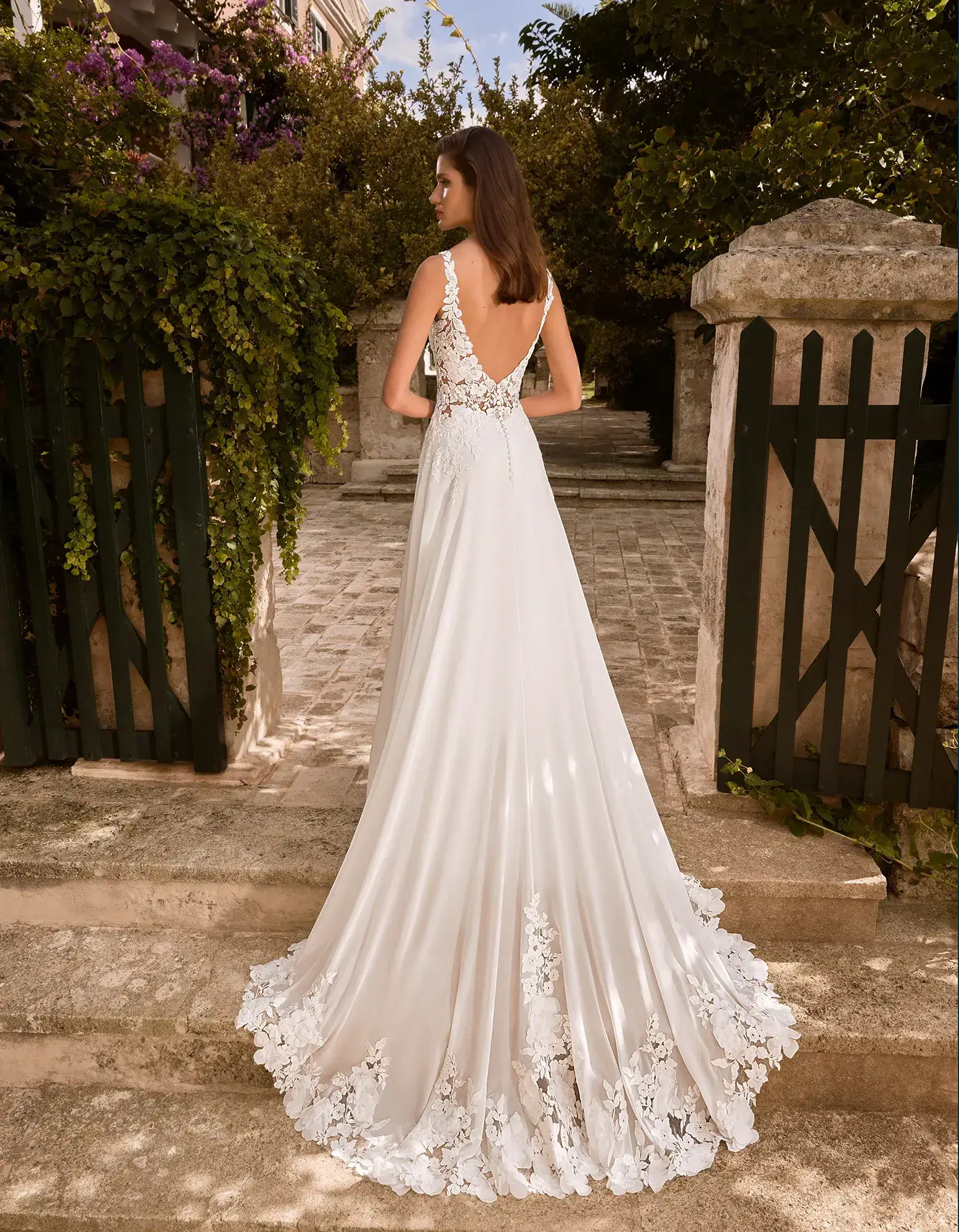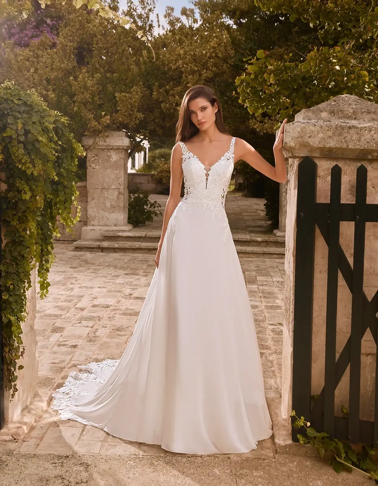 Robe trapèze de style romantique qui combine un corsage en forme de V réalisé avec de délicates applications de dentelle sur une jupe en mousseline soyeuse avec une traîne en dentelle.
