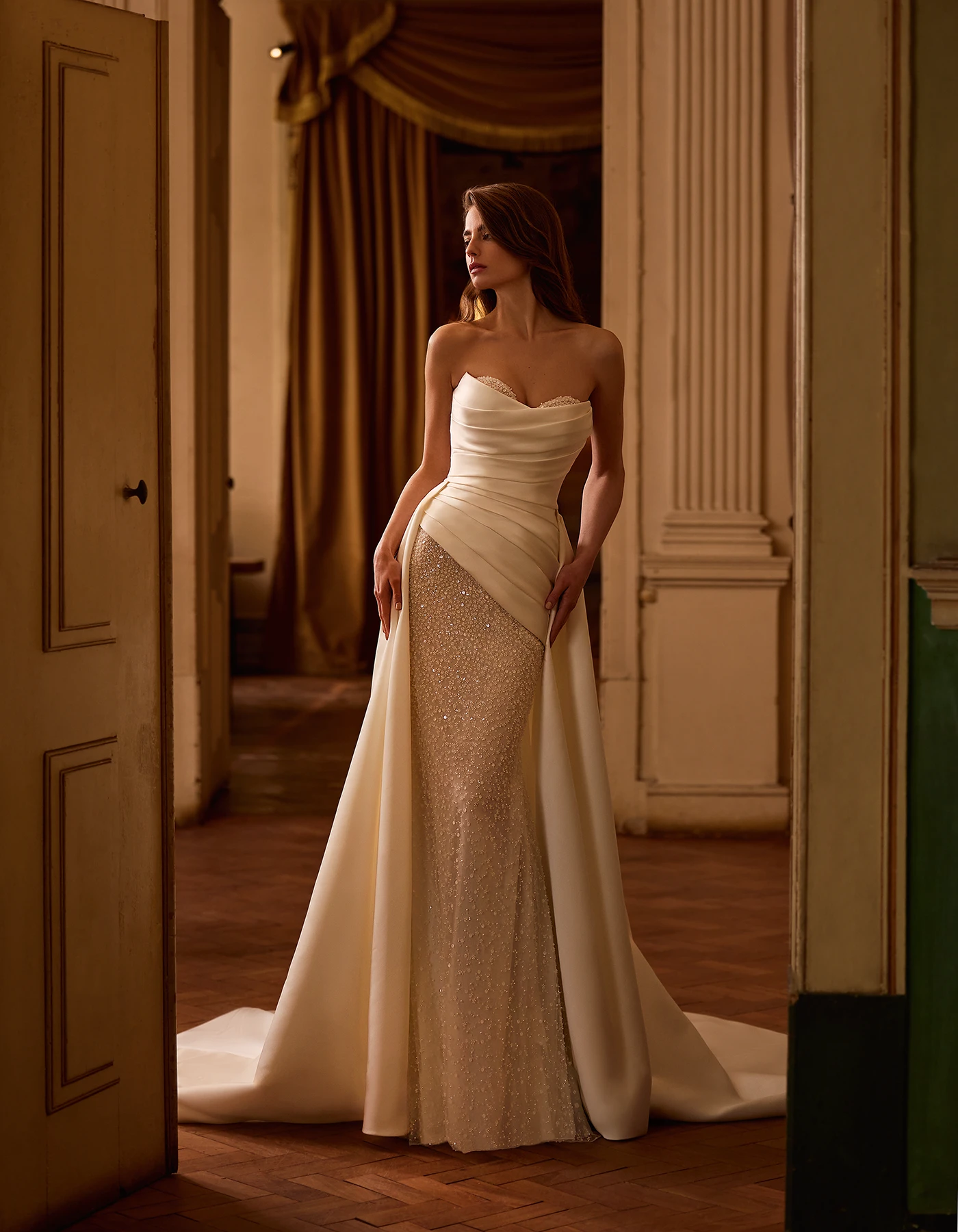 Robe de mariée sirène moderne, entièrement réalisée en perles. Elle est complétée par un corset drapé avec une surjupe en satin amovible, créant un effet double look.
