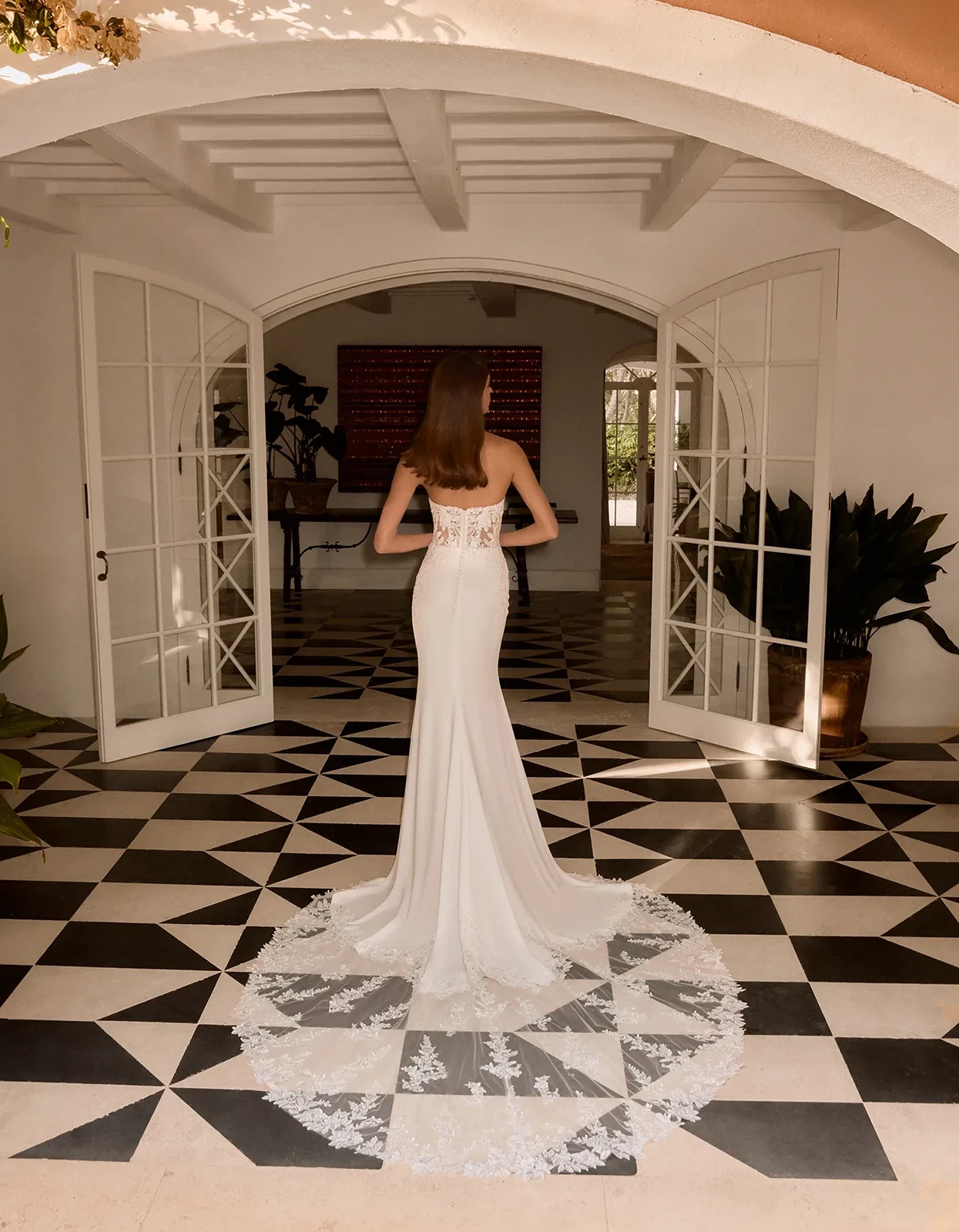 Robe sirène de style moderne avec un corsage corset réalisé avec des appliqués de dentelle florale sur une jupe en crêpe avec une traîne en dentelle. Il est complété par une veste amovible qui donne un effet double look.