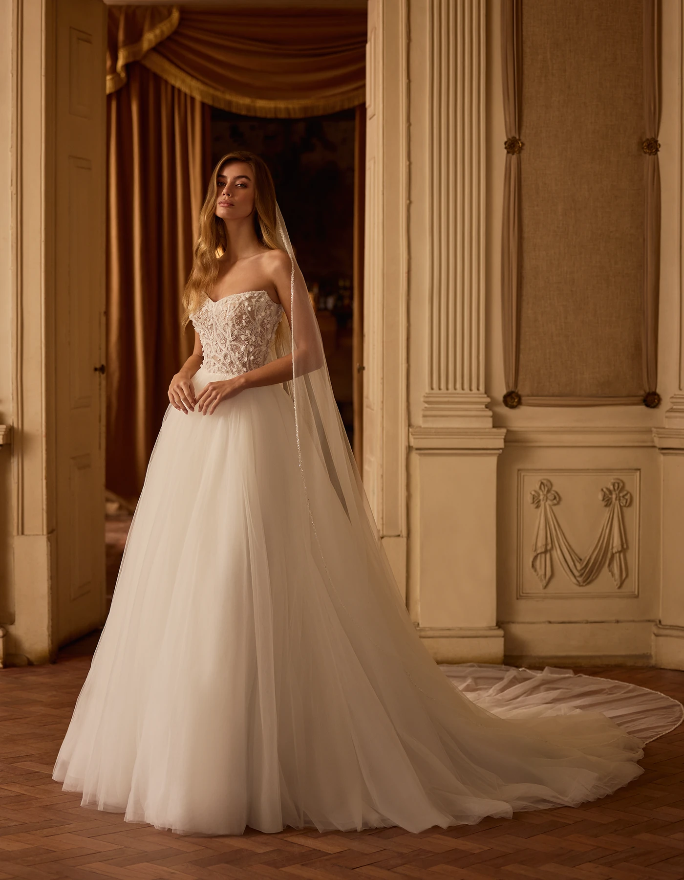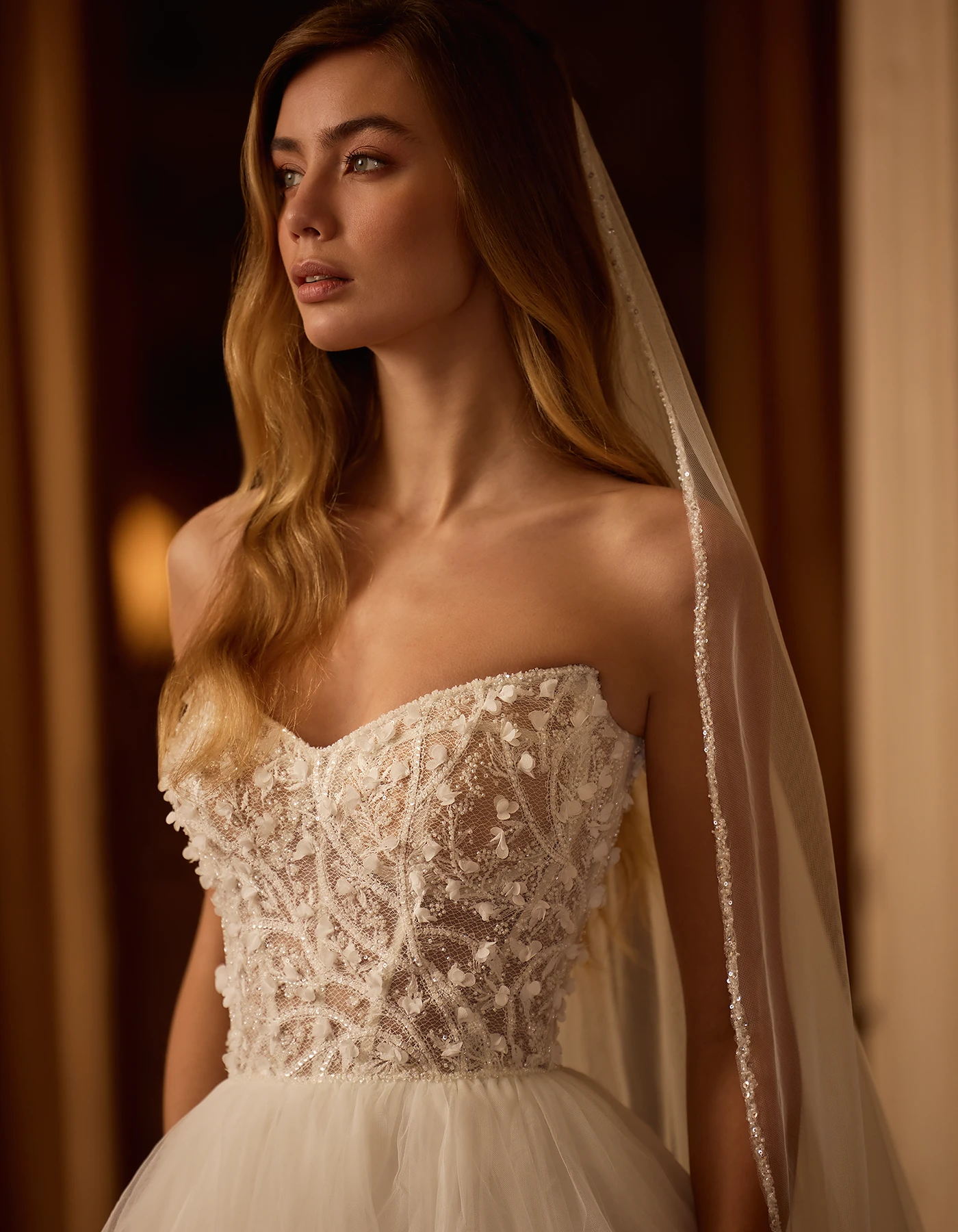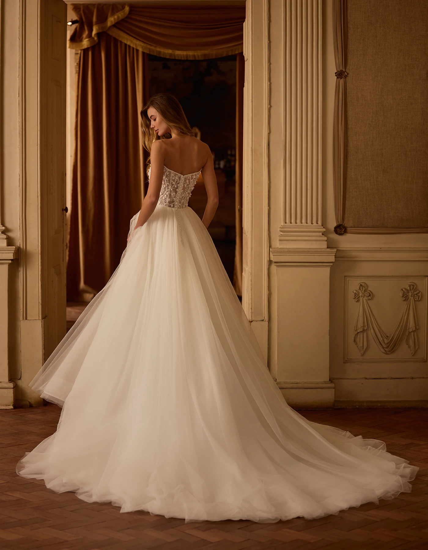 Robe de mariée style princesse au style moderne et romantique, alliant un corset structuré orné de délicates applications de dentelle et de fleurs 3D, à une jupe volumineuse en tulle.