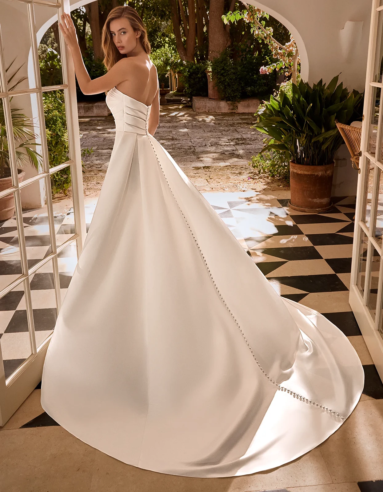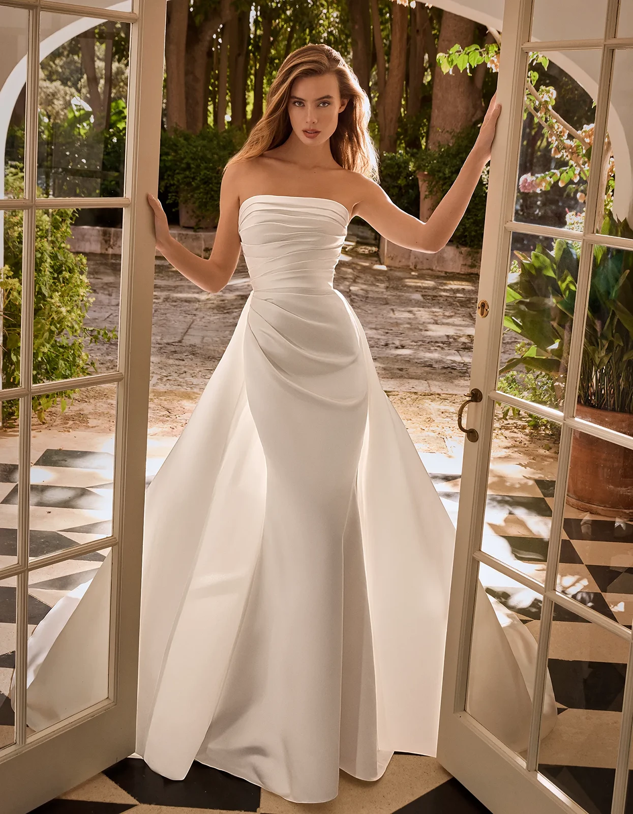 Robe sirène de style simple entièrement en satin qui combine un corsage drapé et une traîne amovible.