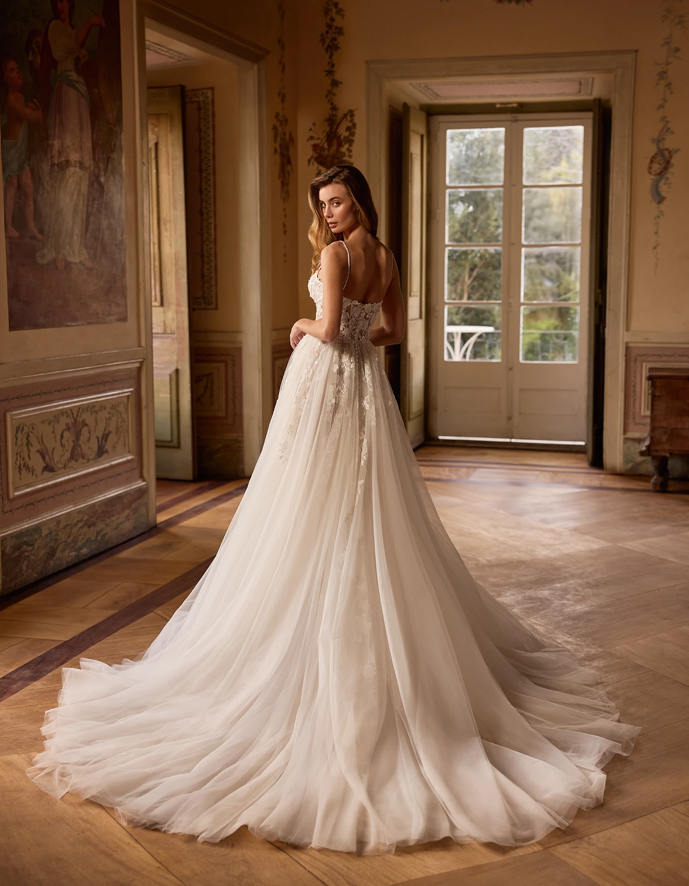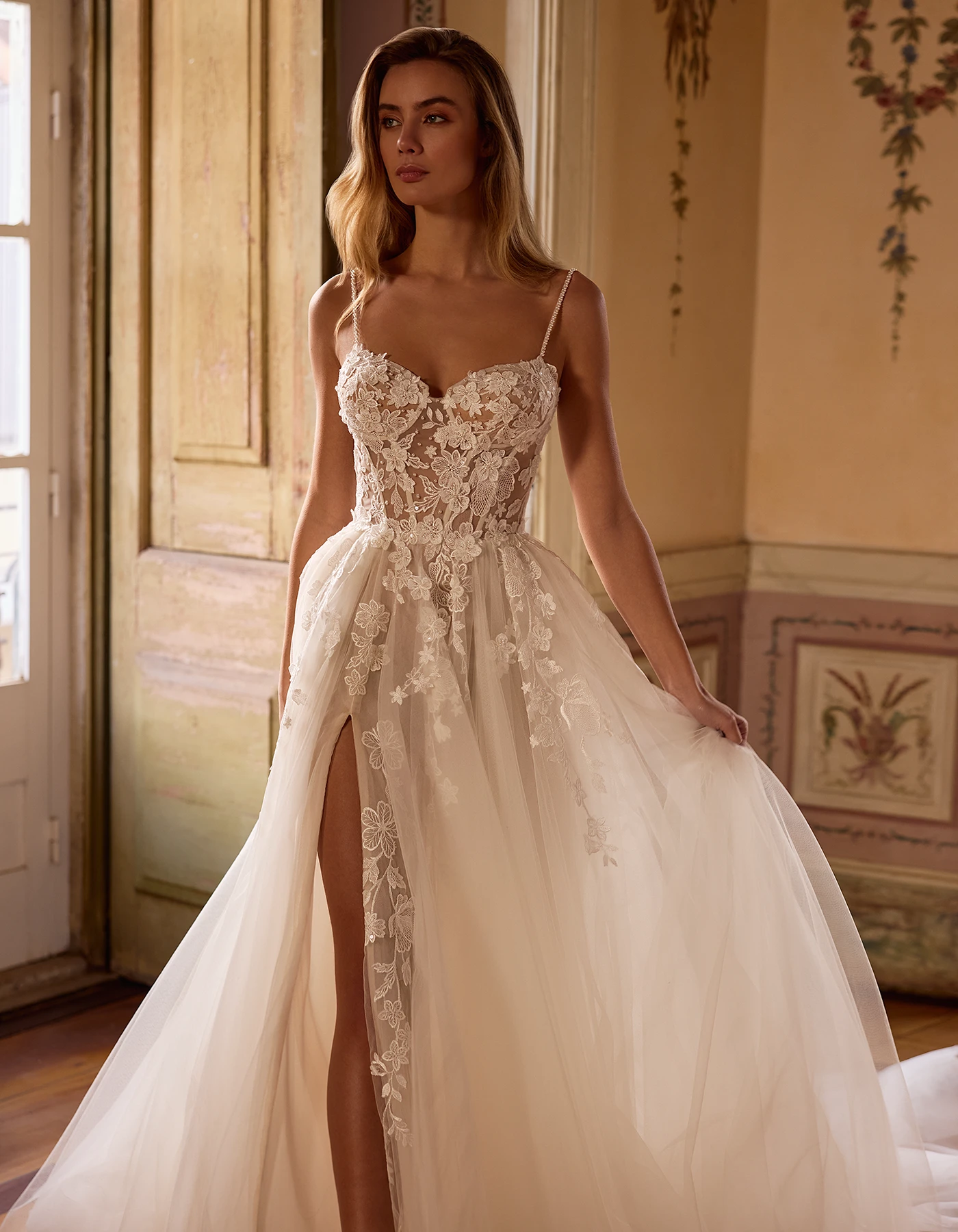 Robe de mariée coupe princesse romantique, associant un corset structuré orné de délicates applications de dentelle florale à une jupe en tulle fendue.