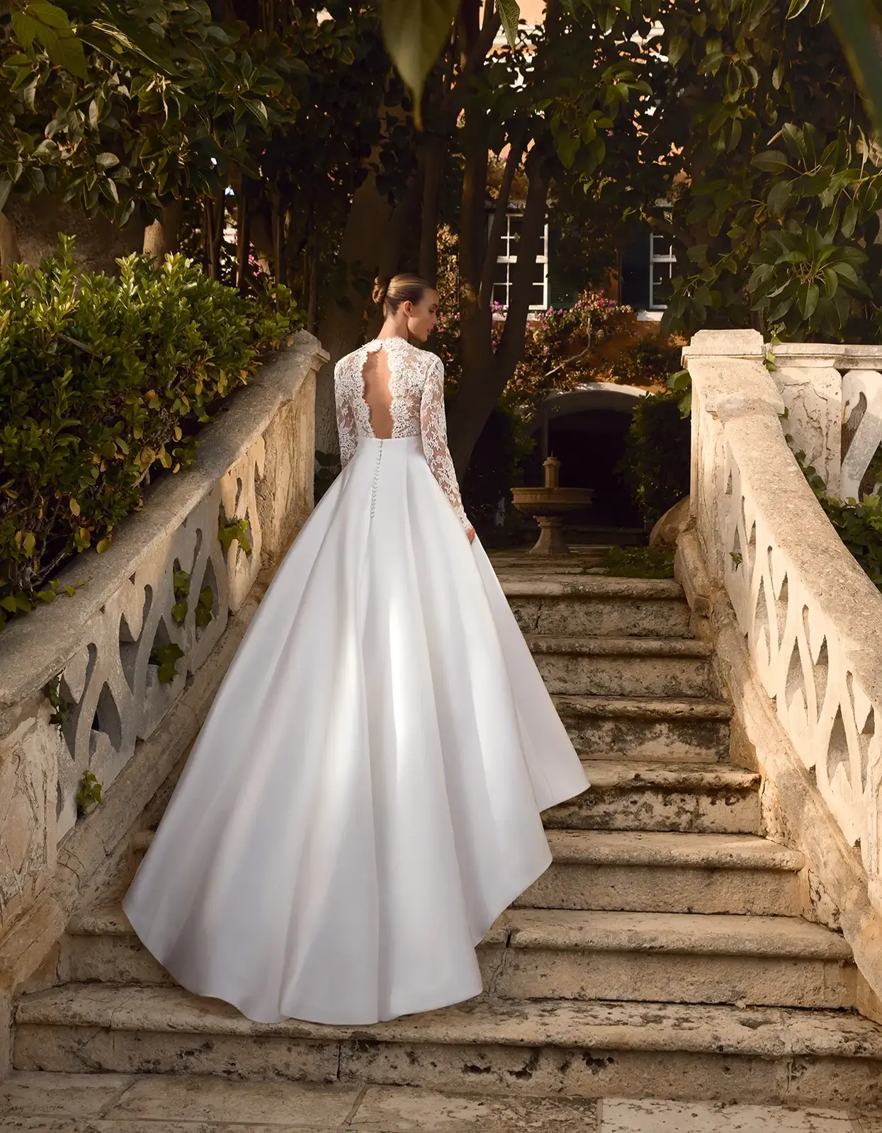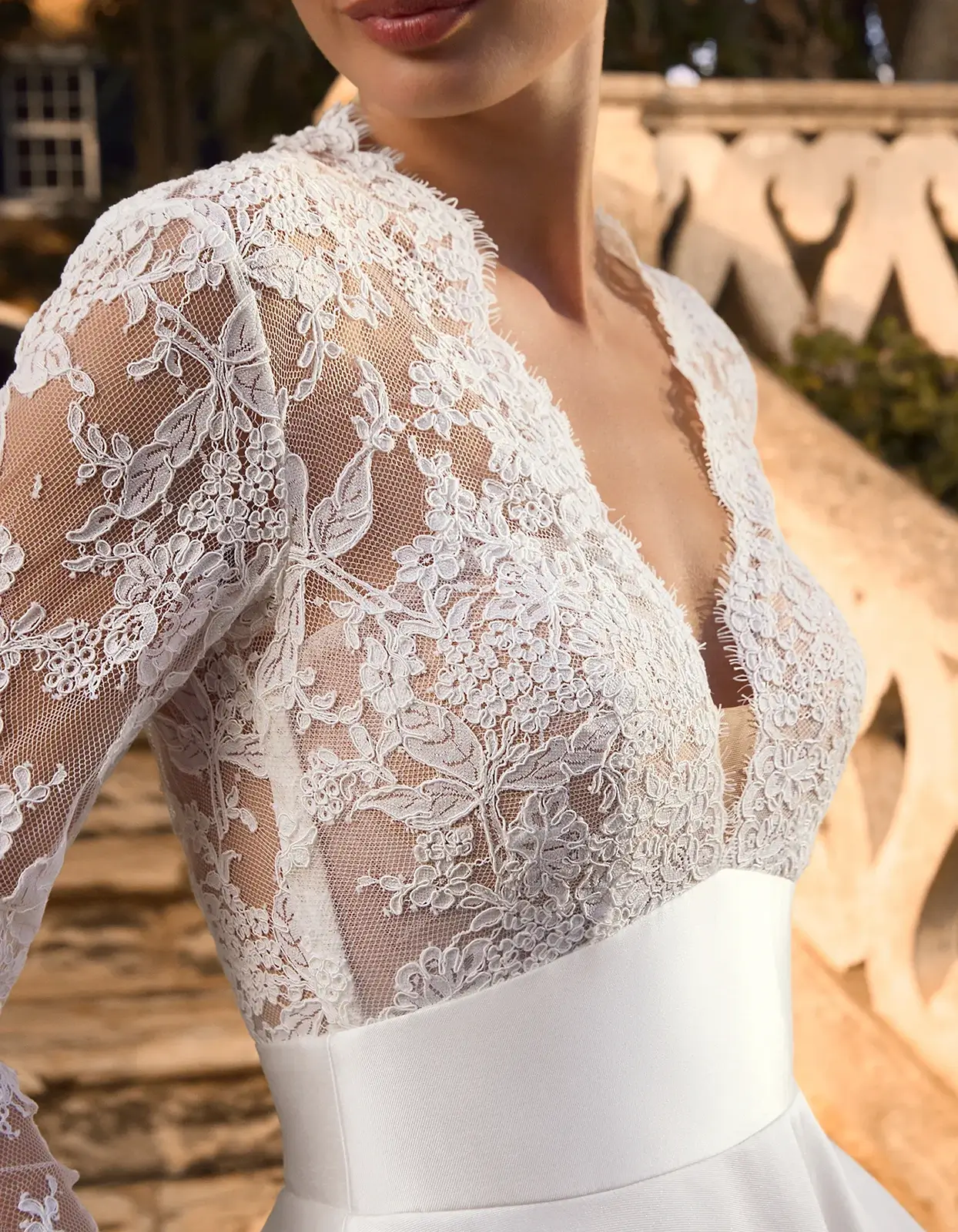 Robe trapèze de style classique qui combine un corsage en dentelle et un décolleté en V avec une jupe en mikado.