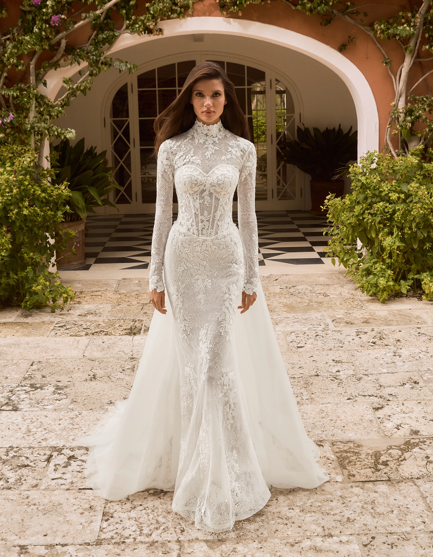 Robe sirène de style classique qui combine un corsage corset avec une jupe réalisée avec des applications de dentelle et de strass. Il comporte une veste à col montant amovible et une superposition de dentelle en tulle.