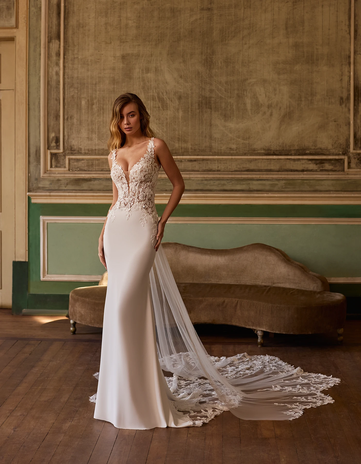 Robe de mariée sirène moderne combinant un corsage à décolleté en V réalisé avec de délicates applications de dentelle sur une jupe en crêpe avec une traîne en dentelle. Elle est accompagnée d’une sur-jupe en tulle avec une traîne en dentelle amovible, créant un effet double look.