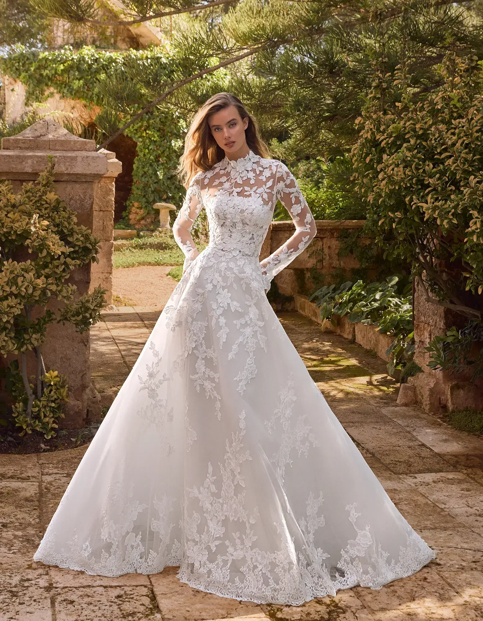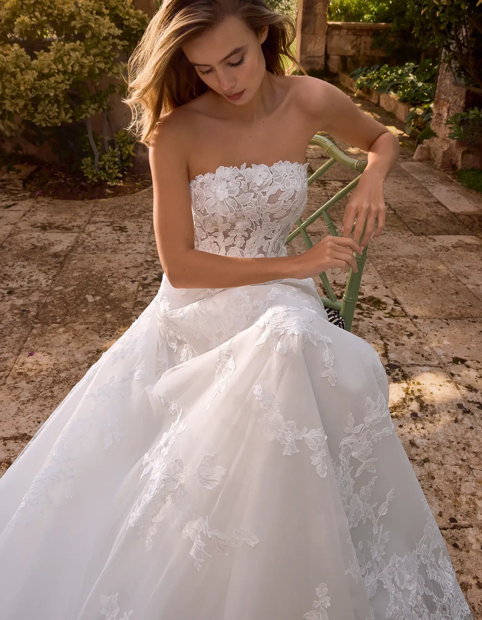 Robe trapèze de style romantique en tulle avec de délicates applications de dentelle et un décolleté bustier. Il est complété par une veste amovible qui donne un effet double look.