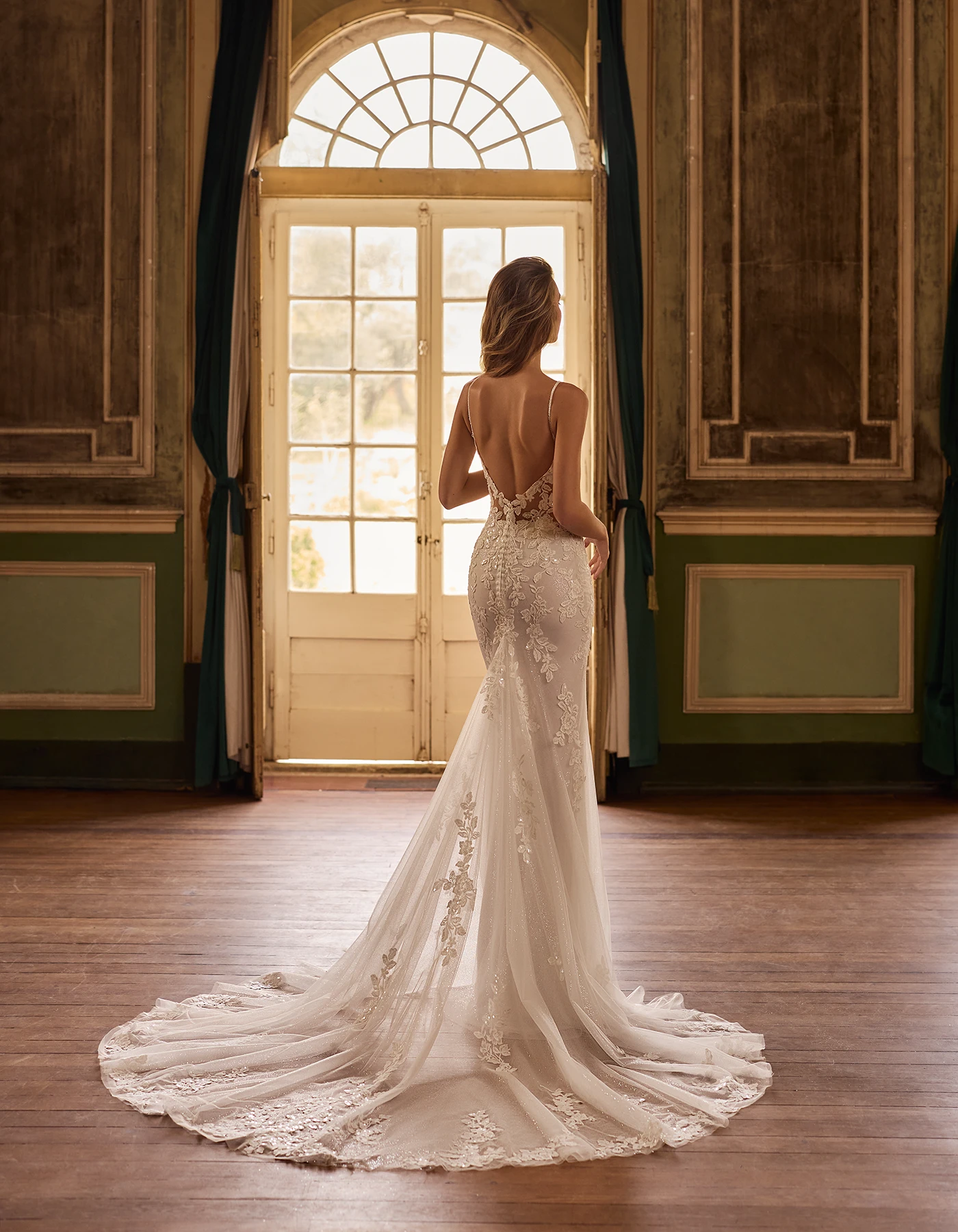 Robe de mariée sirène romantique entièrement réalisée en tulle avec de délicates applications de dentelle florale et de perles.