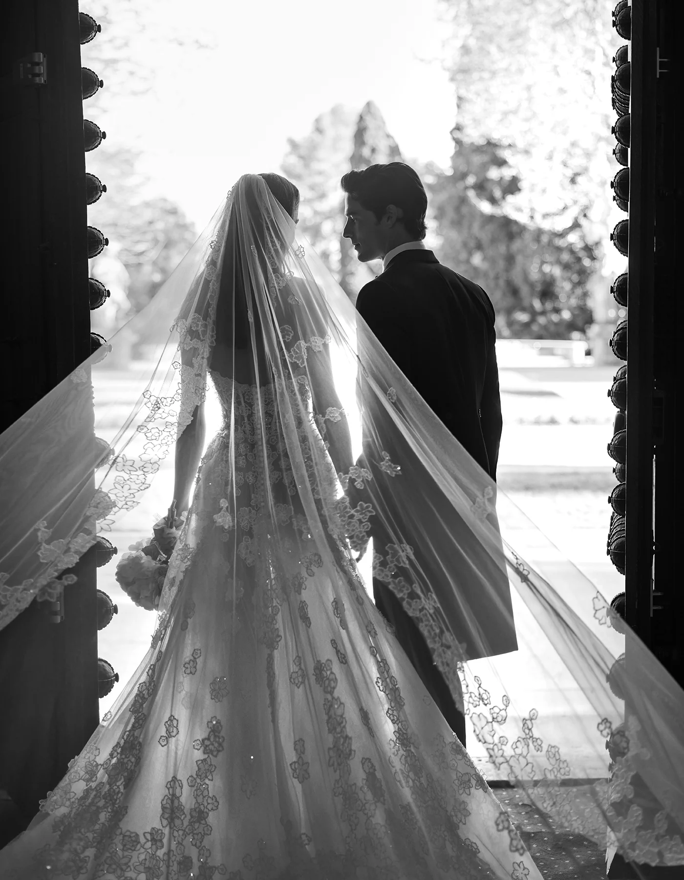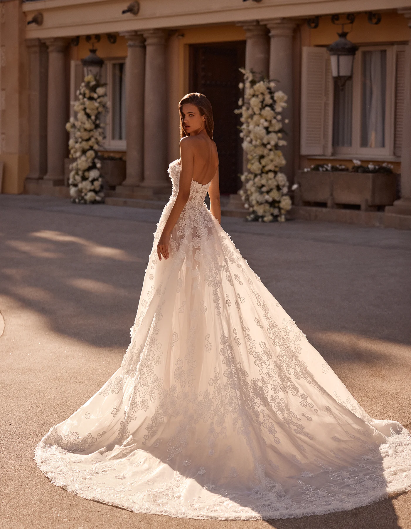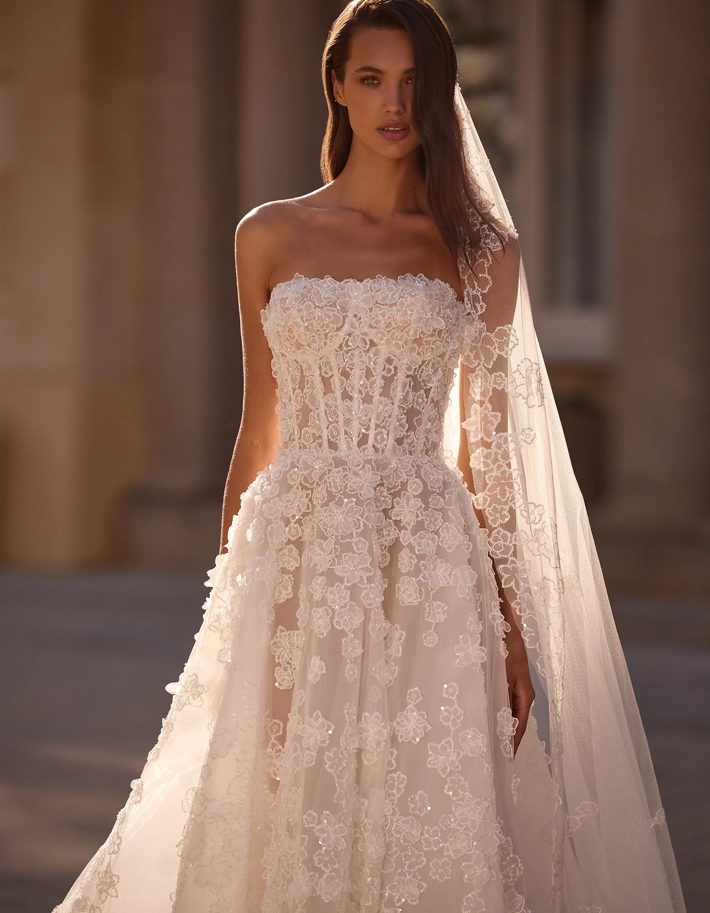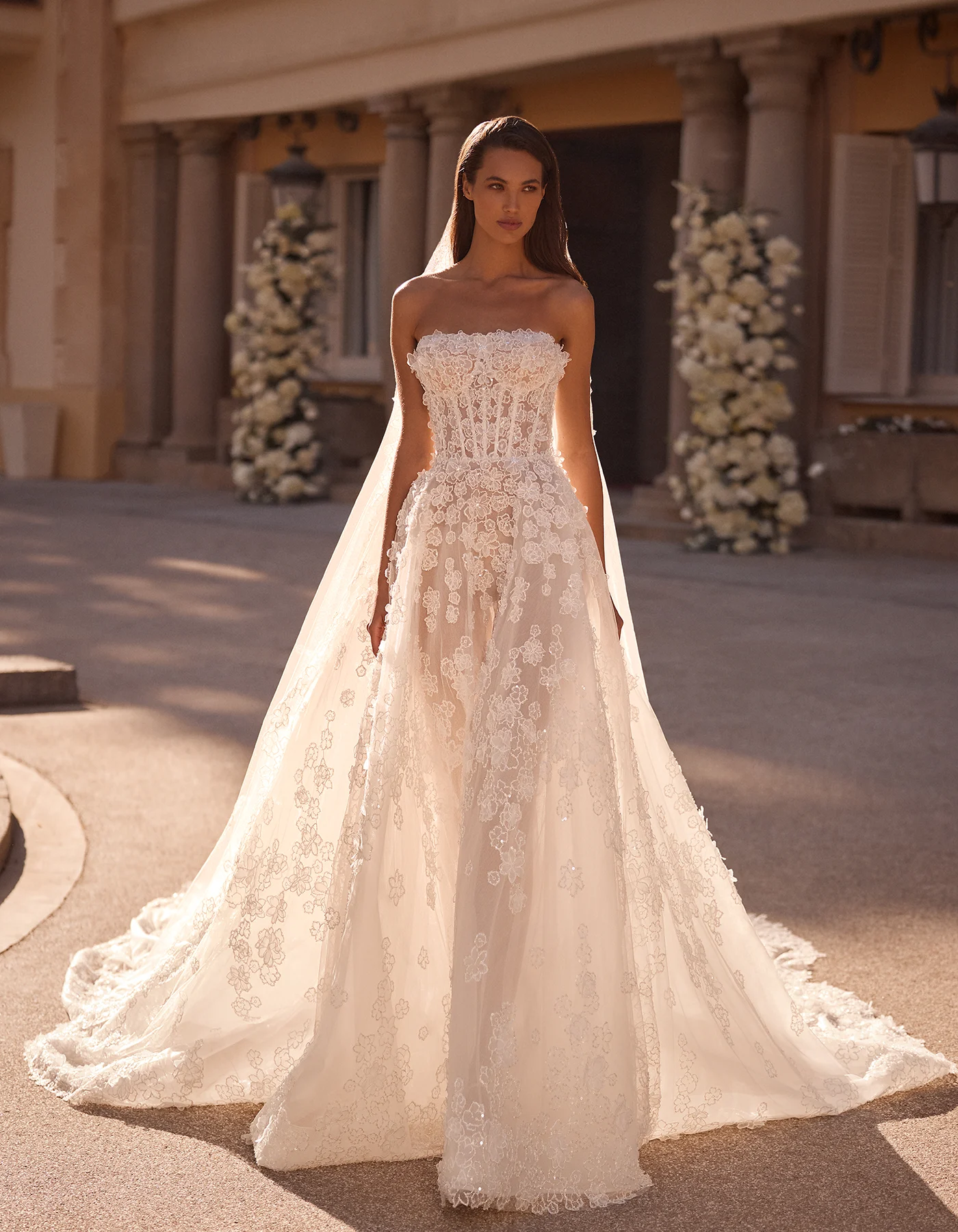 Robe de mariée coupe princesse au style romantique et moderne. Elle présente un corsage corset avec un décolleté bateau, entièrement réalisé en délicates applications de dentelle et fleurs 3D qui créent un effet transparent.
