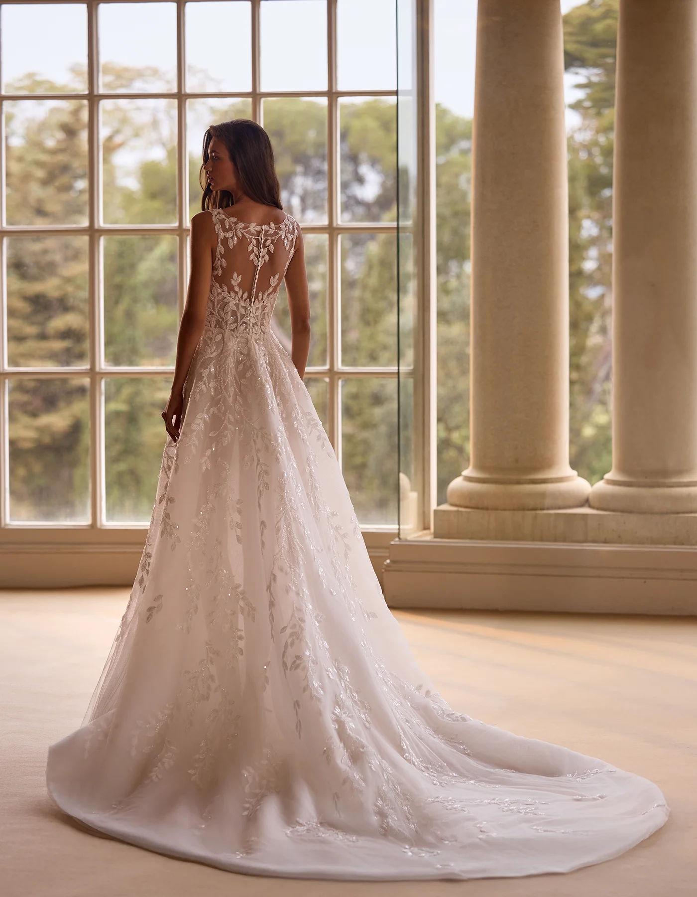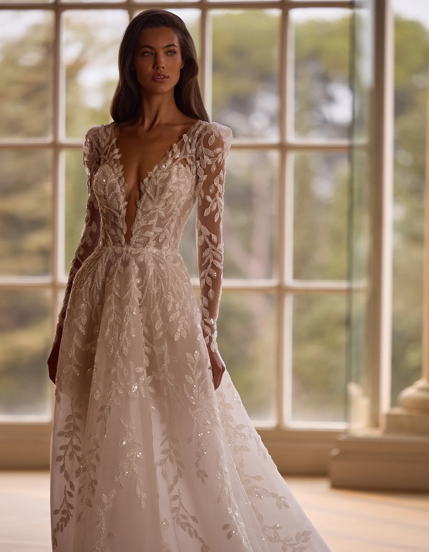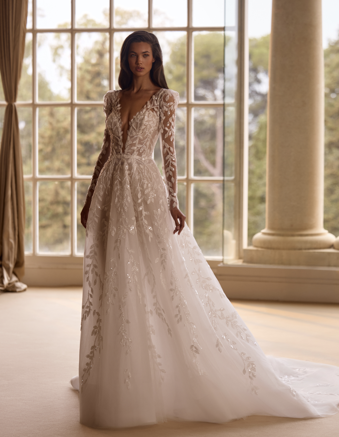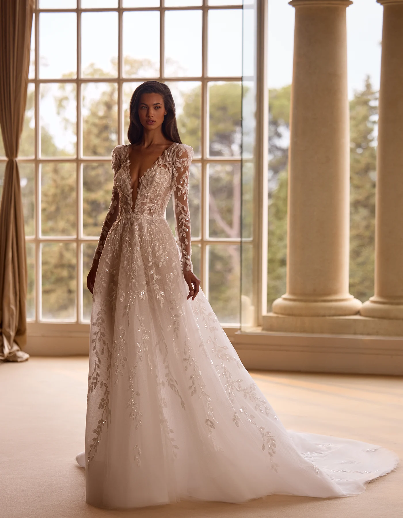 Robe de mariée coupe princesse au style romantique et moderne. Elle présente un corsage à décolleté en V, entièrement réalisé avec des applications de dentelle perlée et une longue traîne. Elle est complétée par des manches longues amovibles pour créer un effet double look.