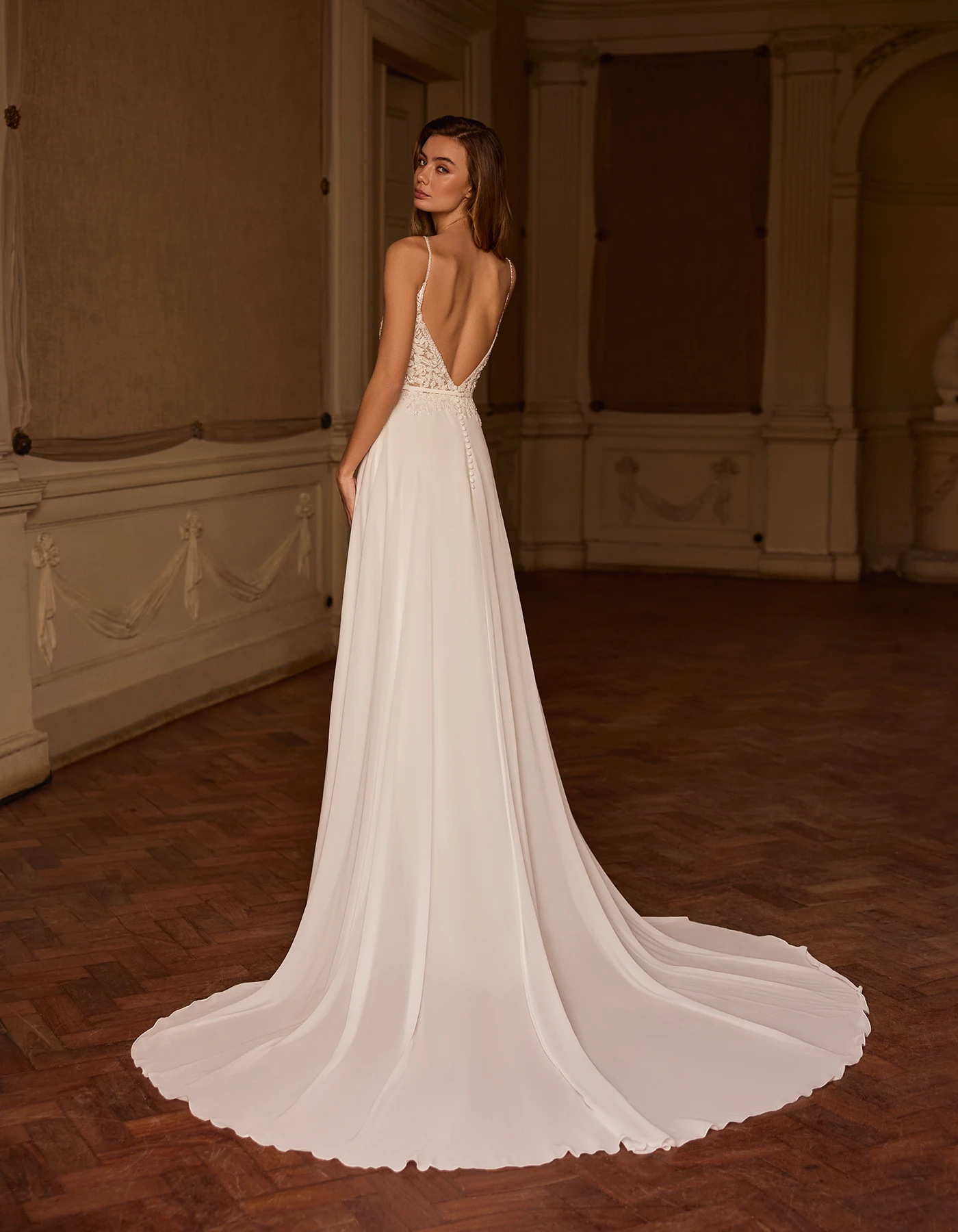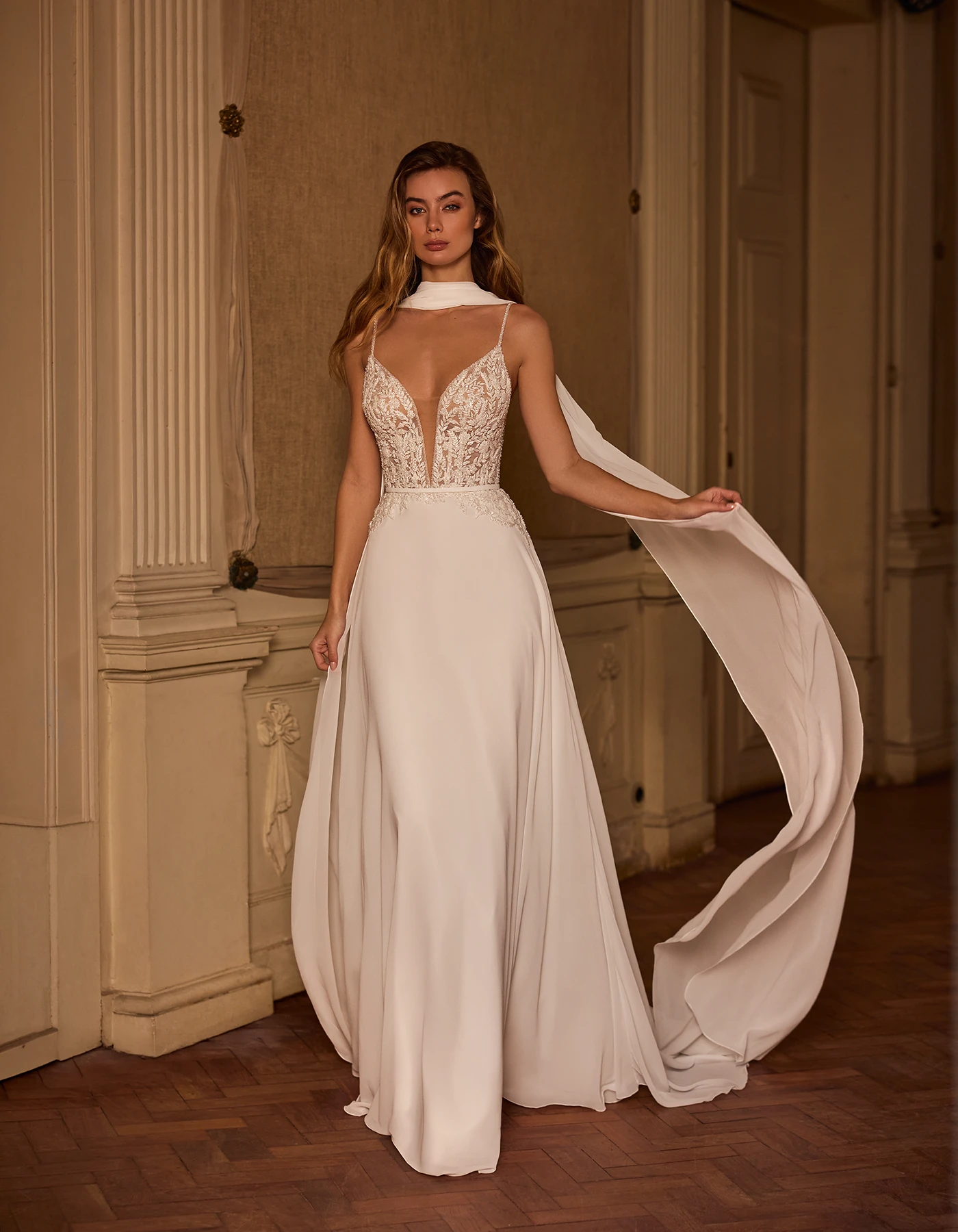 Robe de mariée coupe princesse romantique combinant un corsage à décolleté en V réalisé avec de délicates applications de dentelle sur une jupe en chiffon soyeux. Elle est accompagnée d’un châle en chiffon amovible qui crée un effet double look.