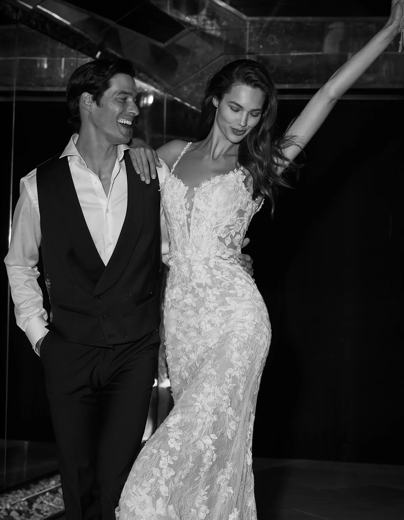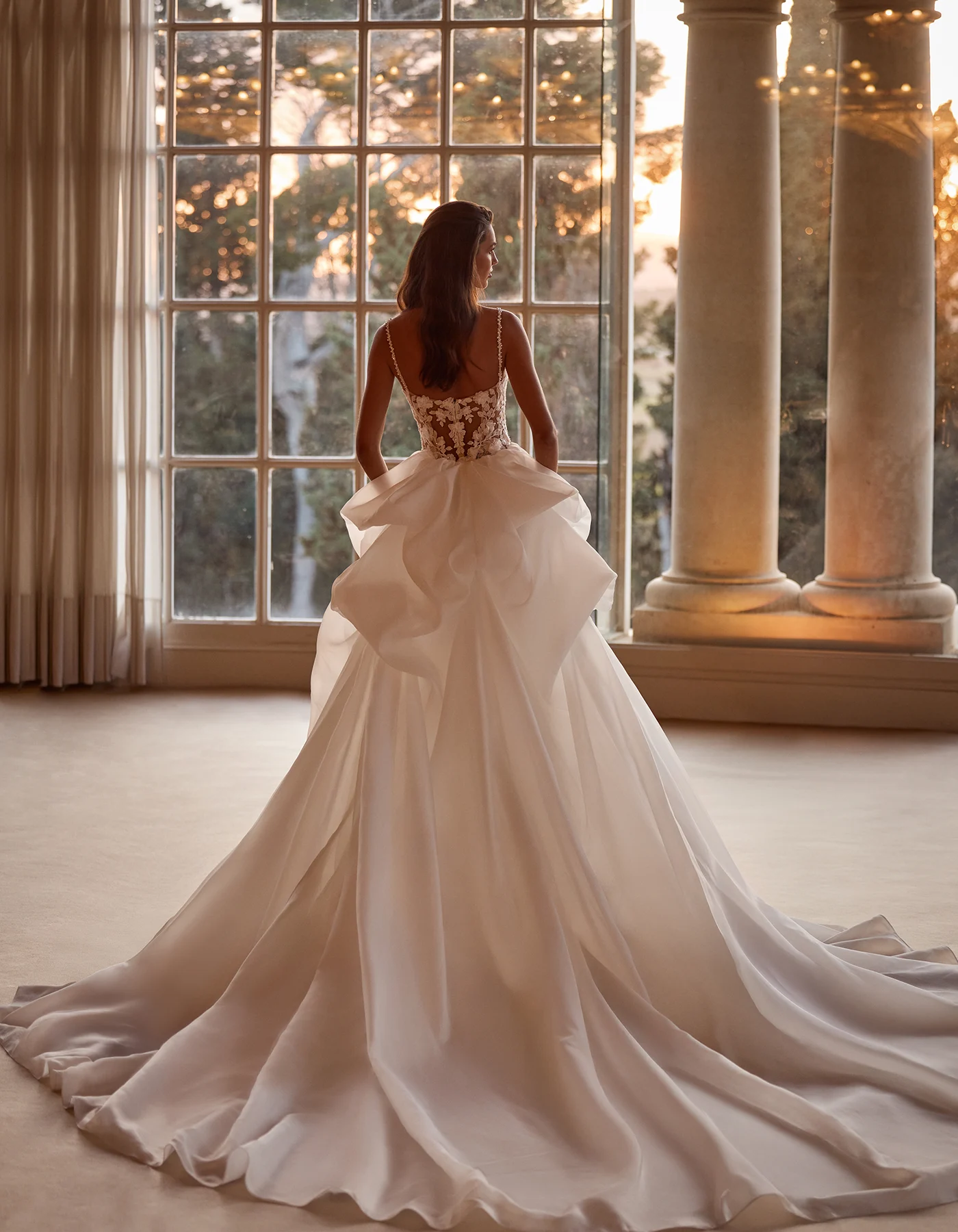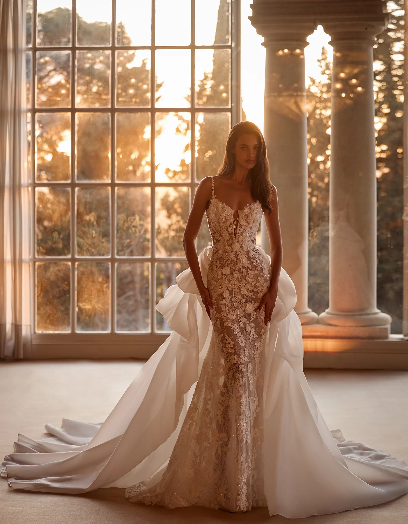 Robe de mariée sirène entièrement réalisée avec de délicates applications de dentelle et de perles sur chantilly, avec des bretelles perlées. Elle présente une surjupe amovible en organza et des volumes variés qui subliment la silhouette.