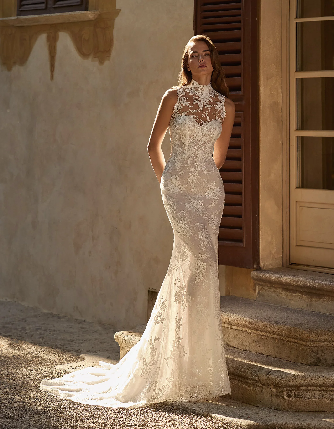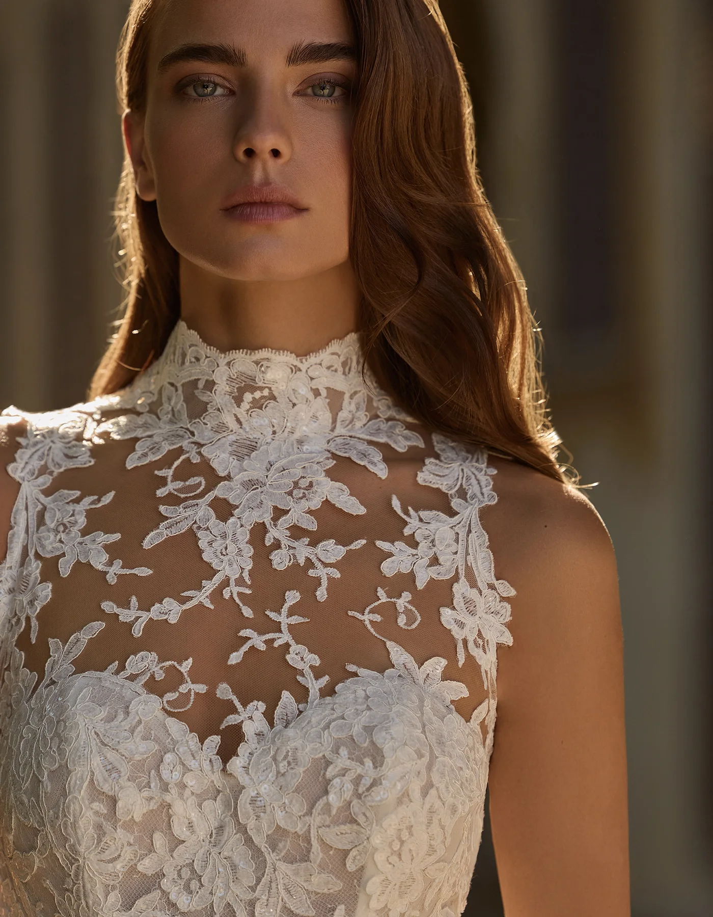 Abito da sposa sirena in stile romantico, realizzato interamente in pizzo. Bustier con scollo halter e delicate applicazioni in pizzo su tulle, gonna sirena e apertura sulla schiena.
