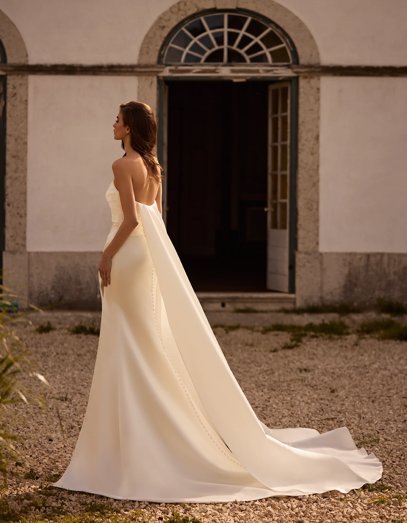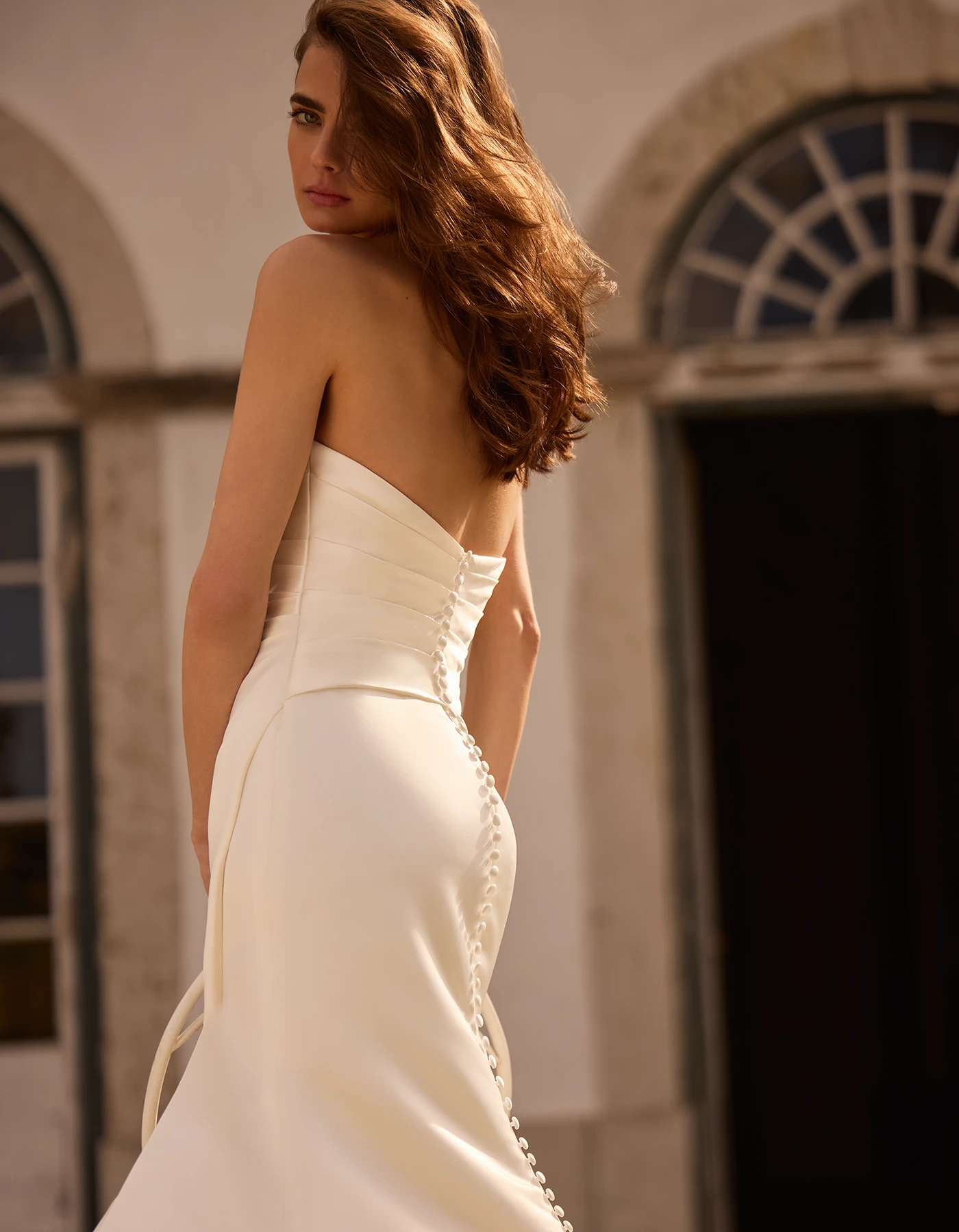 Abito da sposa linea A di stile moderno. Presenta un corpetto delicatamente drappeggiato e include come complemento una gonna interna rimovibile in pizzo e cristalli, per un effetto doppio look.