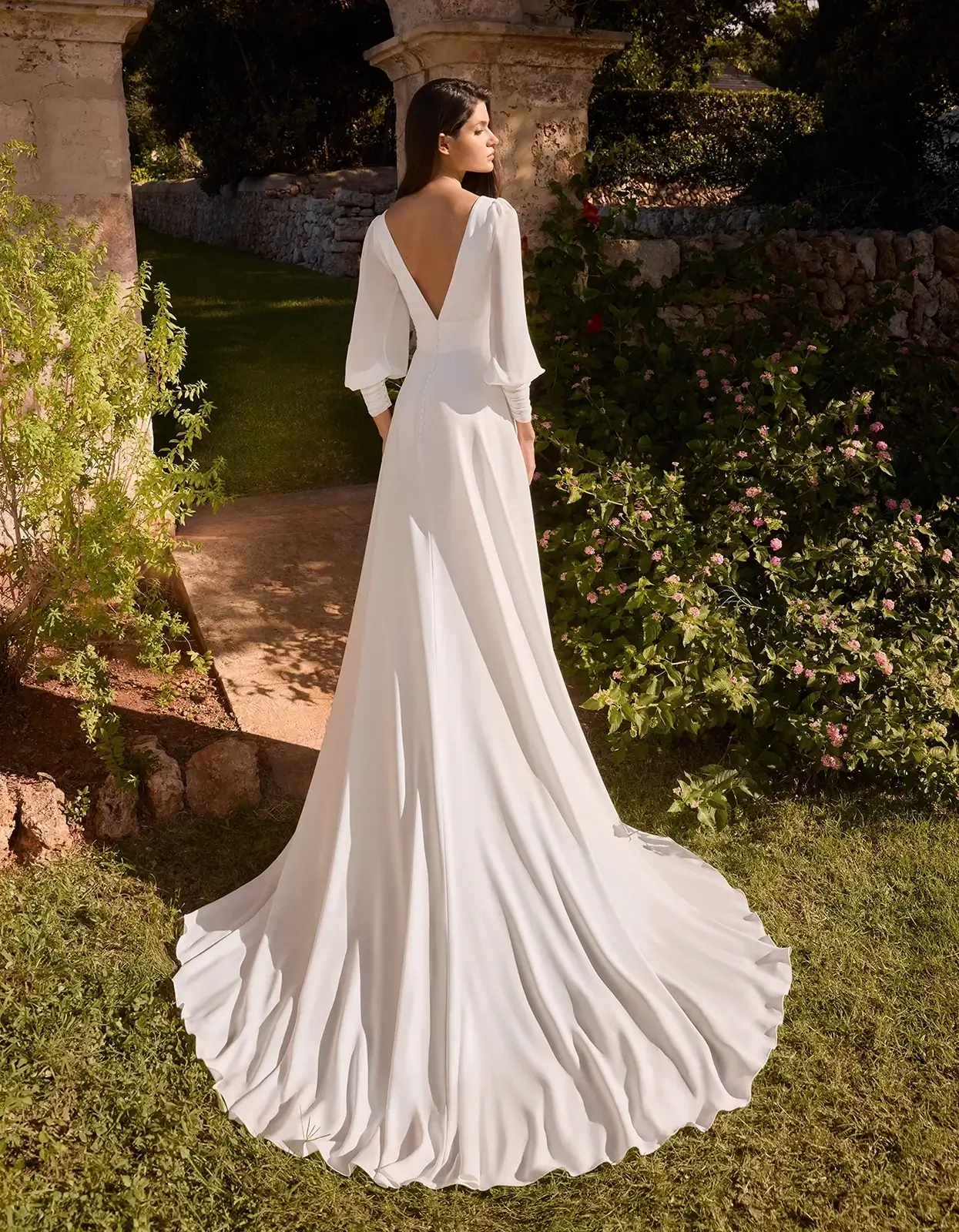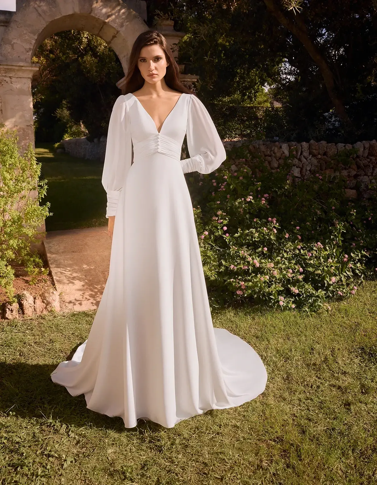 Abito in linea A dallo stile semplice realizzato interamente in crêpe e chiffon setoso. Ha lo scollo a V e microdrappeggi in vita e sui polsini.