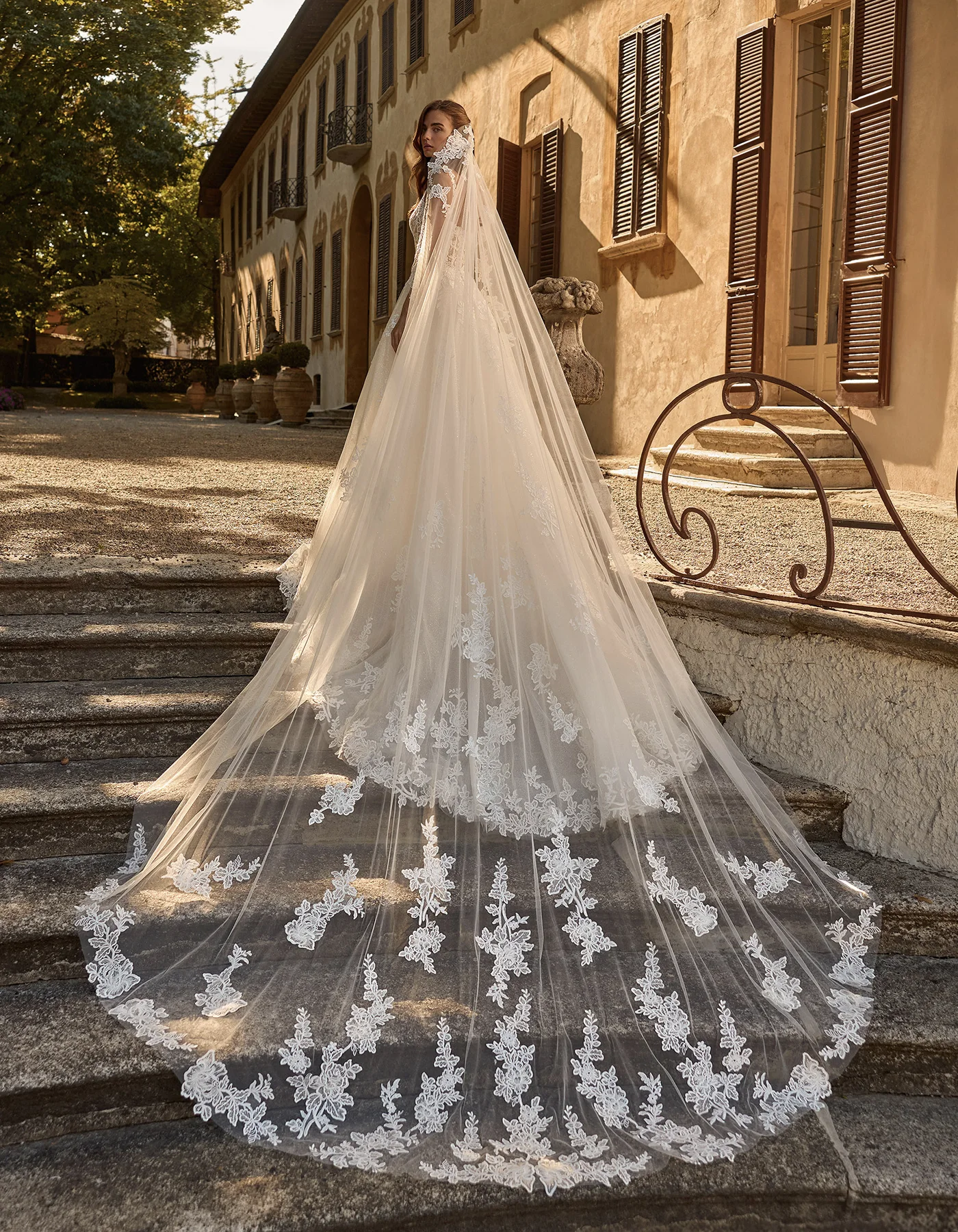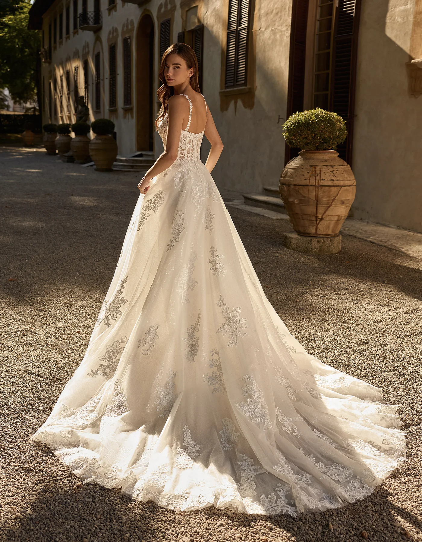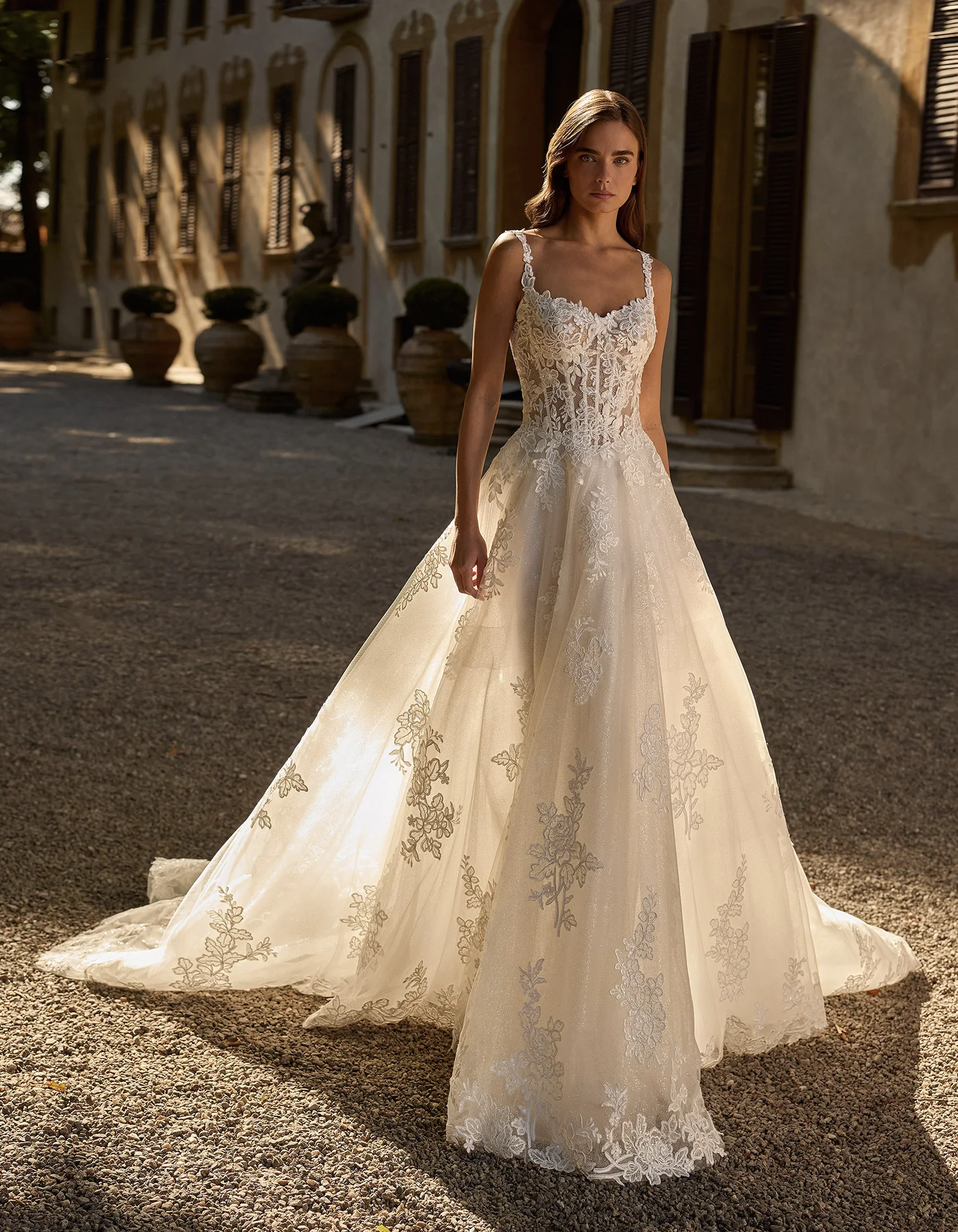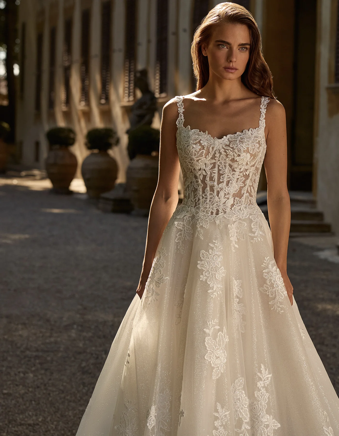 Abito da sposa principesco e romantico in tulle glitter con applicazioni di pizzo ricamato. Bustier strutturato con scollo a V e spalline decorate, abbinato a una gonna in tulle ricamato. Completa il look un lungo velo in tulle.
