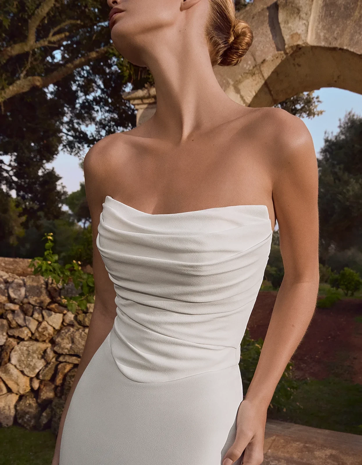Abito a sirena dallo stile moderno realizzato interamente in crêpe, con corpetto drappeggiato e giacca in pizzo rimovibile che dona un effetto double look.