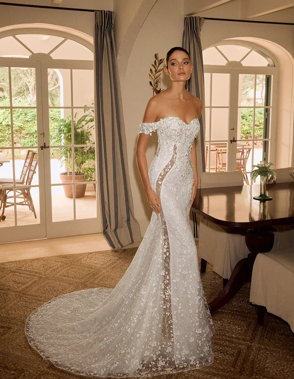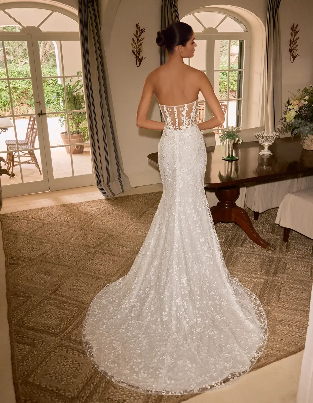Abito a sirena dallo stile moderno realizzato interamente in delicato tessuto di pizzo floreale e presenta aperture semitrasparenti sui lati.