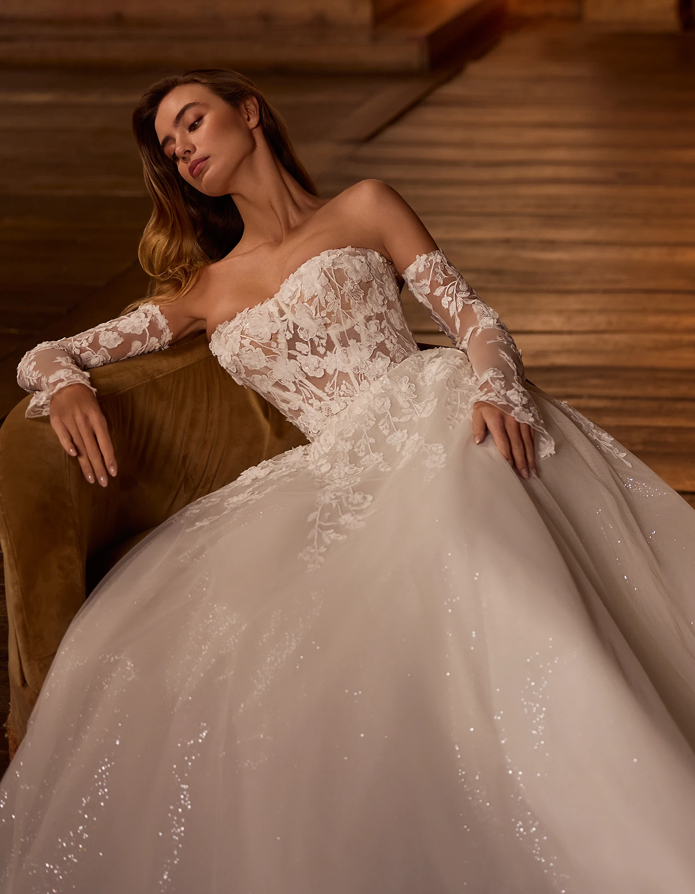 Abito da sposa linea A di stile romantico interamente in tulle con delicate applicazioni di pizzo floreale. Include due maniche lunghe rimovibili in pizzo per effetto doppio look.