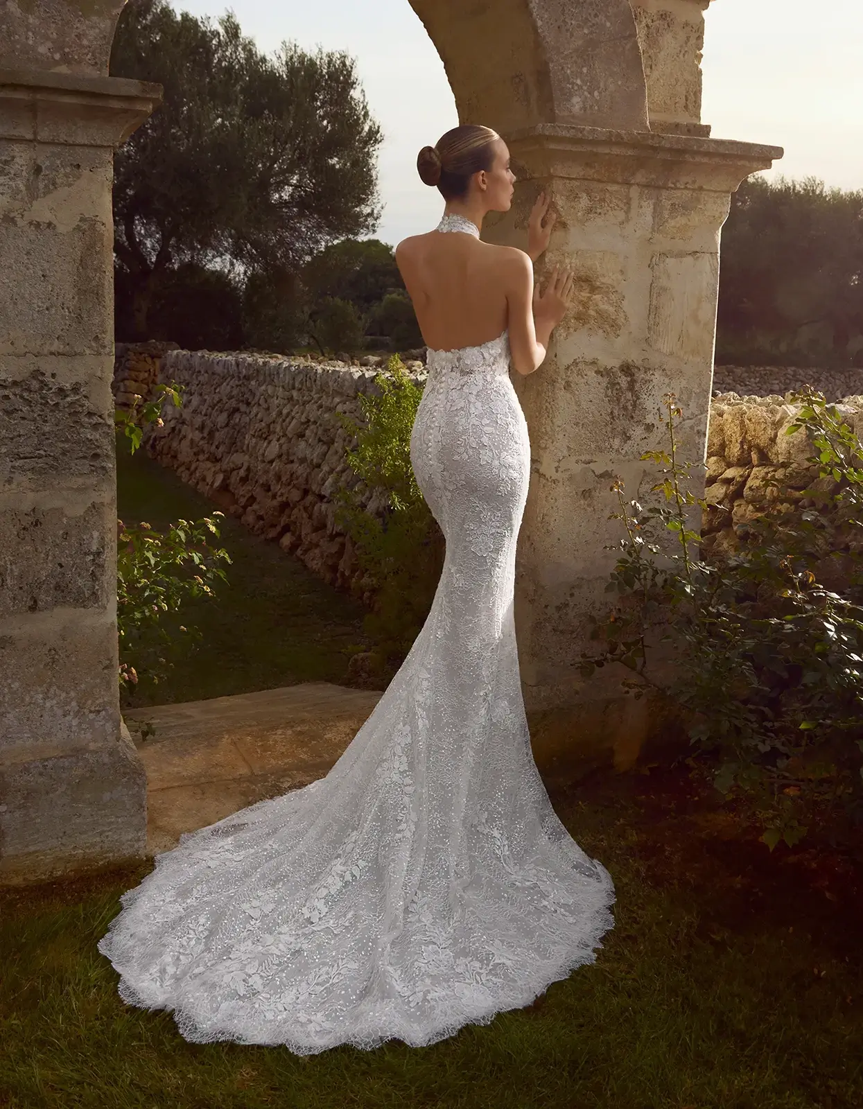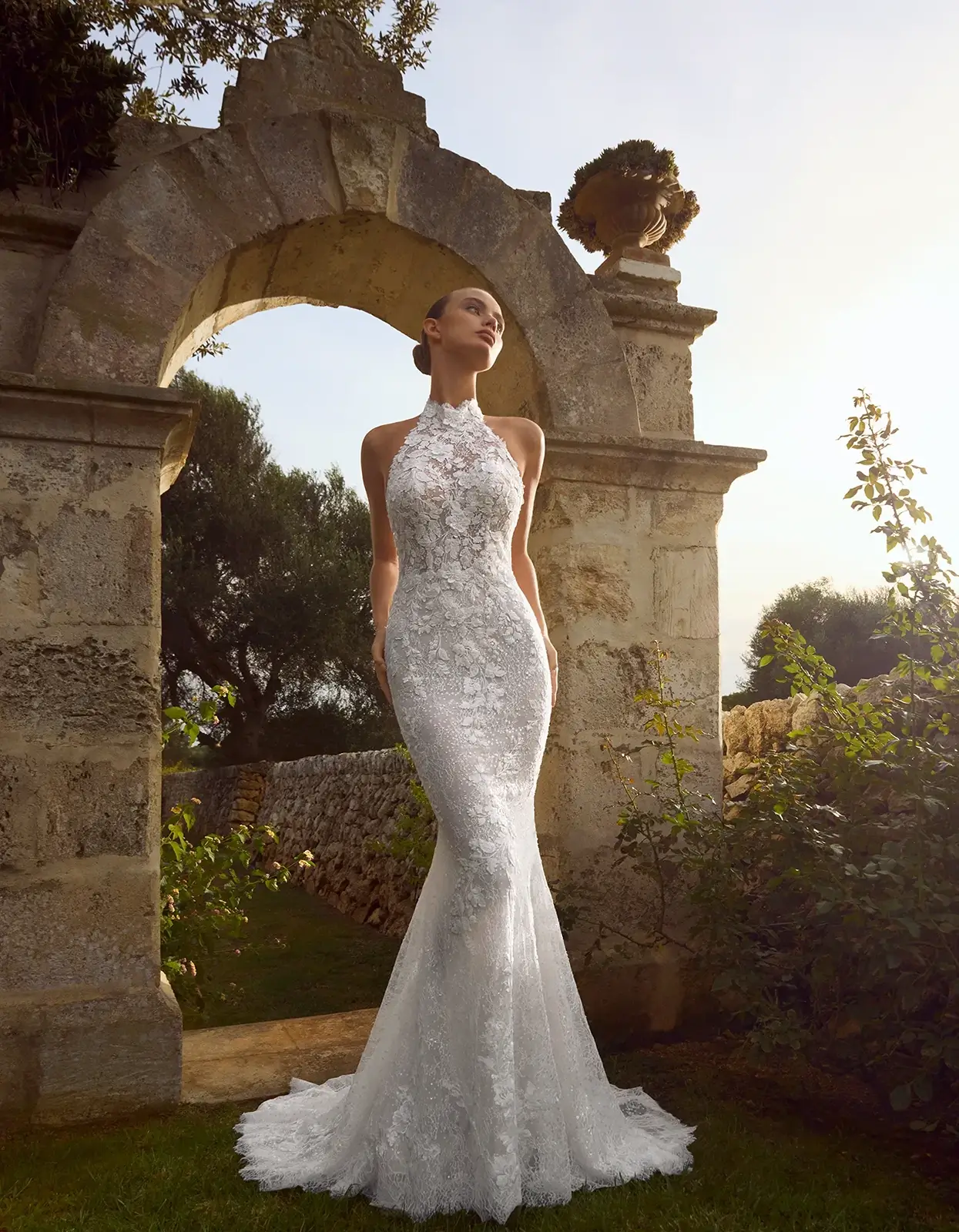 Abito a sirena dallo stile romantico con scollo all’americana e schiena scoperta, realizzato interamente in tulle con delicate applicazioni in pizzo e fiori 3D