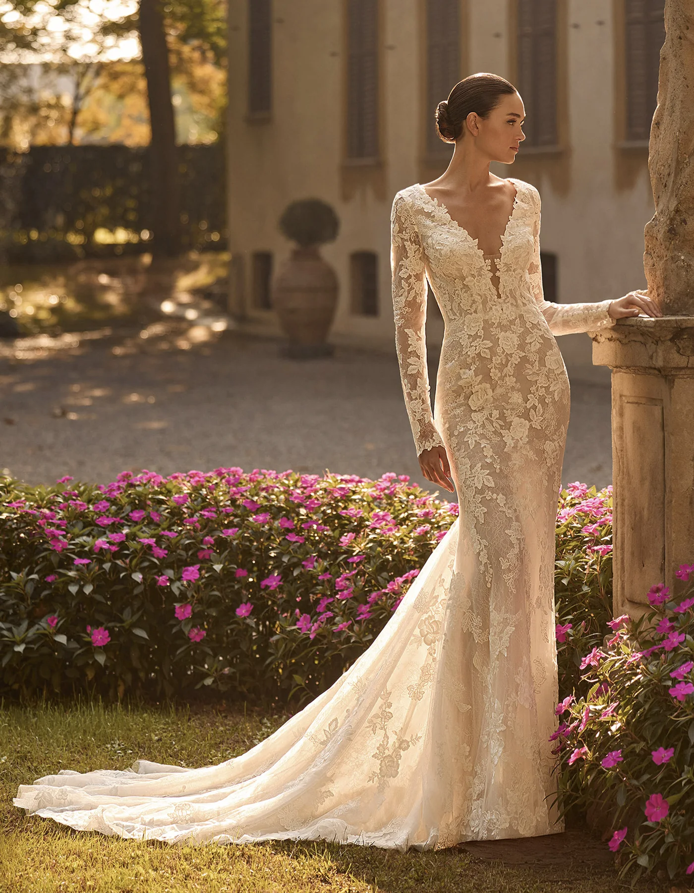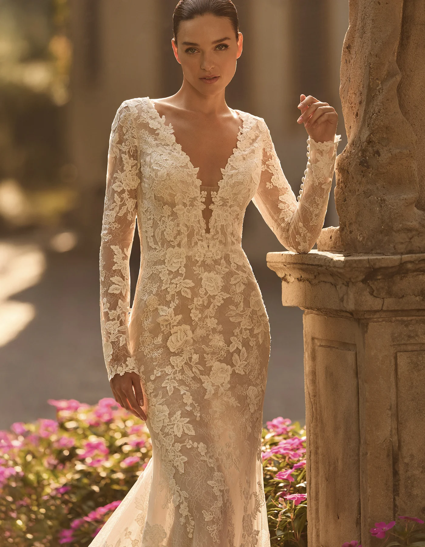 Abito da sposa sirena, di stile romantico con applicazioni di pizzo ricamato, scollo a V e maniche, abbinato a una gonna sirena in pizzo con trasparenze e schiena aperta.