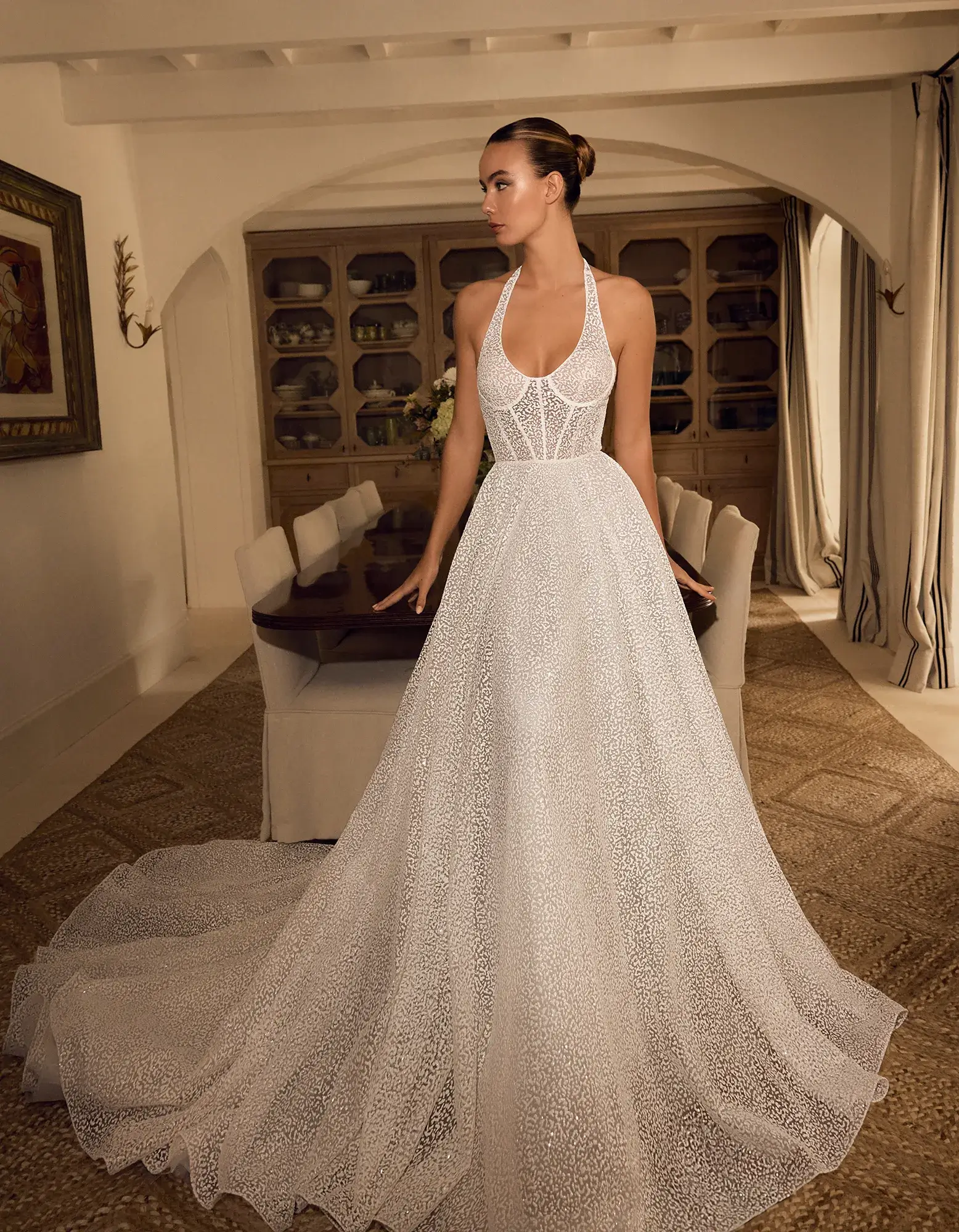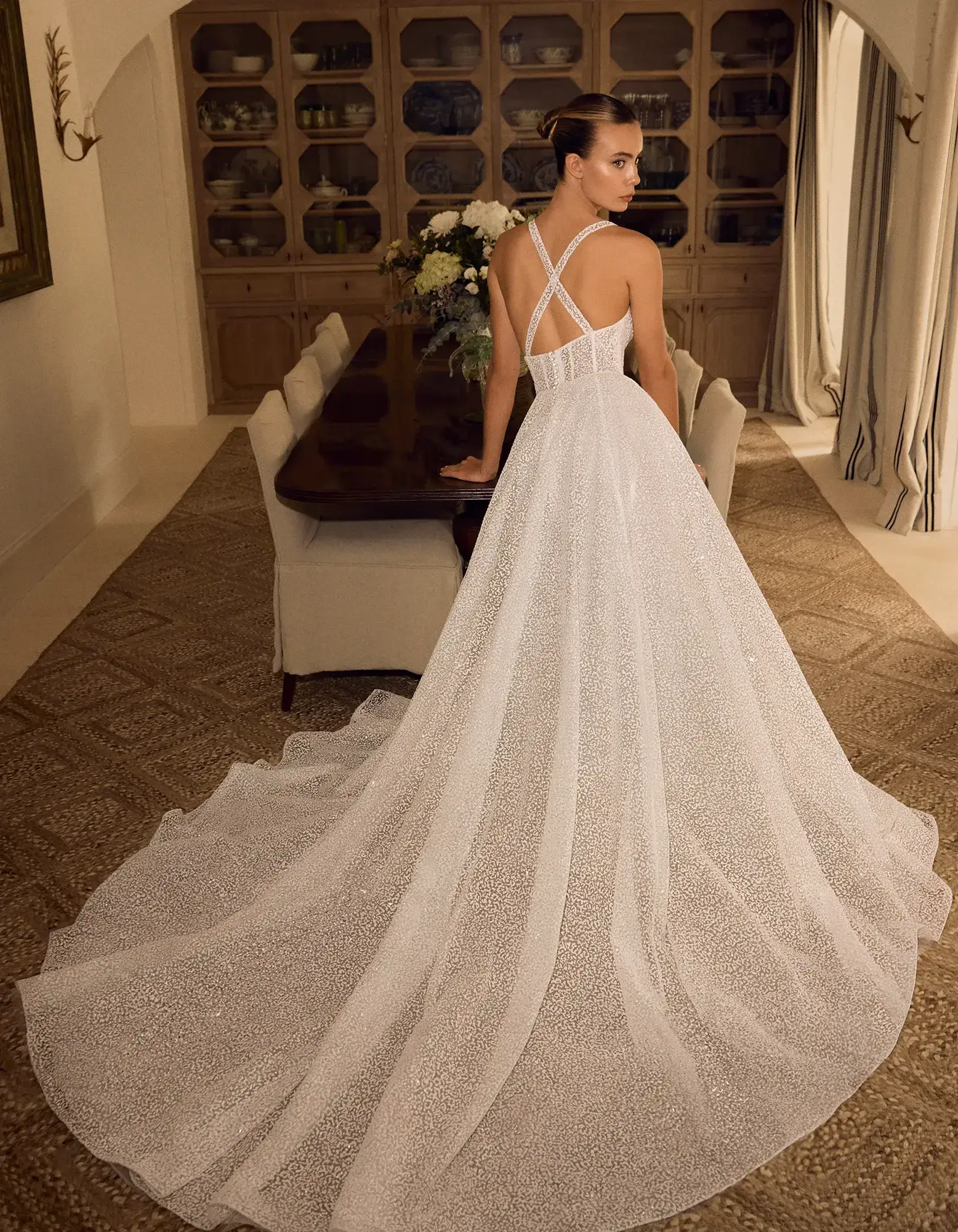Abito in linea A in stile moderno realizzato interamente in tessuto di tulle glitterato che combina una scollatura all’americana con un corpetto a corsetto e sublimato con un incrocio sul retro.