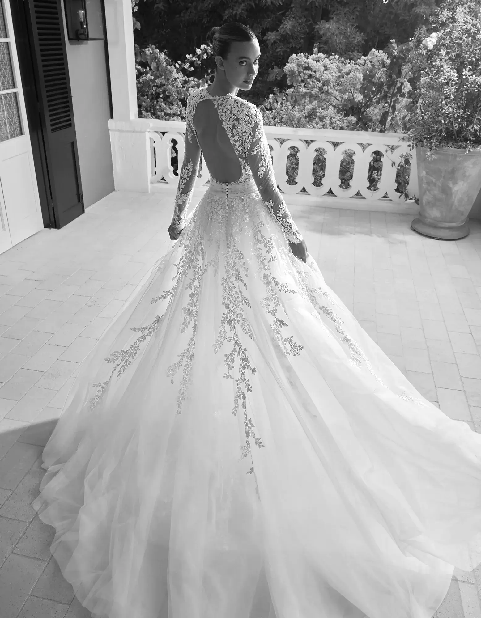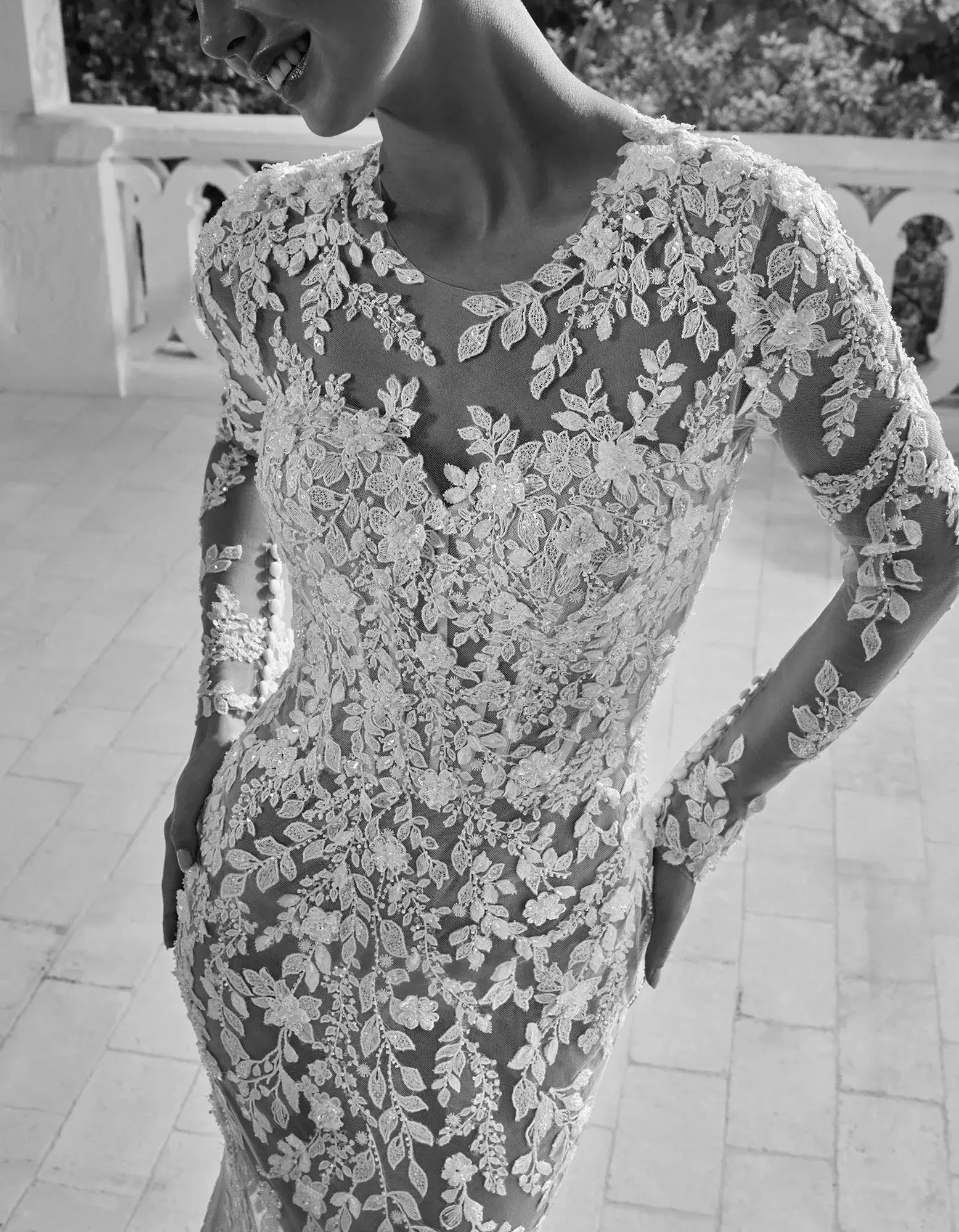 Abito a sirena dallo stile romantico e moderno che abbina un body a corsetto ad applicazioni di pizzo sulla gonna. Ha come complemento una sopragonna in tulle, che dona un effetto double look.