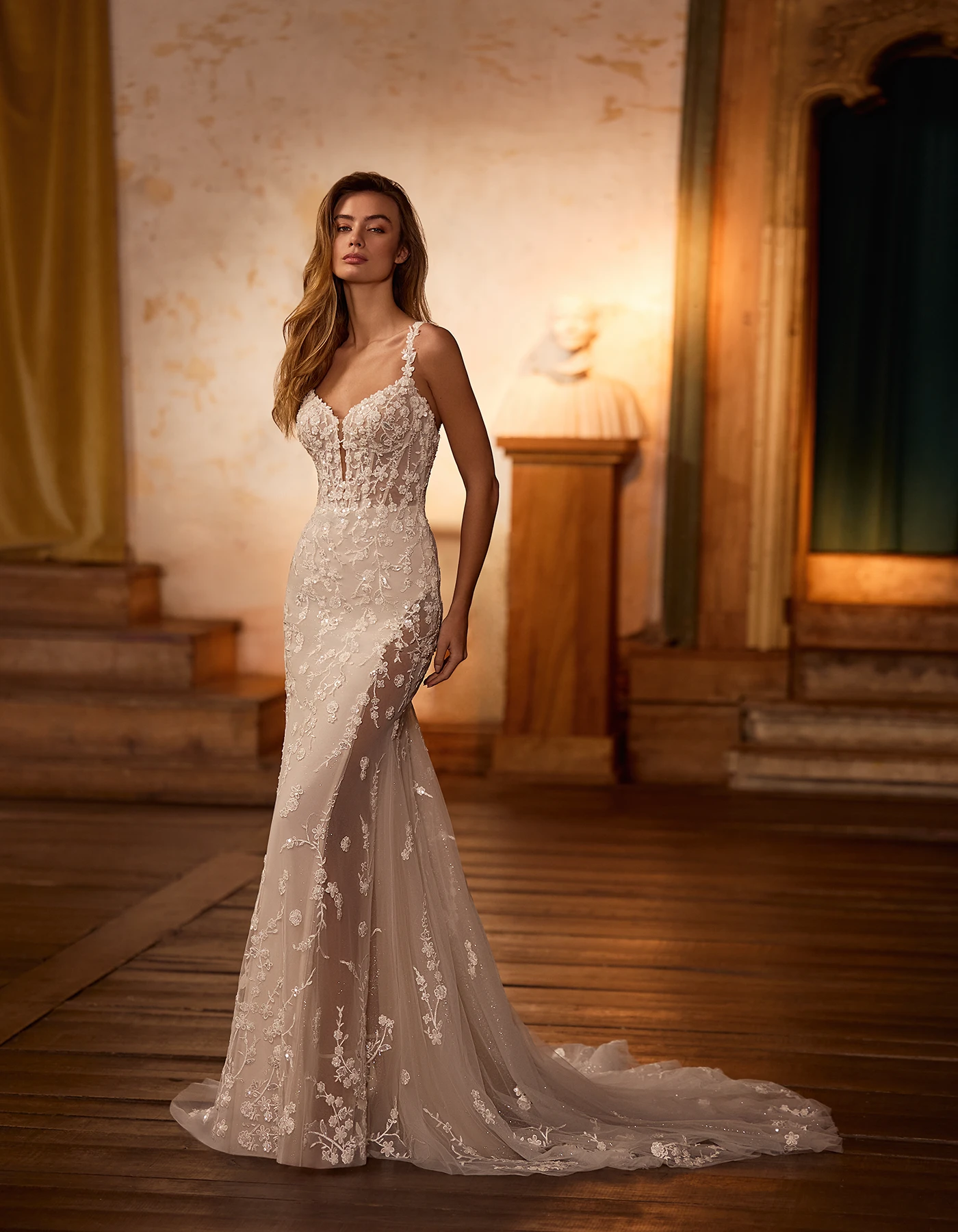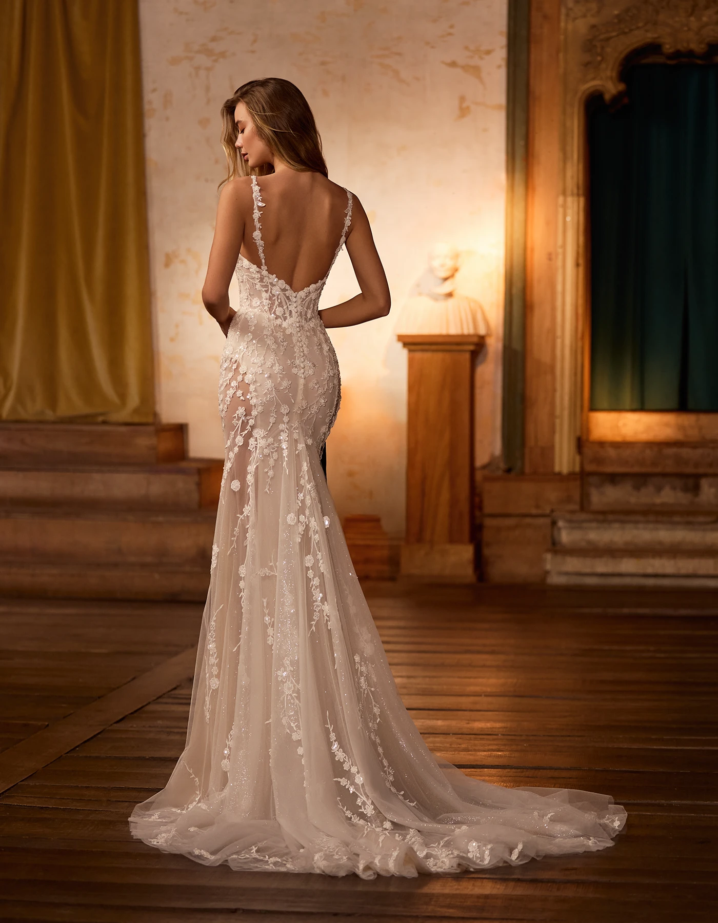 Abito da sposa sirena di stile moderno con scollo a V e schiena scoperta, interamente in tulle con delicate applicazioni di pizzo floreale e cristalli.