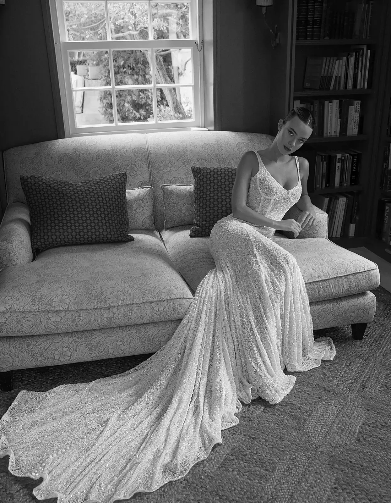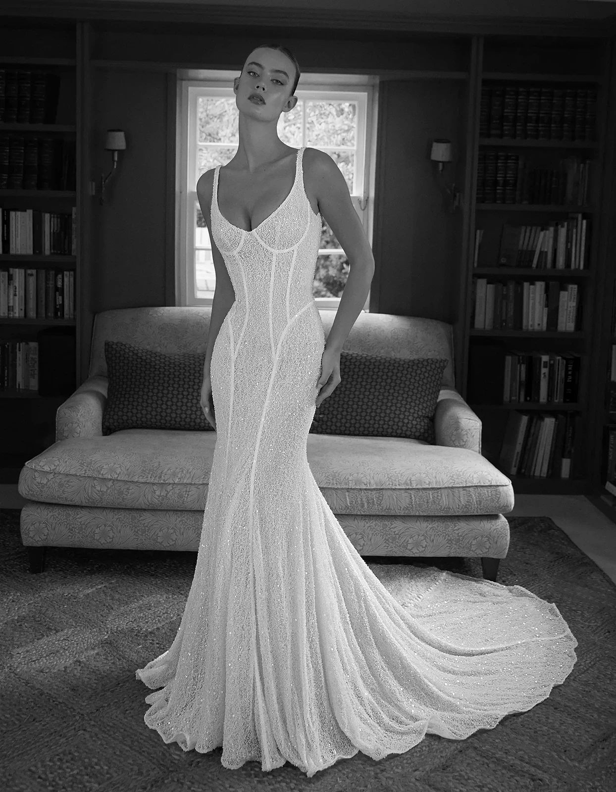 Vestido de sirena de estilo moderno confeccionado enteramente de pedrería, con cuello pico y espalda en V.