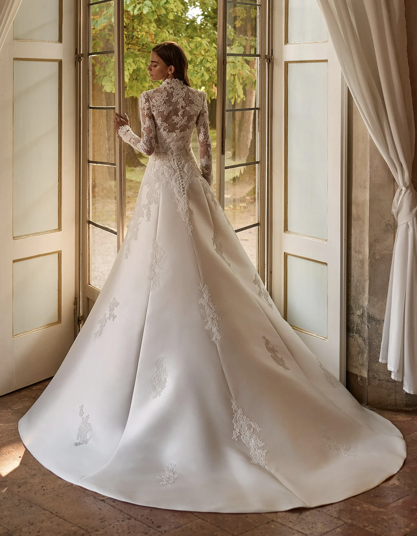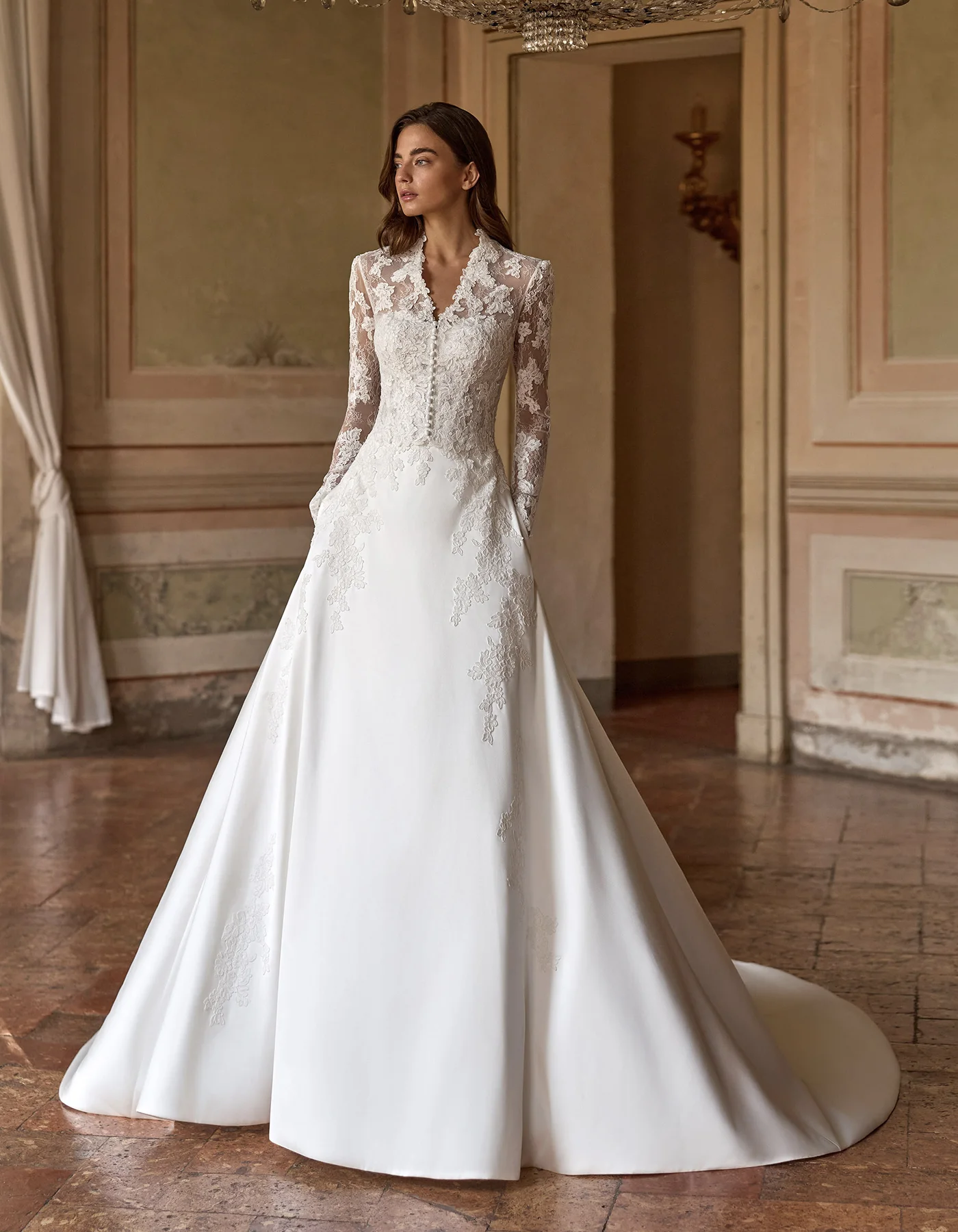 Vestido de novia de línea A, de estilo romántico y clásico. Presenta un cuerpo corsé de encaje estructurado con escote corazón decorado con pedrería, sobre falda de mikado con aplicaciones de encaje y pedrería. Lleva como complemento una chaqueta de encaje que da un efecto doble look.