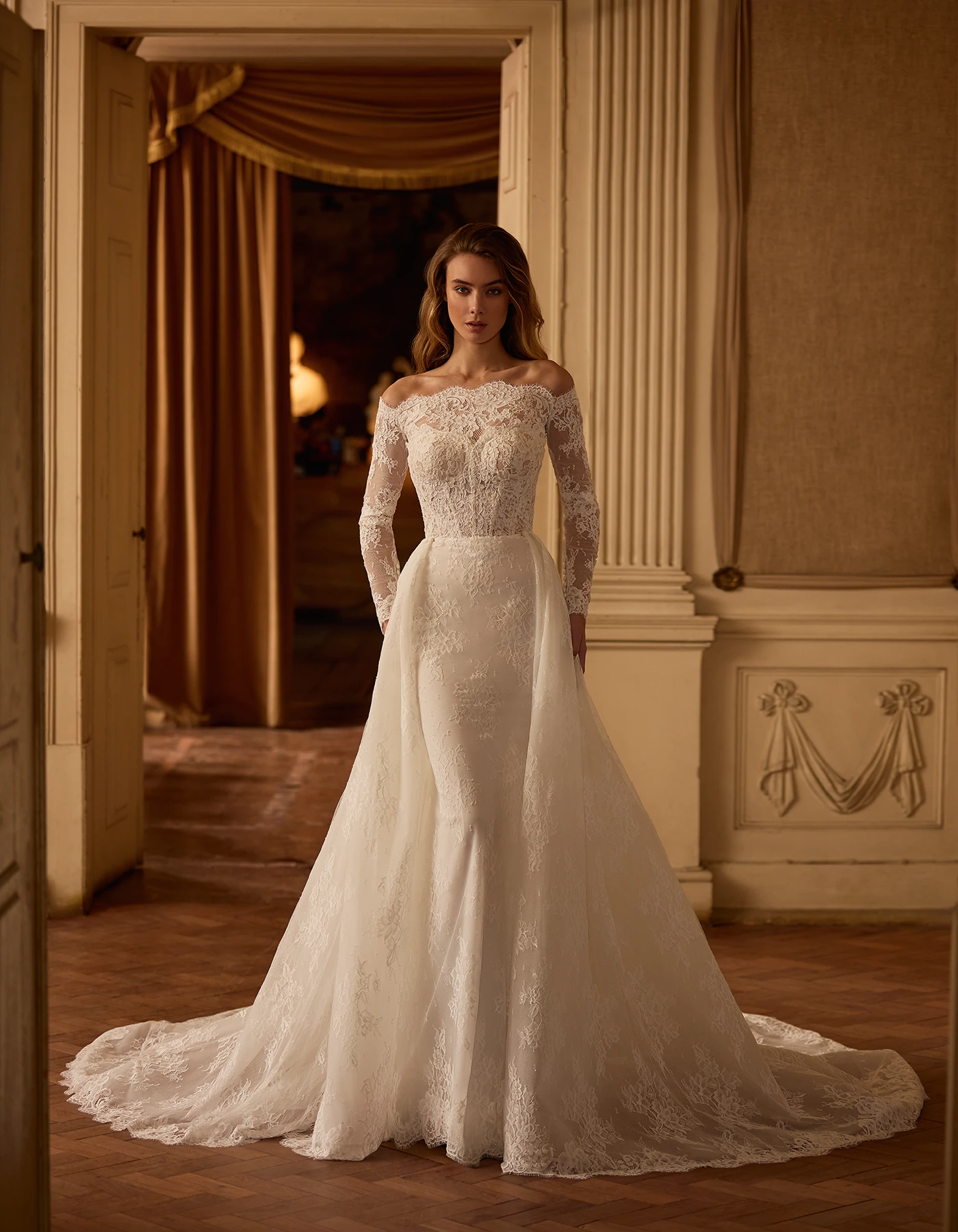 Vestido de novia sirena de estilo clásico y romántico elaborado enteramente en tul con delicado encaje rebrodé. Lleva como complementos un abrigo extraíble de mangas largas, escote envolvente y una sobrecola de encaje.