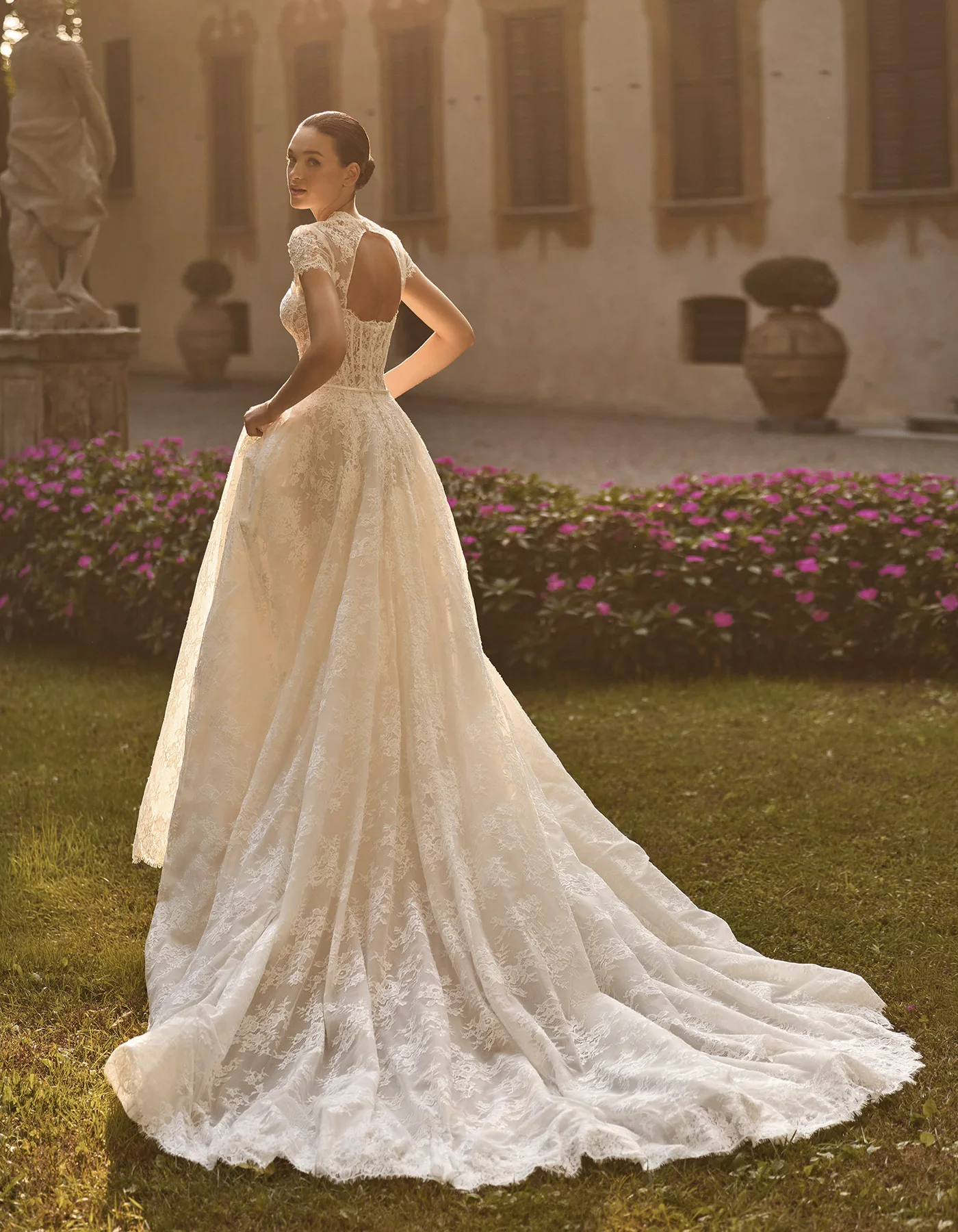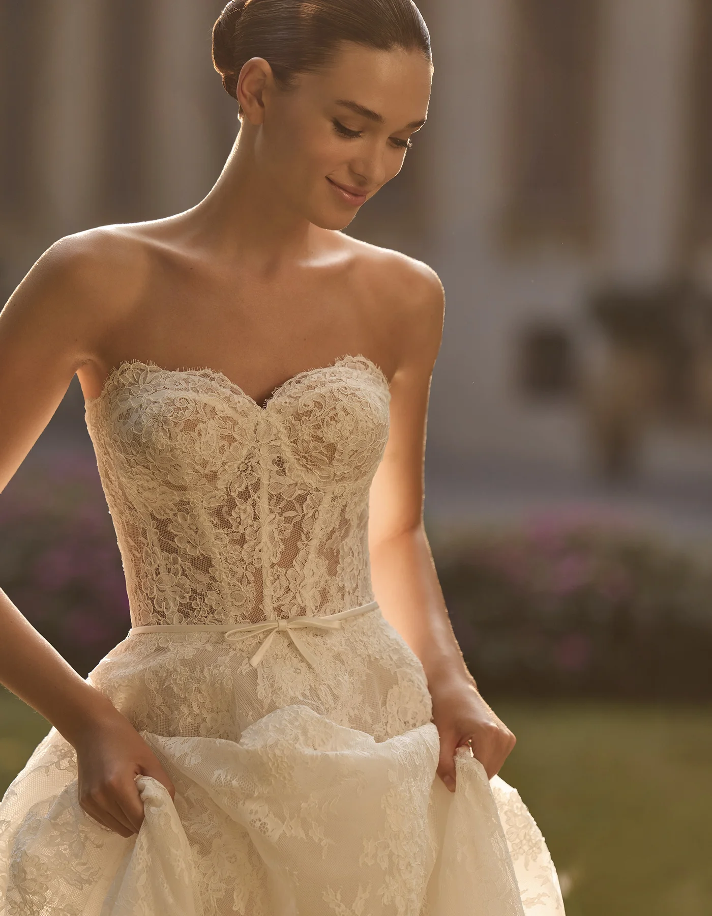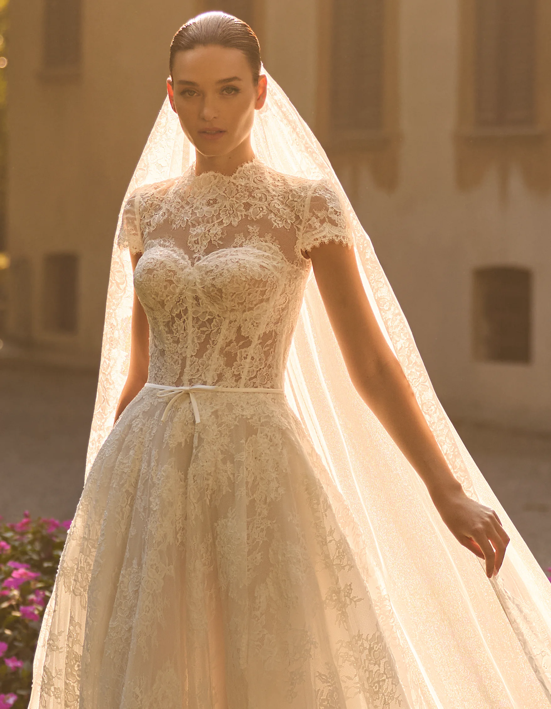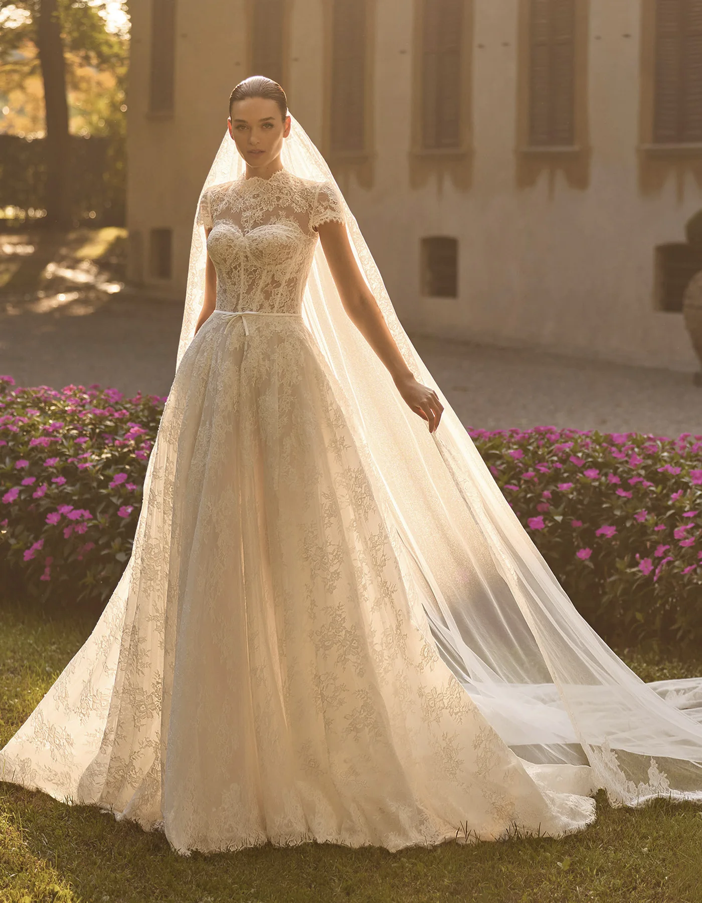 Vestido de novia princesa, de estilo romántico, elaborado íntegramente en encaje rebrodé. Presenta un cuerpo corsé de escote corazón, con detalle de pequeño lazo de raso, sobre falda de encaje rebrodé. Lleva como complementos una chaqueta de encaje que crea una abertura en la espalda y un velo de tul con aplicaciones de encaje en el bajo, que permite crear un doble look.