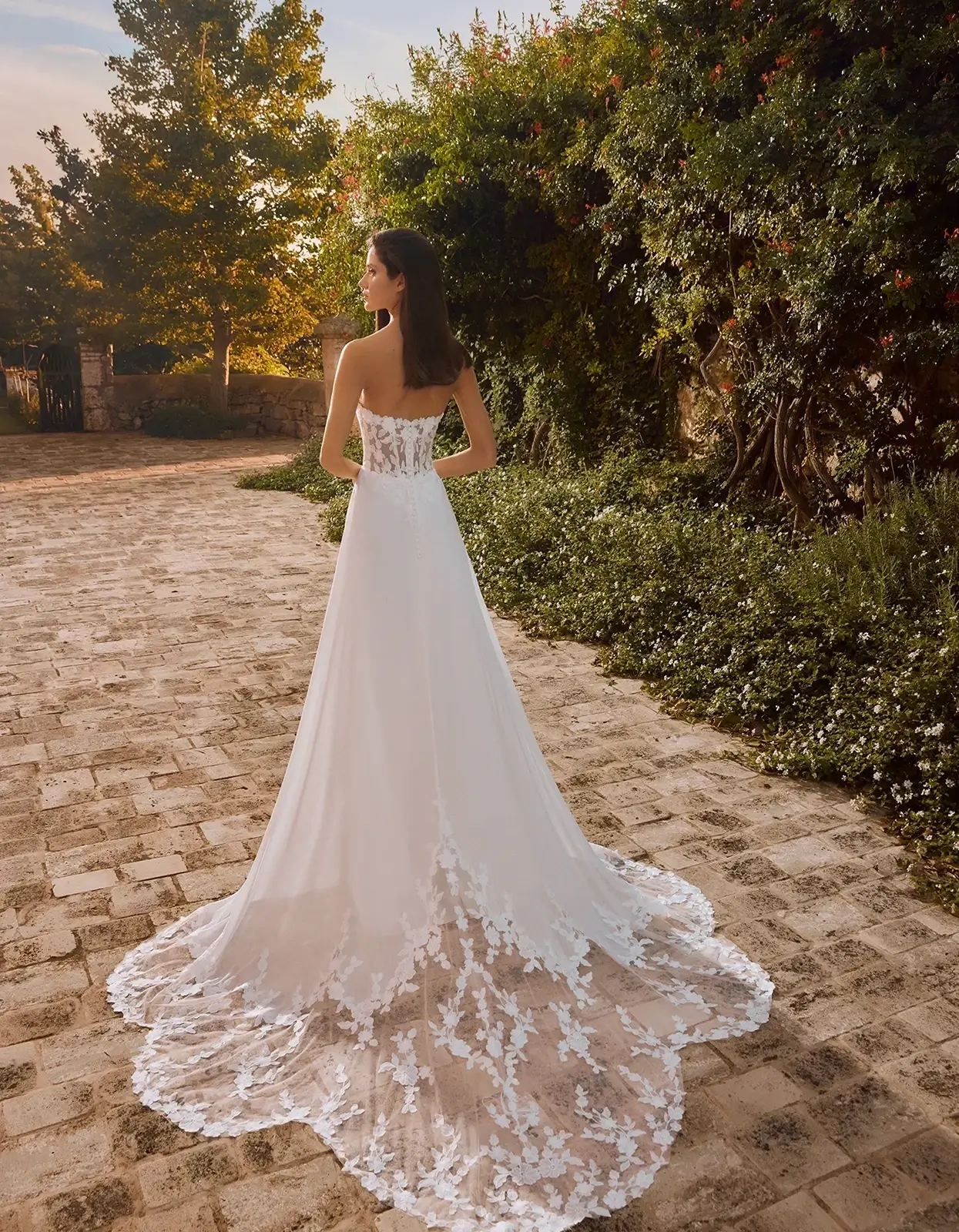 Vestido de línea A de estilo romántico que combina cuerpo corsé de encaje sobre falda de gasa con cola de encajes y chaqueta de encaje de manga larga extraíble que da efecto doble look.