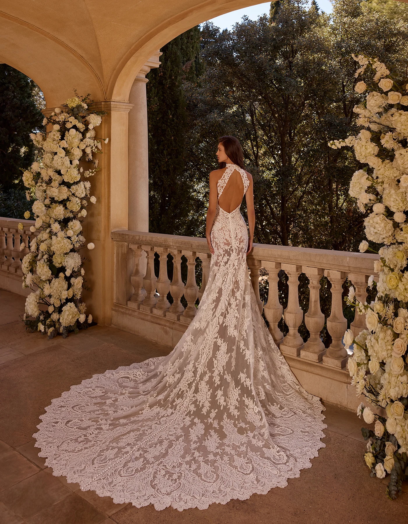 Vestido de novia sirena, de estilo romántico y clásico, presenta un escote halter, confeccionado íntegramente en delicadas aplicaciones de encaje rebrodé y pedrería bordada, que crea una delicada transparencia en la falda.