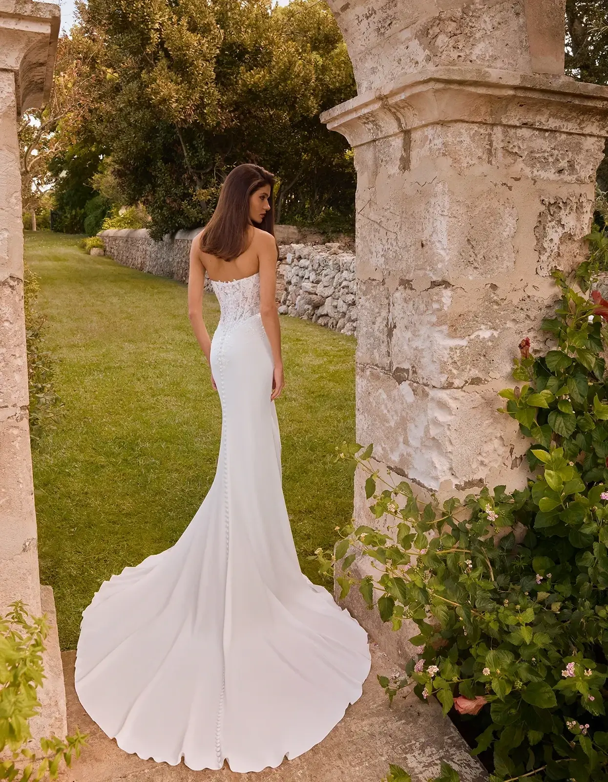 Vestido de sirena de estilo moderno que combia un cuerpo corsé confeccionado con aplicaciones de encaje sobre una falda de crepe.