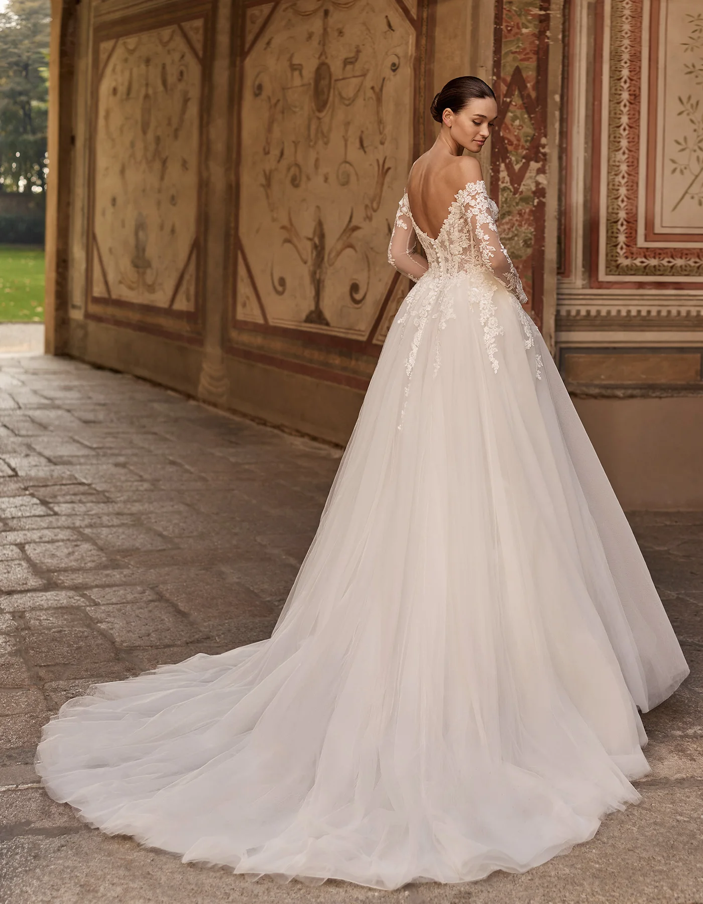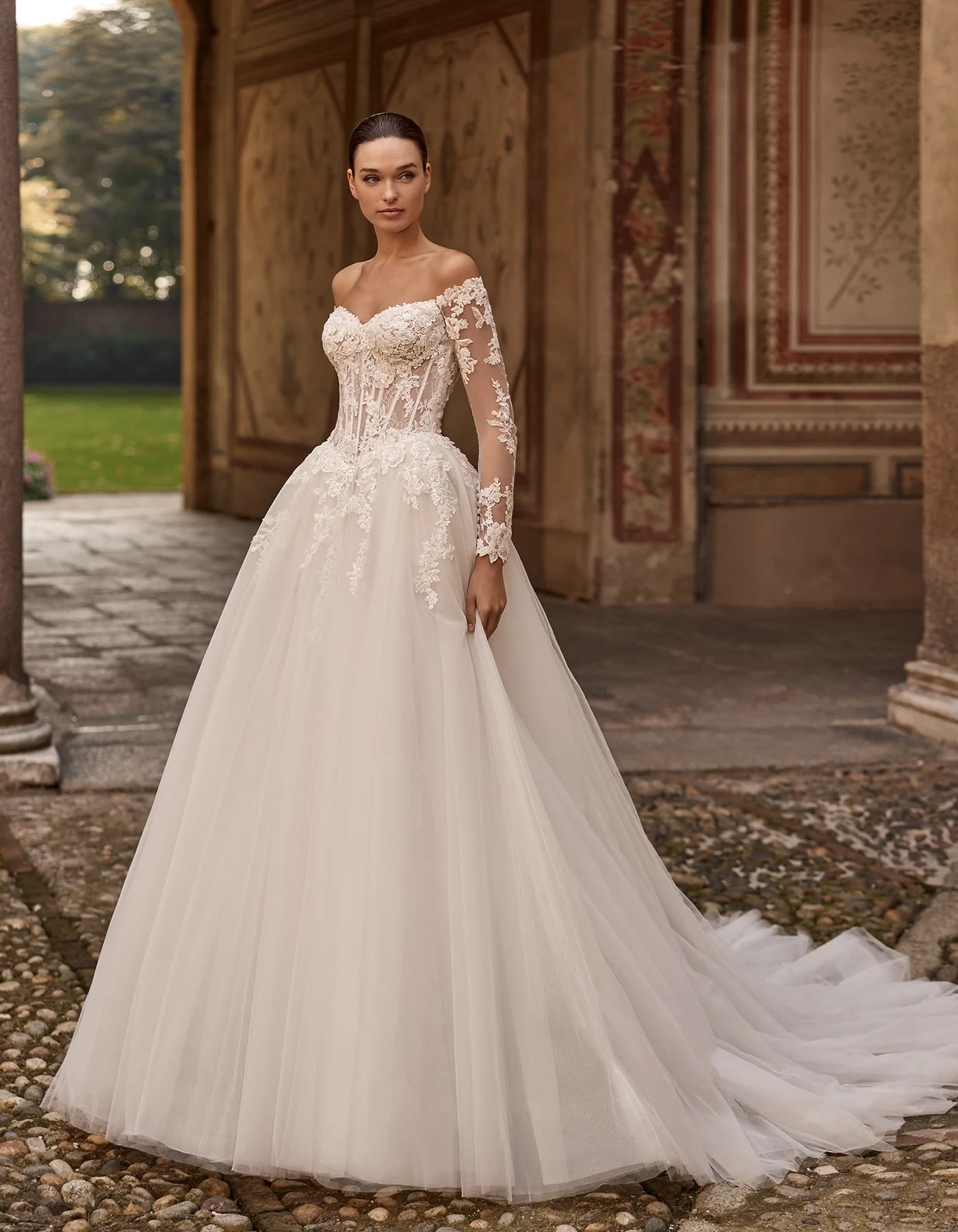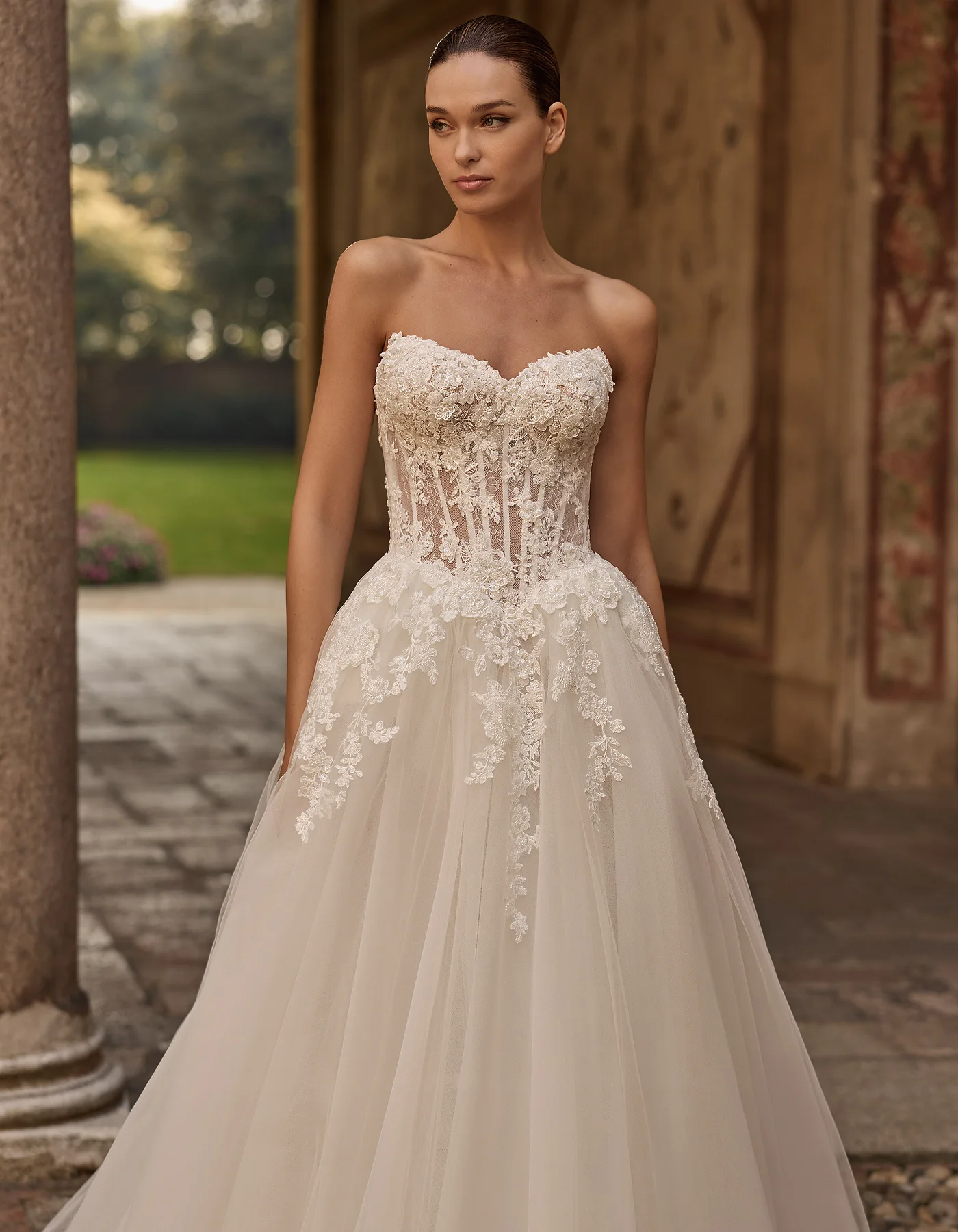 Vestido de novia princesa de estilo romántico. Presenta un cuerpo corsé estructurado con escote corazón elaborado con encaje y aplicaciones florales en 3D, sobre falda de tul con delicadas aplicaciones bordadas en pedrería. Lleva como complemento mangas de encaje formando un escote envolvente para crear un efecto doble look.