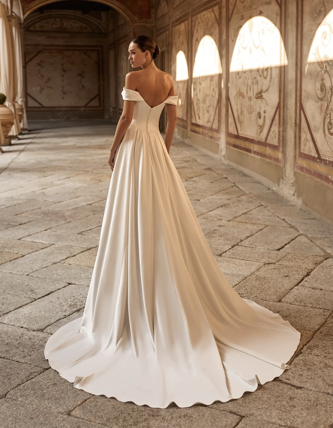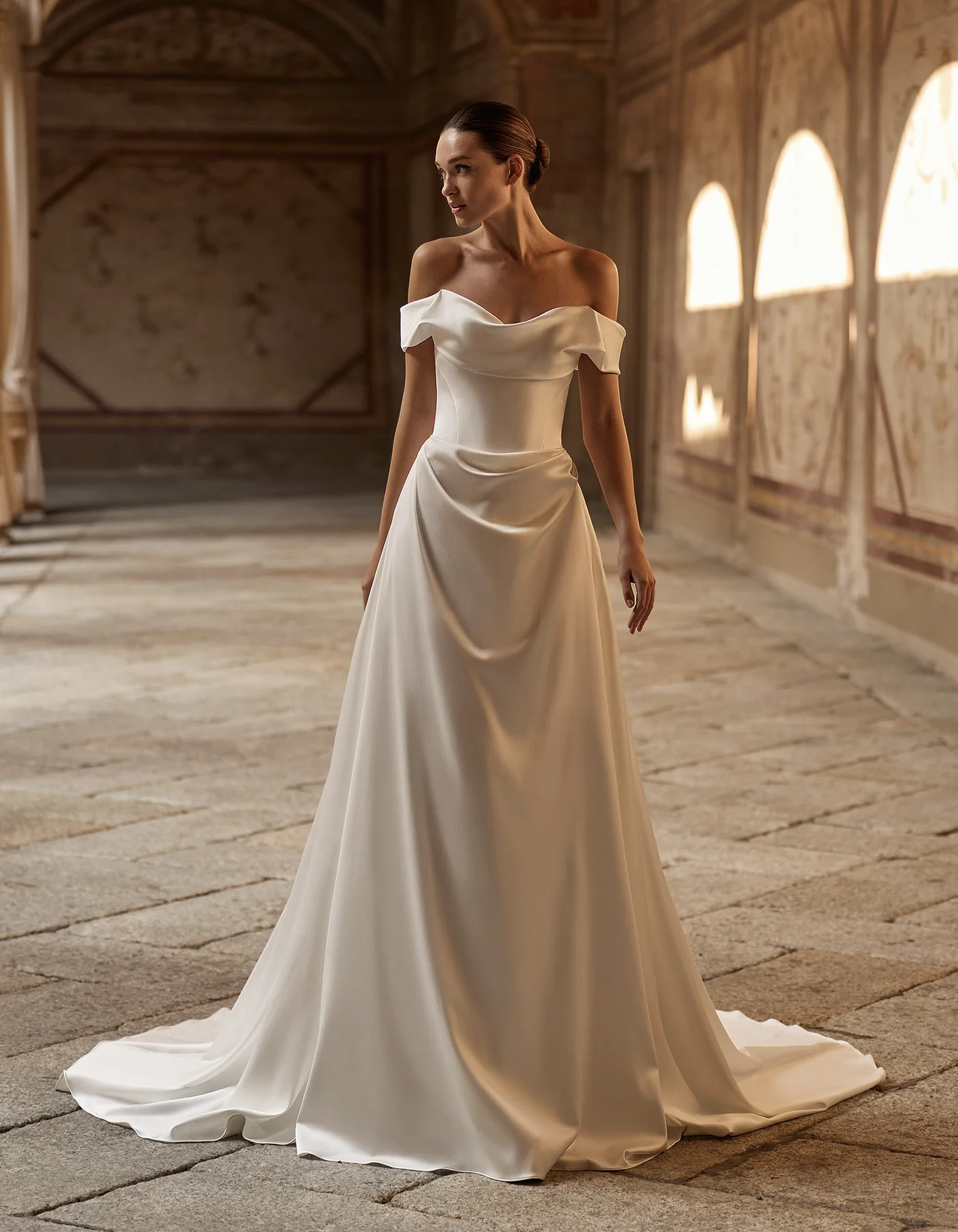 Vestido de novia línea A, de estilo moderno. Elaborado íntegramente en raso mórbido, con un cuerpo corsé estructurado de escote envolvente, sobre falda de volúmenes drapeados y espalda descubierta.