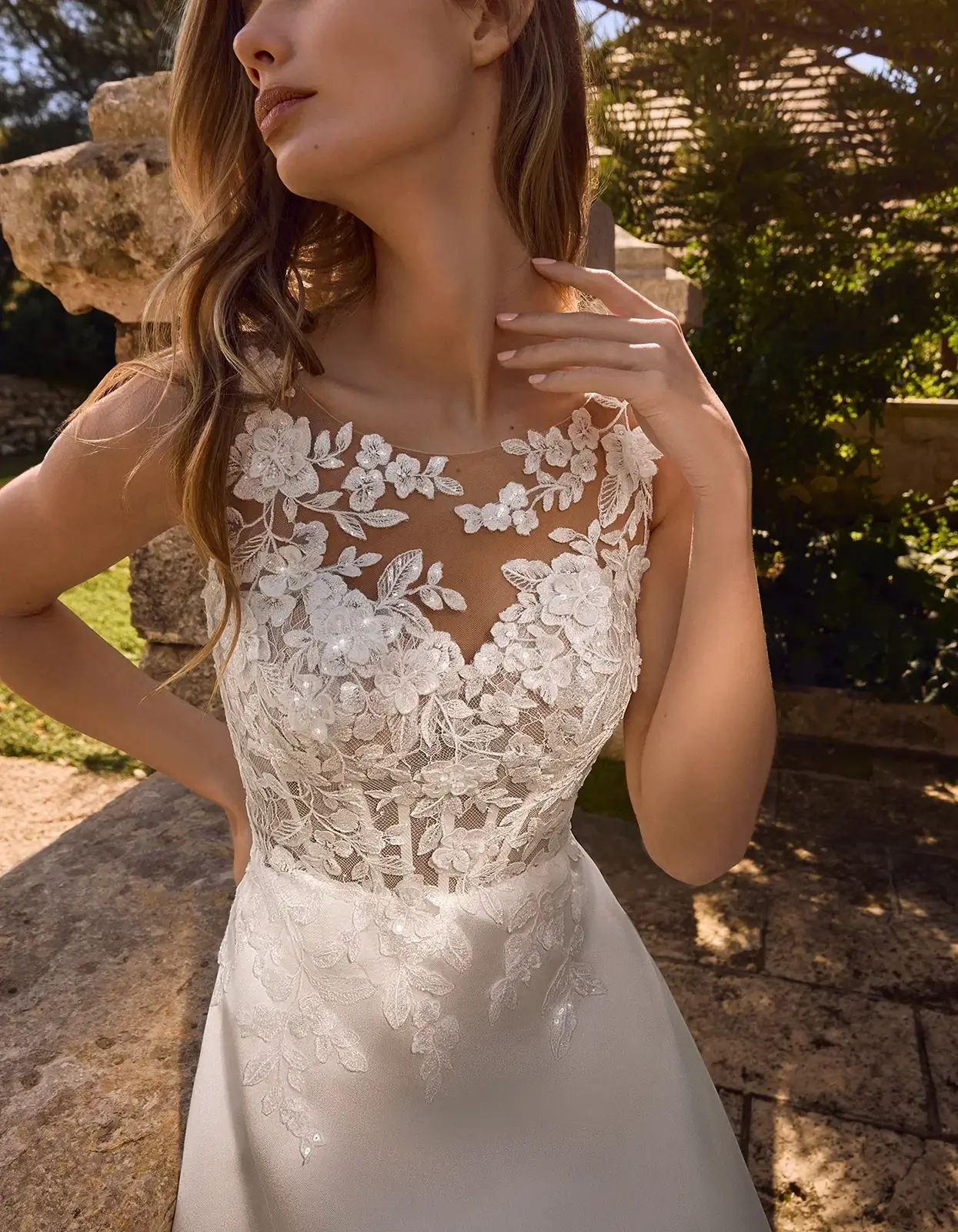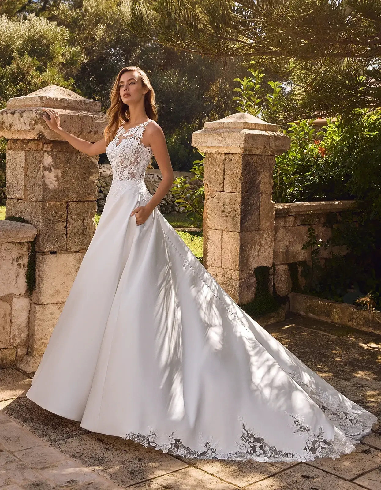 Vestido de línea A de estilo clásico que combina un cuerpo corsé con escote barco, confeccionado con delicadas aplicaciones de encaje sobre una falda de mikado.