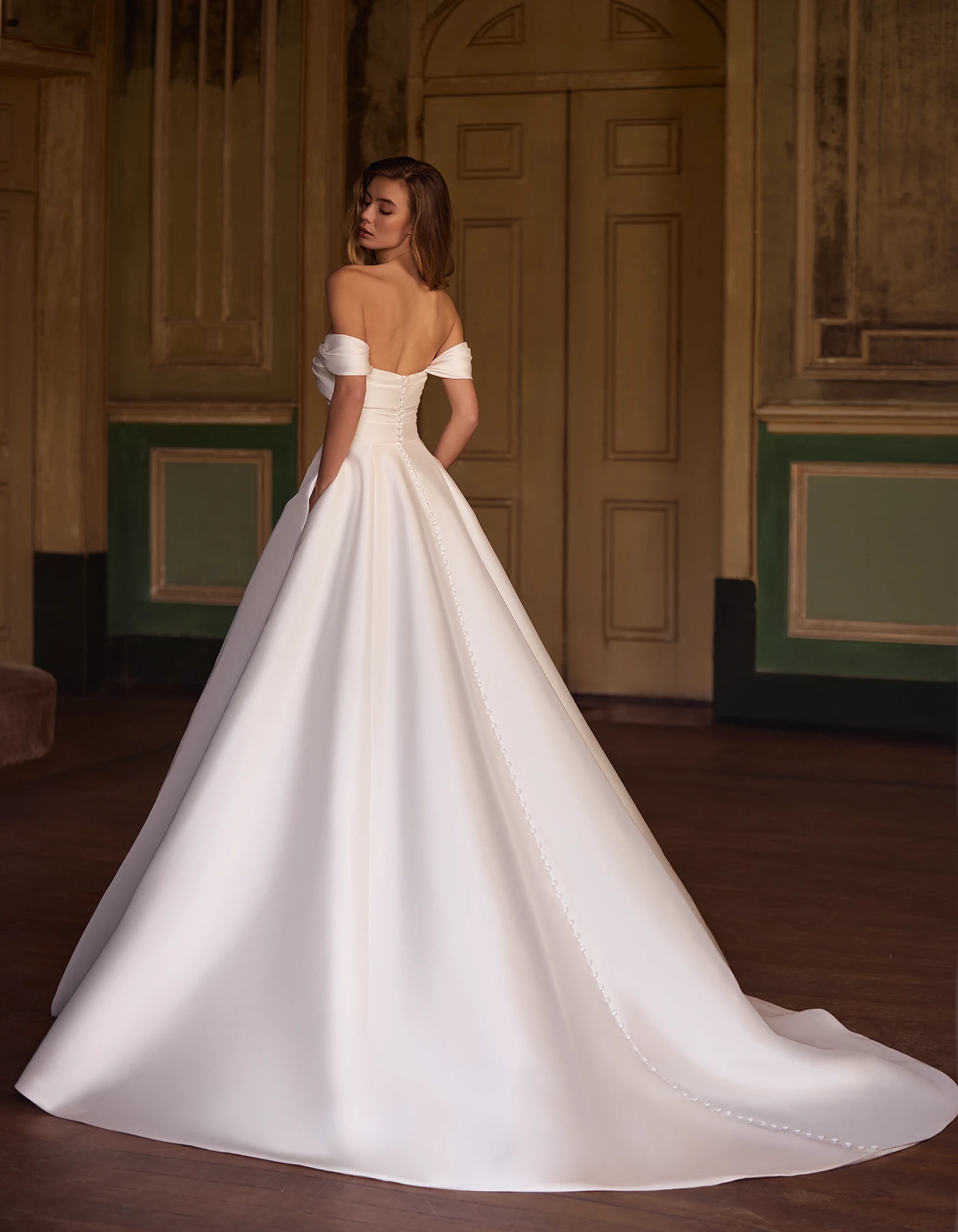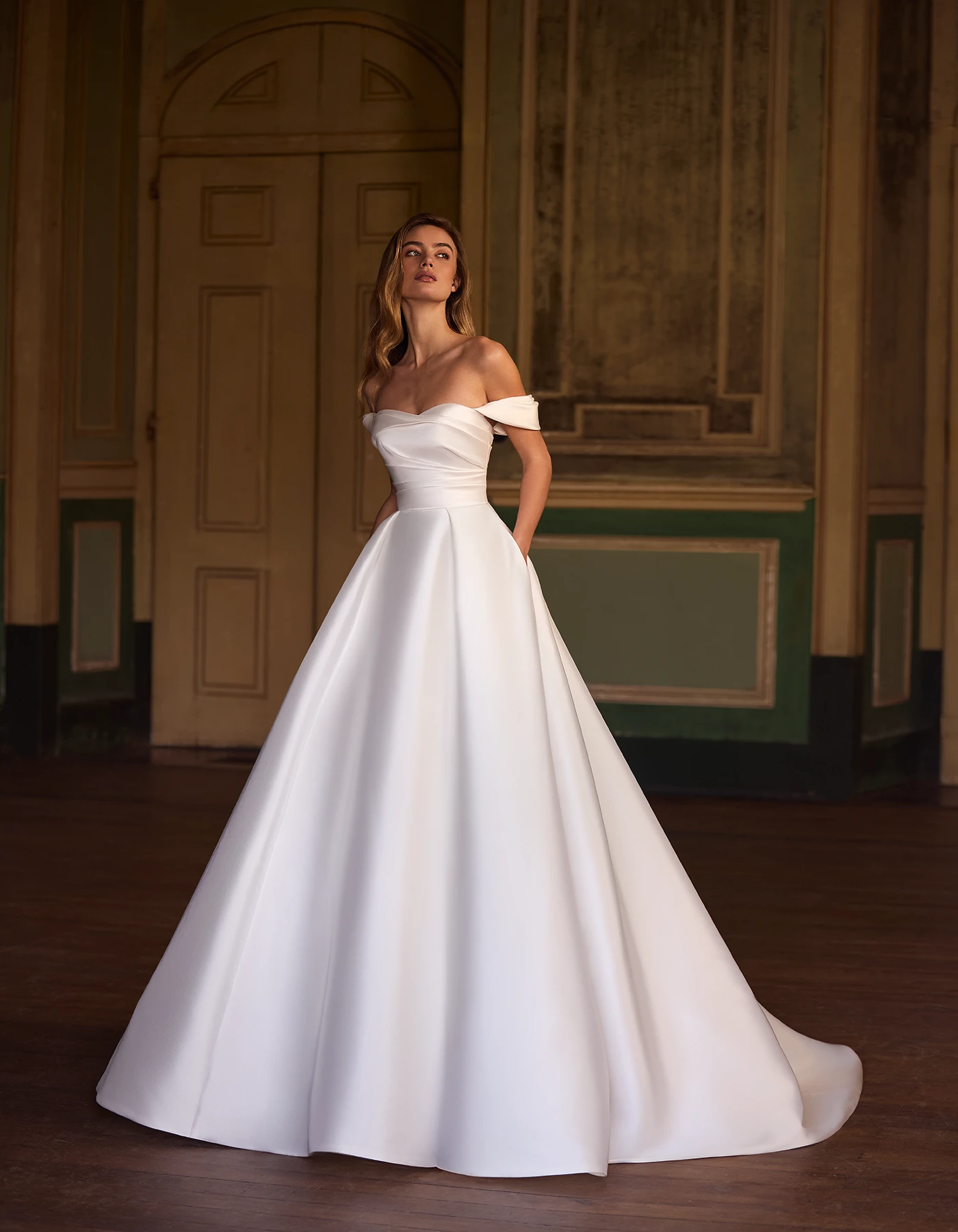 Vestido de novia princesa de estilo moderno elaborado íntegramente en mikado. Presenta un cuerpo delicadamente drapeado en escote bañera y espalda descubierta. Lleva como complemento mangas caídas extraíbles para un efecto doble look.