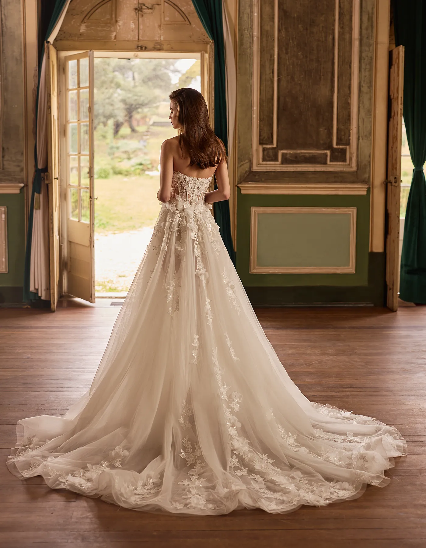 Vestido de novia de línea A de estilo romántico que combina un cuerpo corsé estructurado confeccionado con delicadas aplicaciones de encaje y flores 3D sobre una falda de tul con una abertura en la pierna.