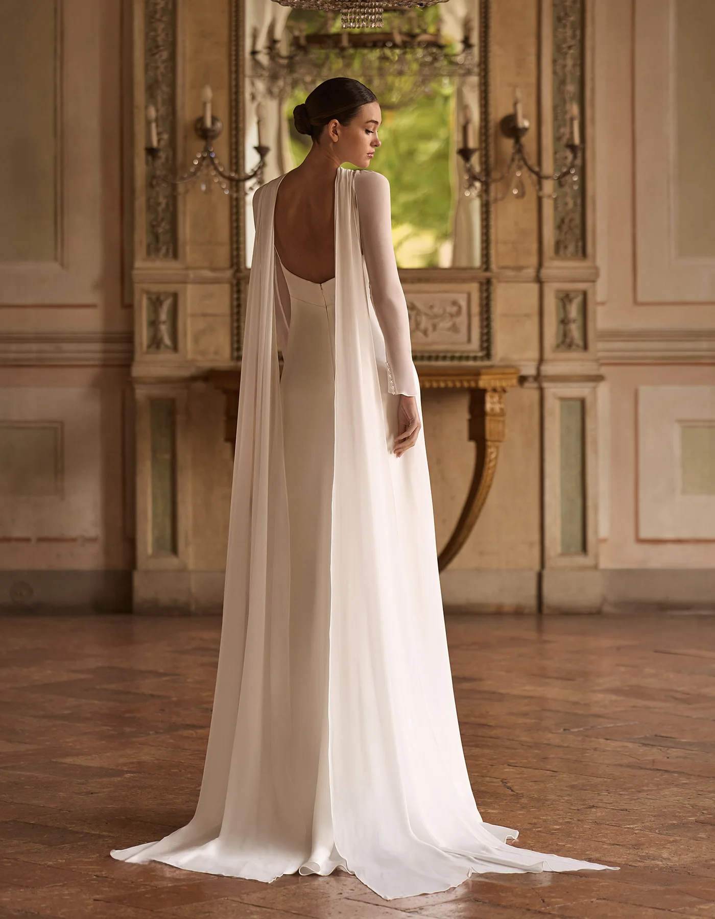 Vestido de novia sirena de estilo moderno. Vestido lencero íntegramente realizado en raso mórbido. Presenta un escote pico con tirantes. Tiene como complementos una chaqueta con mangas de escote cruzado en gasa sedosa o una chaqueta tipo ablusado de gasa sedosa, ambas extraíbles, que dan un efecto doble look.
