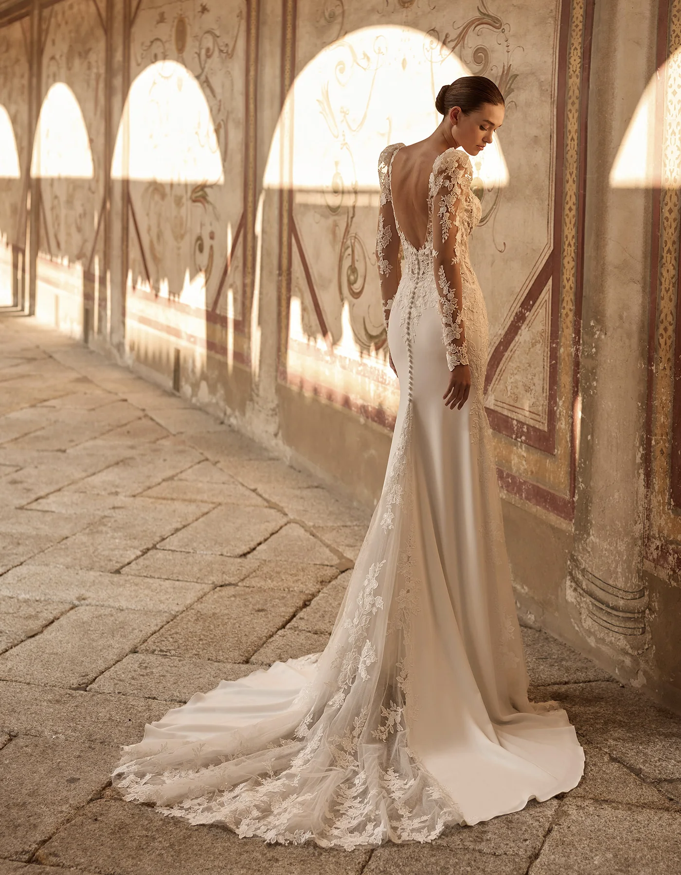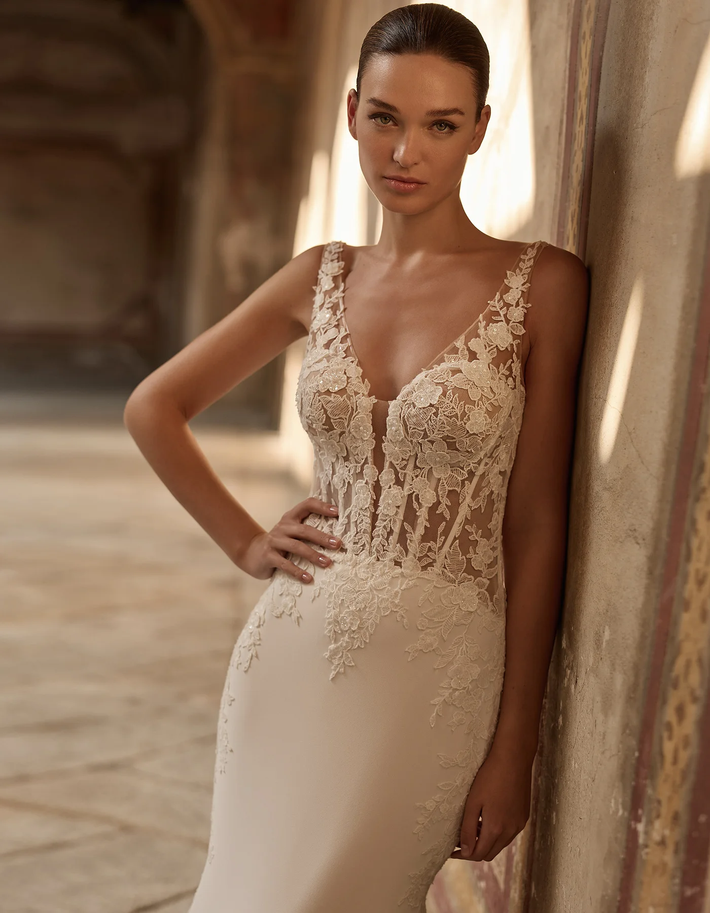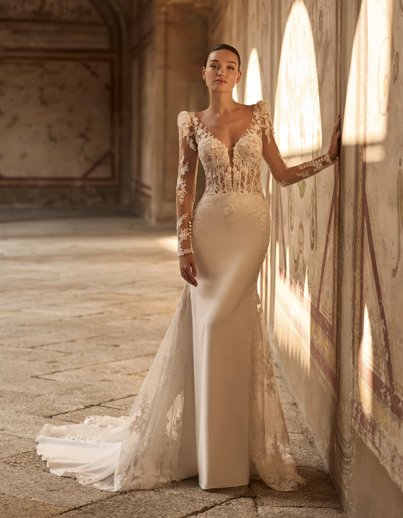 Vestido de novia sirena de estilo moderno que combina un cuerpo corsé estructurado, confeccionado con delicadas aplicaciones de encaje, sobre una falda de crepé. En la espalda presenta una inserción de encaje y transparencia que crea una delicada cola. Lleva como complemento mangas voluminosas extraíbles, que dan un efecto doble look.