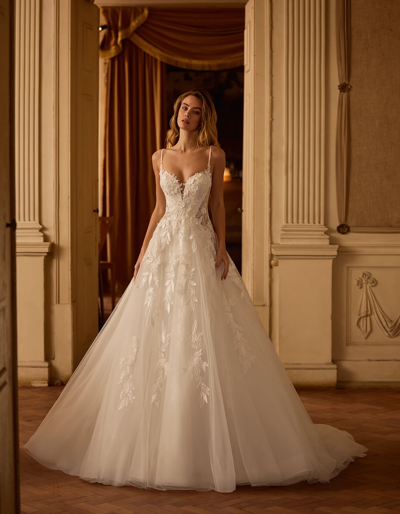 Vestido de novia de línea A de estilo romántico, confeccionado íntegramente en tul con delicadas aplicaciones de encaje floral y pedrería bordada. Presenta transparencias en los laterales del cuerpo realzando la figura.